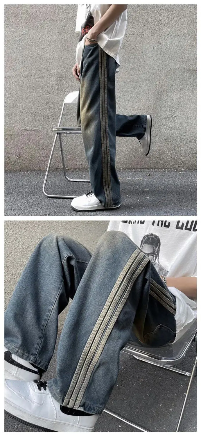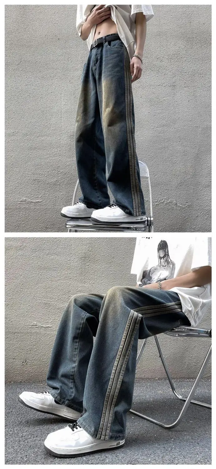 Advbridge High Street Washed and Worn Three Leg Jeans for Men Retro Streetwear Trendy Brand Rugged and Loose American Straight Leg Wide