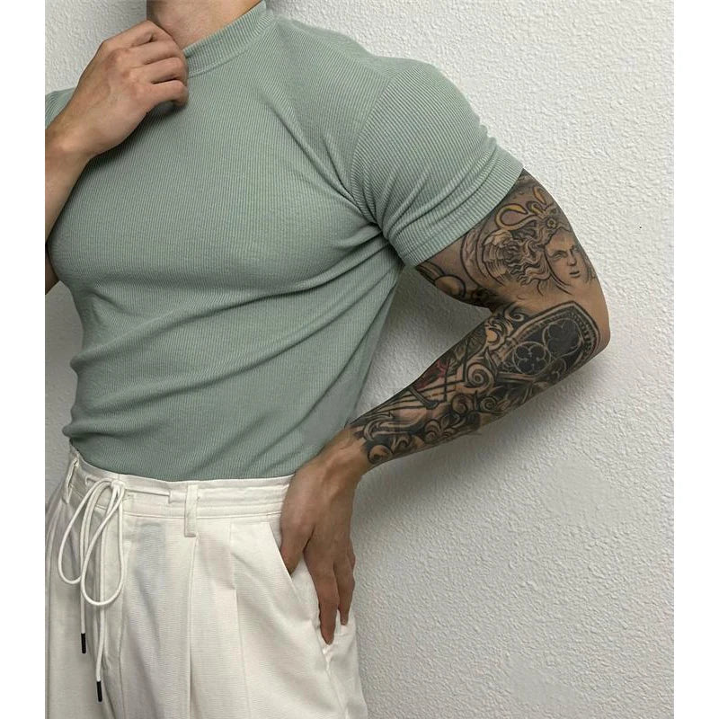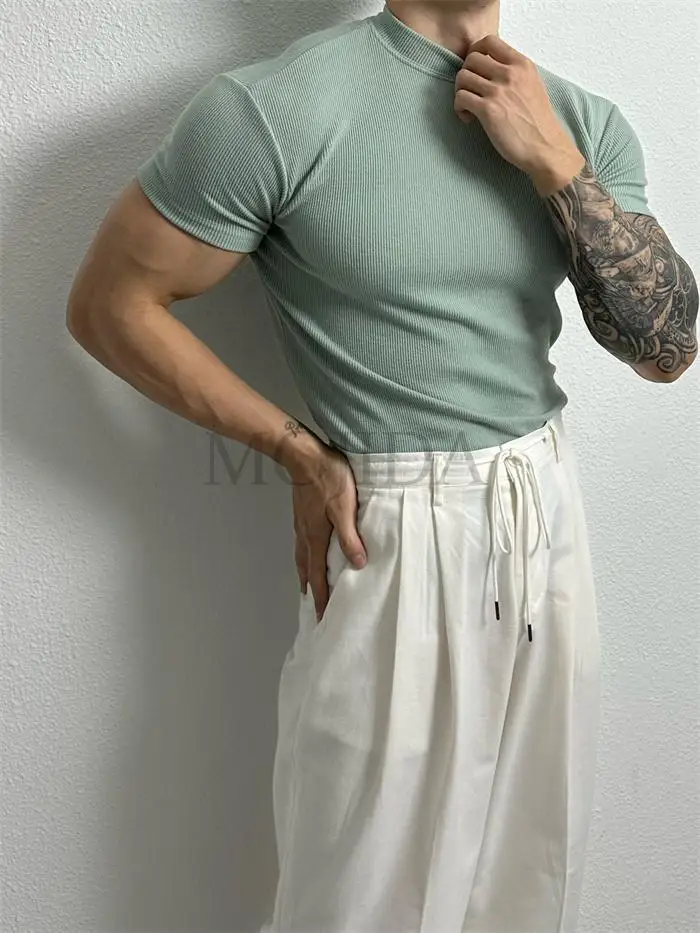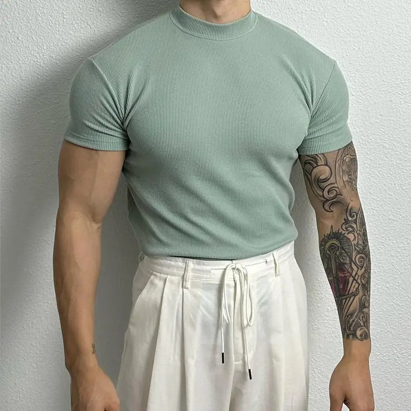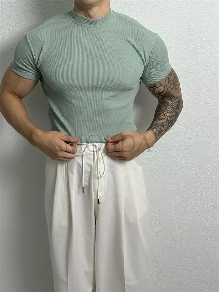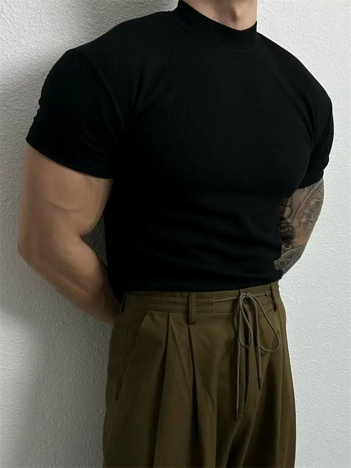 Advbridge Men Clothing Summer Short Sleeve Fitness Gym Training Tees Half High Collar Solid Skinny T-shirt Male Running Ribbed Basic Tops