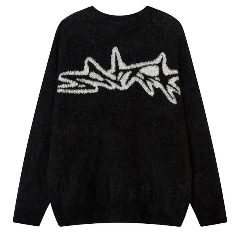 Men Hip Hop Streetwear Fluffy Knitted Sweater Pullover Letter Jacquard Fall Winter Autumn Harajuku Cotton Casual Pullover Black