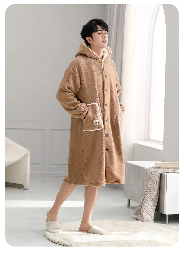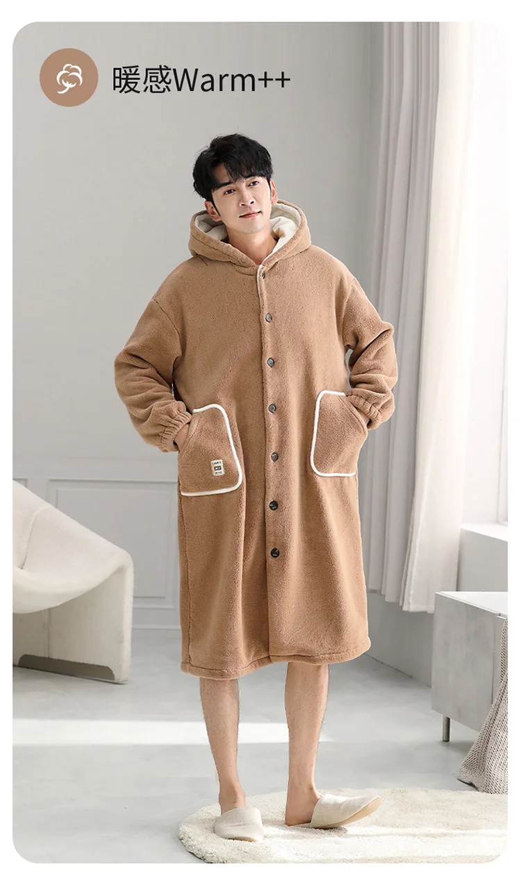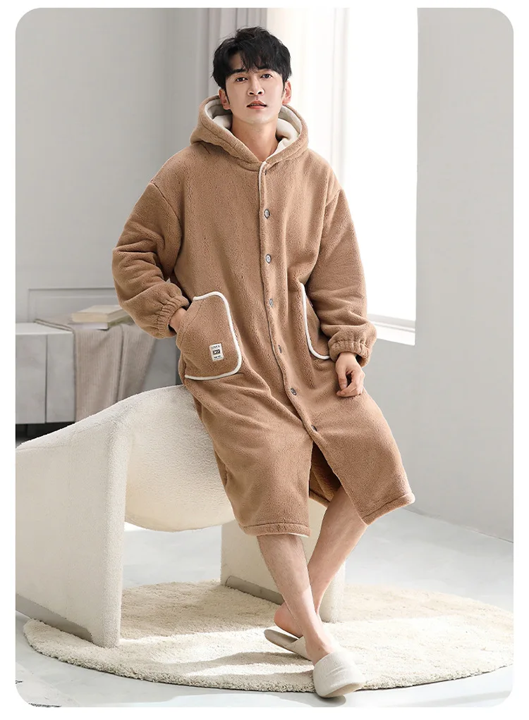 Advbridge Men Hooded Winter Sleepwear Thicken Flannel Warm Plush Shower Robe Japanese Style Solid Men's Bathrobe Soft Male Night Gown