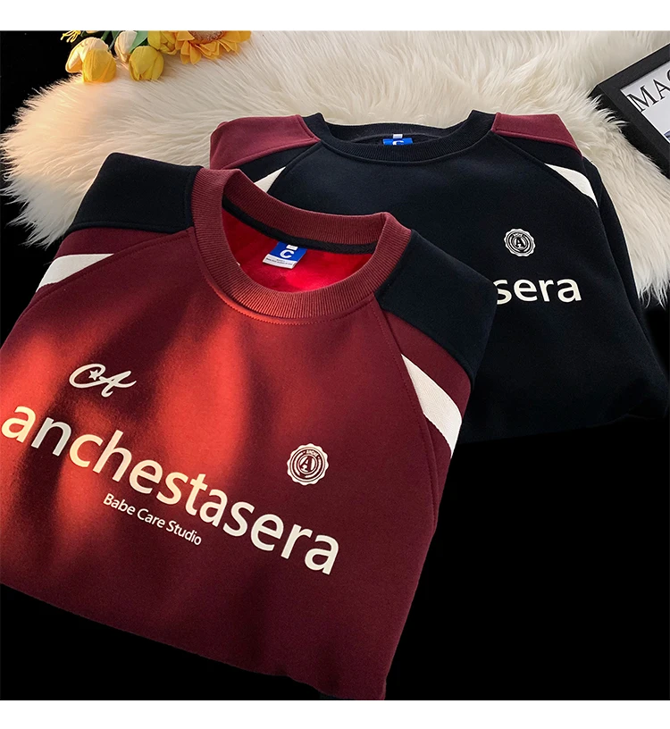 Advbridge Men‘s Wintern outfits Hip Hop Loose Fit Men's Sweatshirt Burgundy Patchwork Couple's Outfit 2024 Fall New Hipster Biker Style Sweatshirt