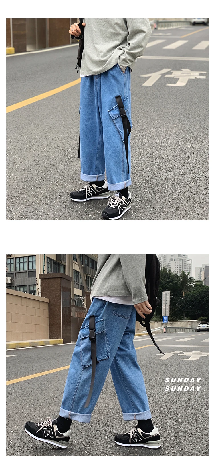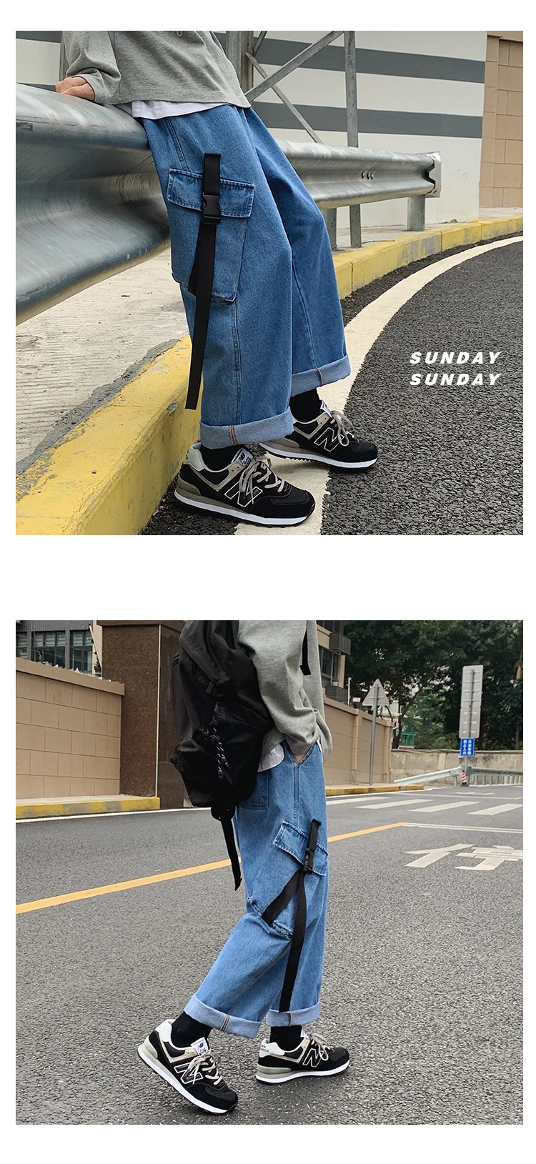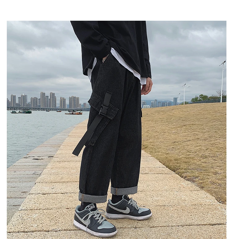 Advbridge Men's Casual Baggy Denim Trousers High Street Hip Hop Pure Color Jeans Elastic Waist Both Side Pockets Long Ribbons Cargo Pants