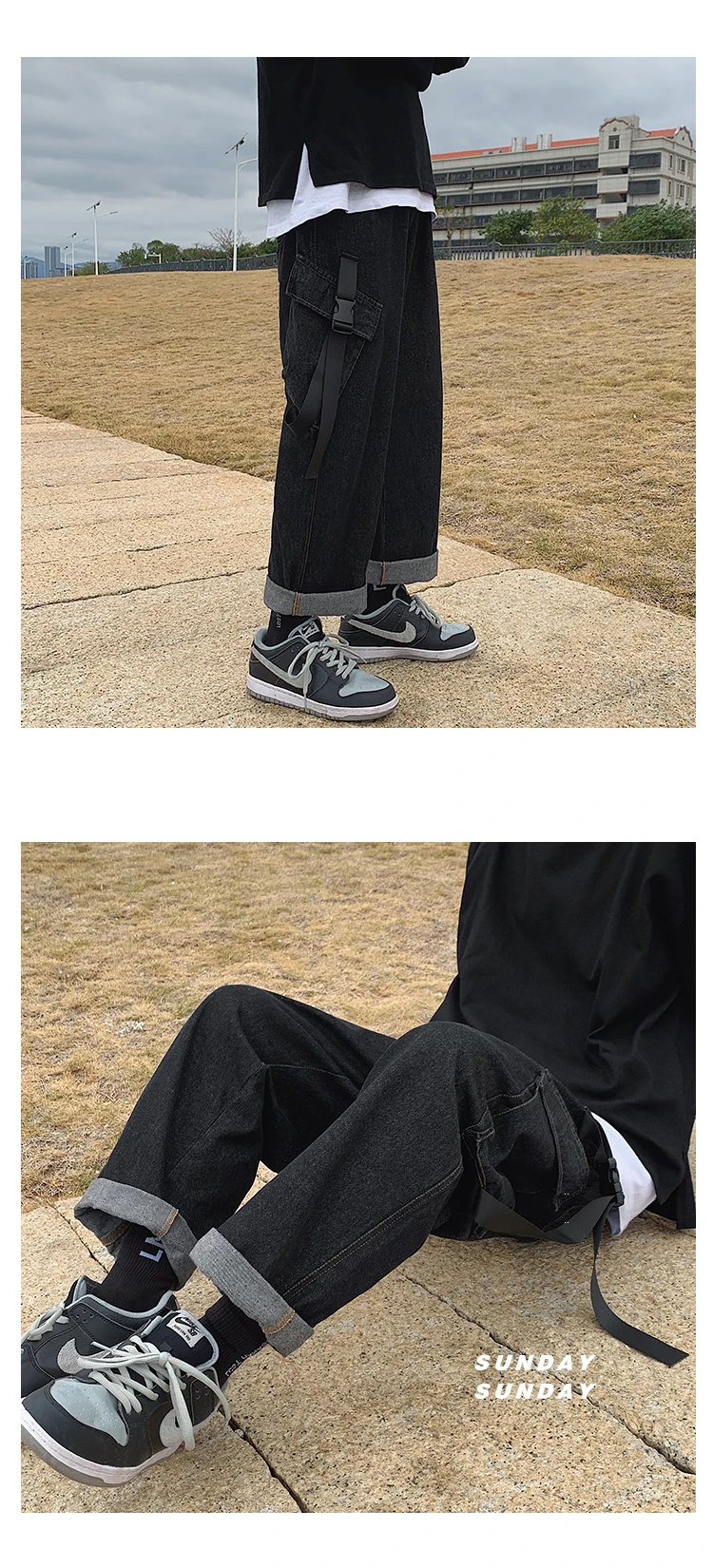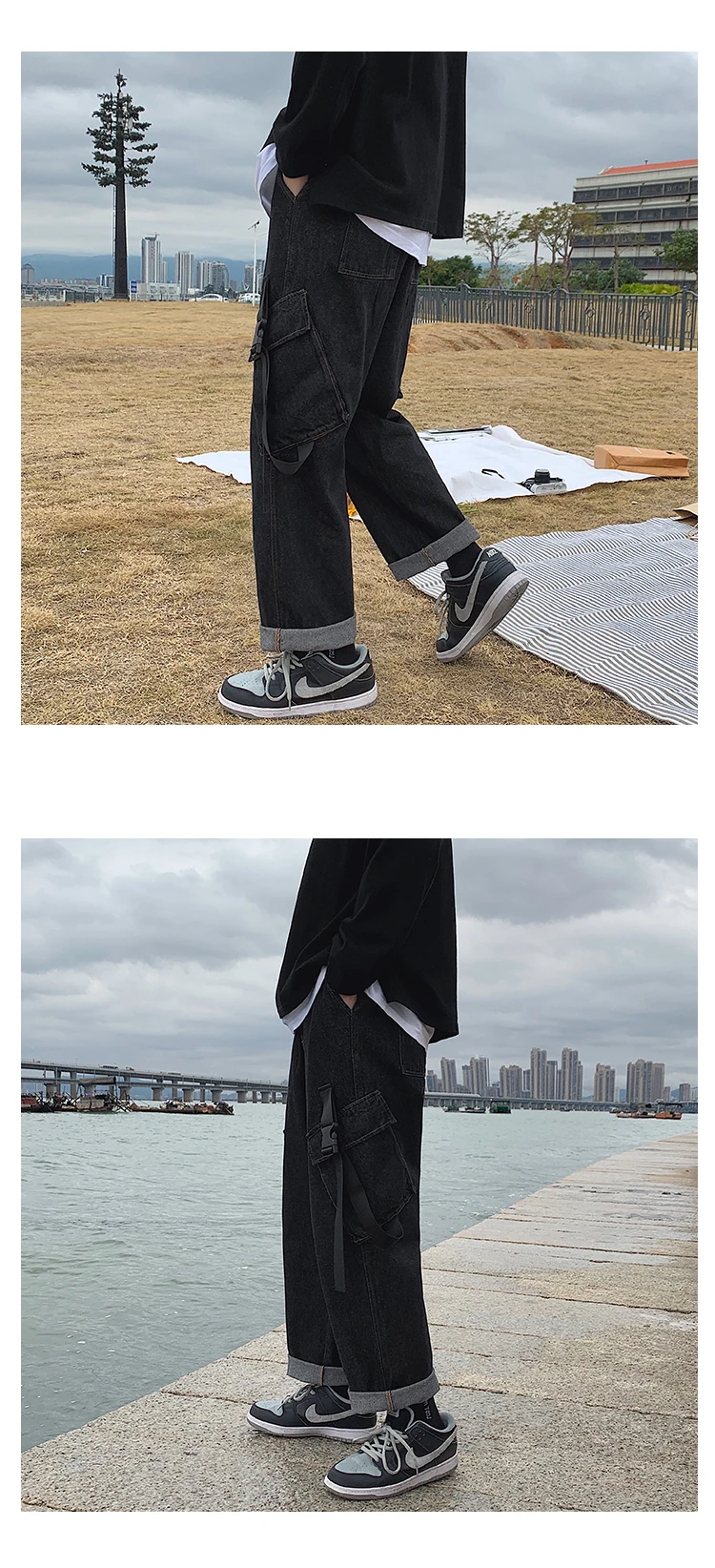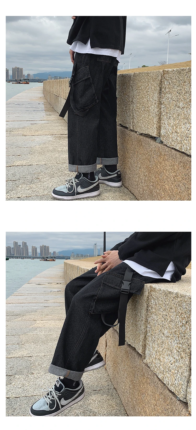 Advbridge Men's Casual Baggy Denim Trousers High Street Hip Hop Pure Color Jeans Elastic Waist Both Side Pockets Long Ribbons Cargo Pants