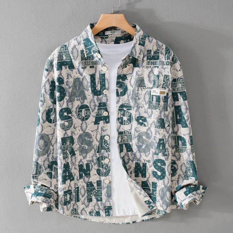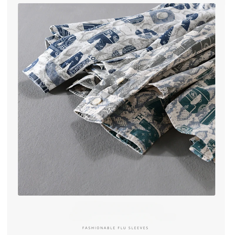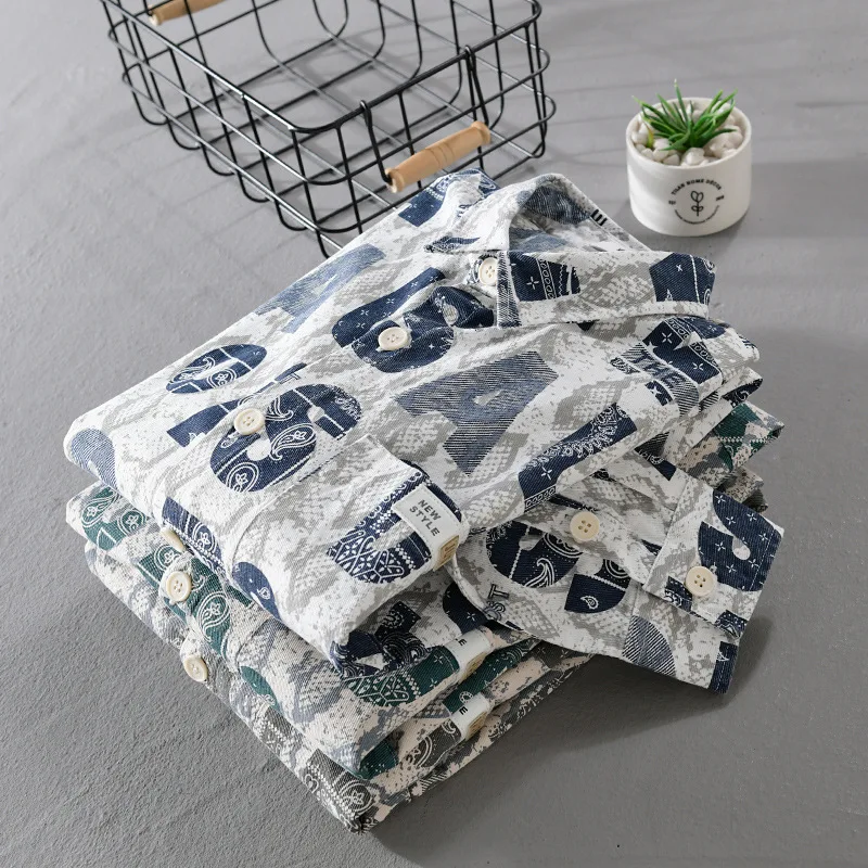 Advbridge Men's Clothing Printed Cotton and Linen Shirt, Trendy Casual Loose Fashion Young Men's Shirt, Minimalist Long Sleeve, Camping