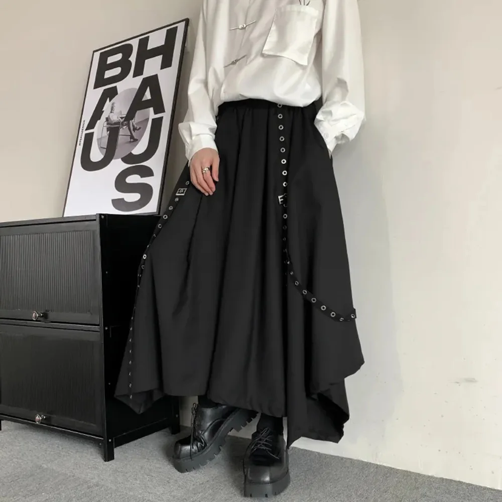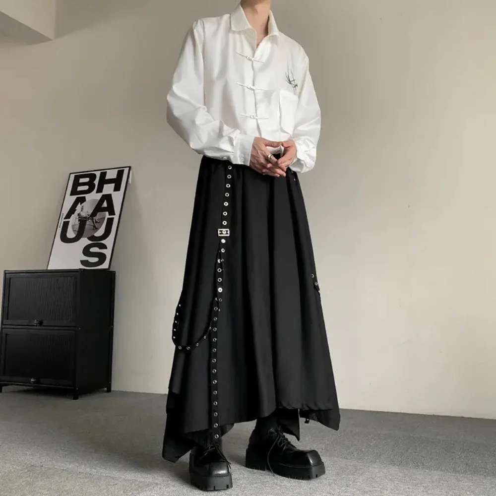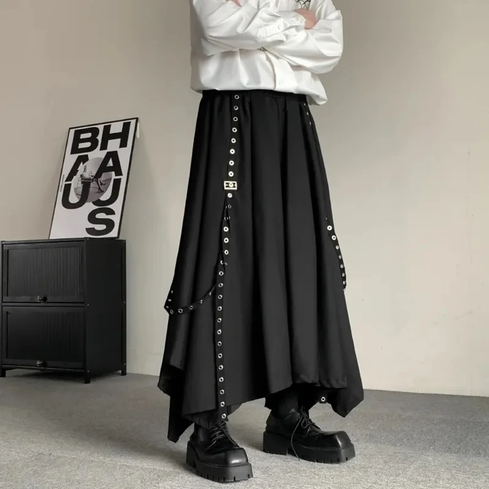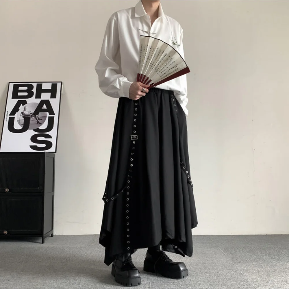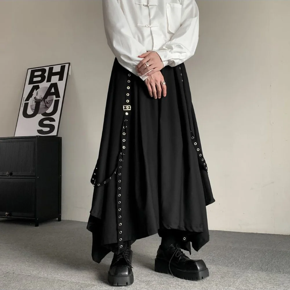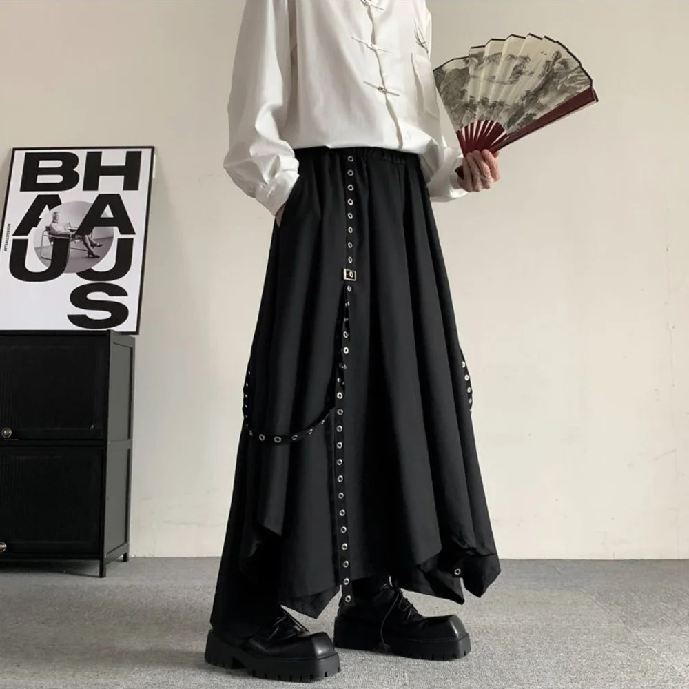 Advbridge Mens Gothic Rope Belt Decorated Irregular Skirt Pants Genderless Fashion Japanese Style Niche Dark Samurai Pants Hakama Unisex