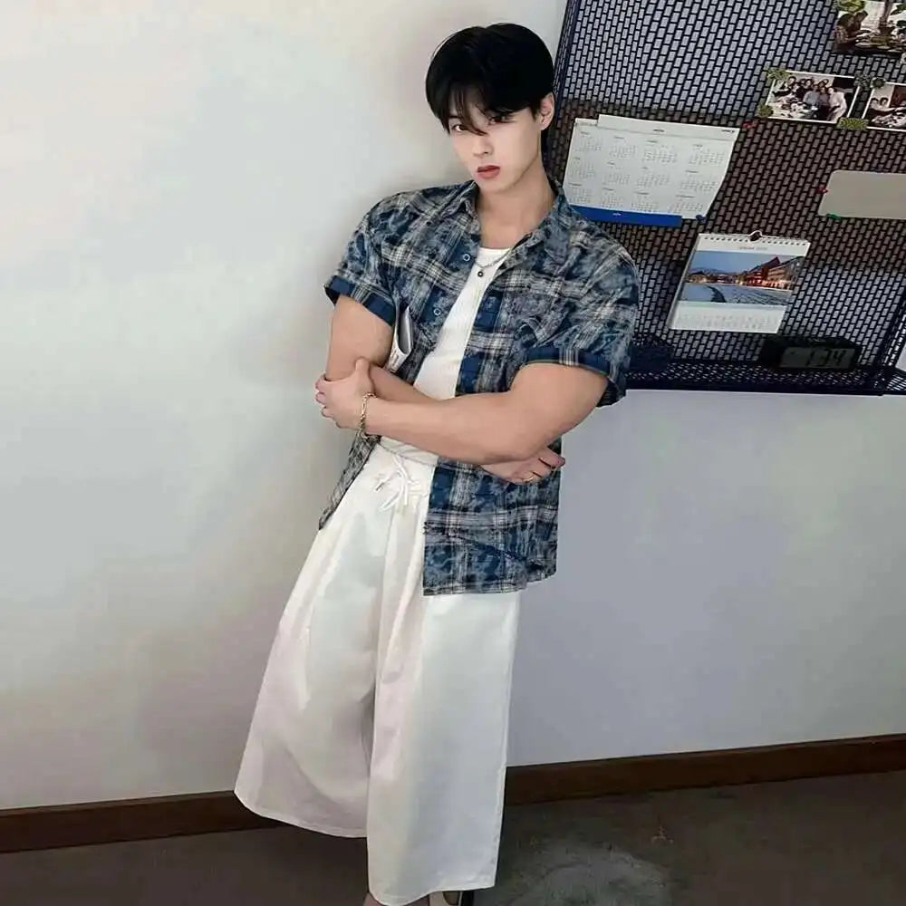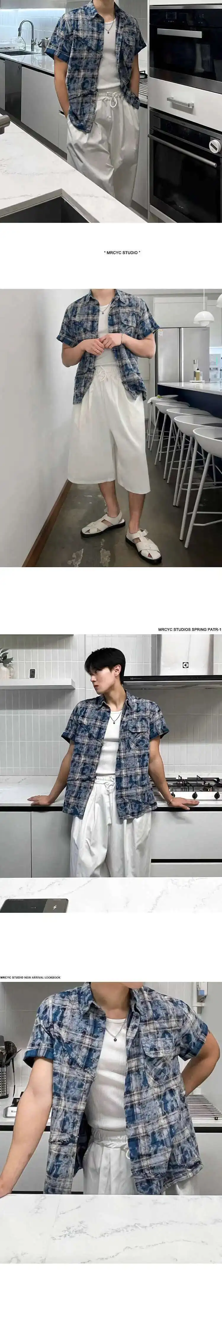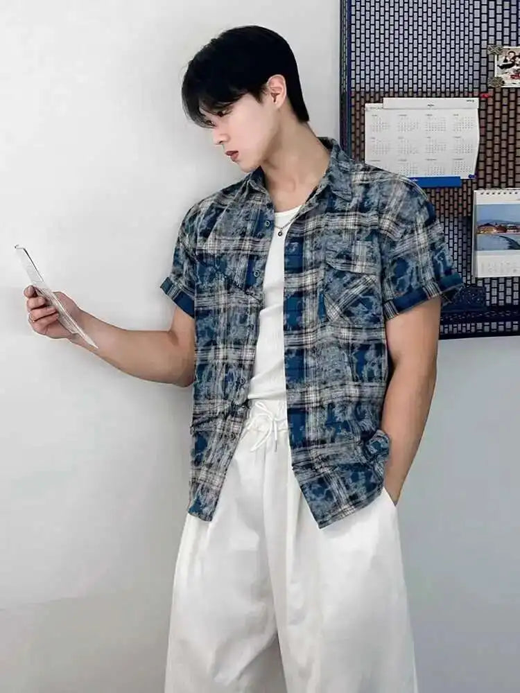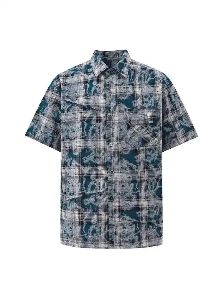 ADVBRIDGE - Men's Tie Dye Short Sleeve Shirts New 2025 Summer Loose Plaid Korean Turn-down Collar Trendy Male Clothing Loose Fiting