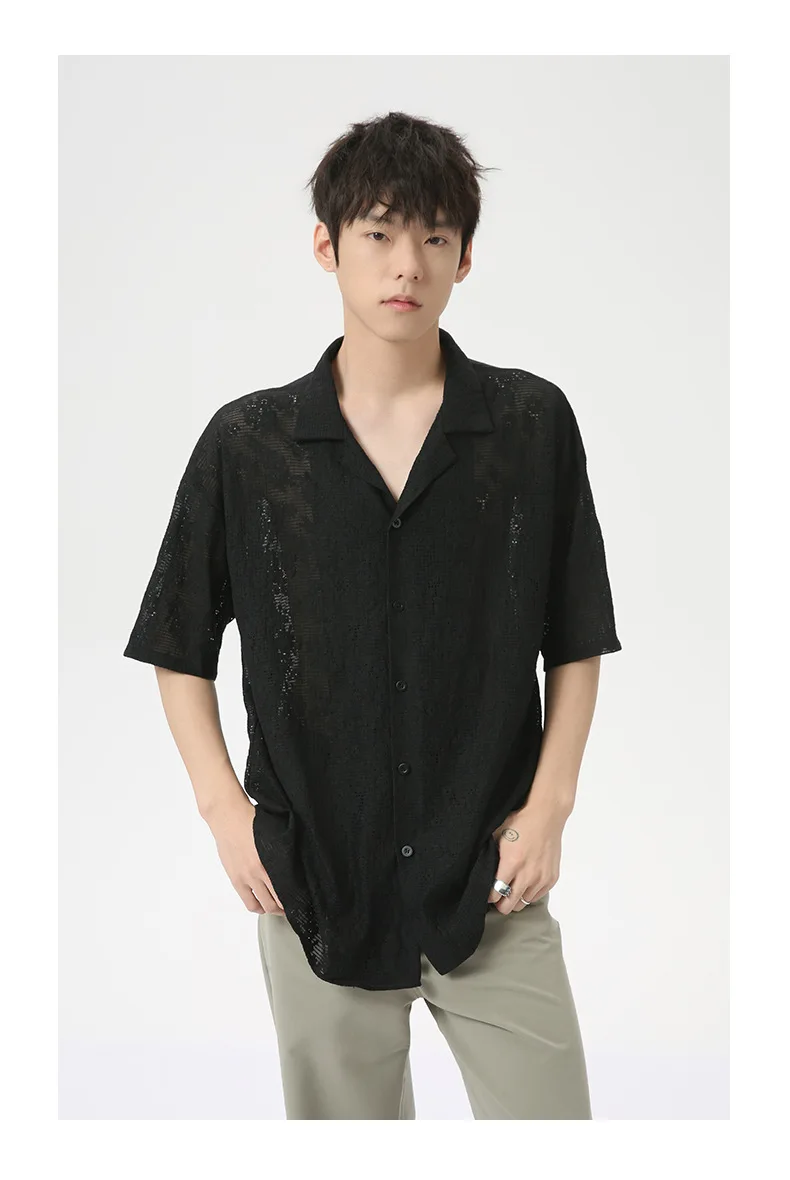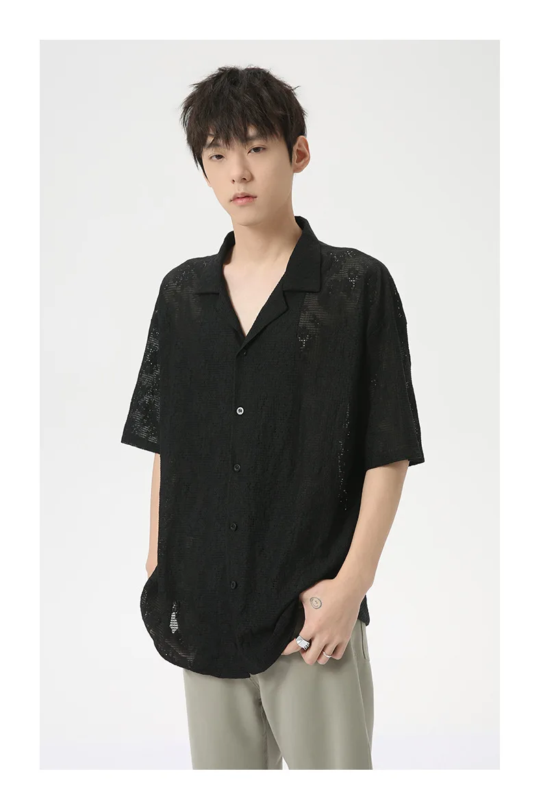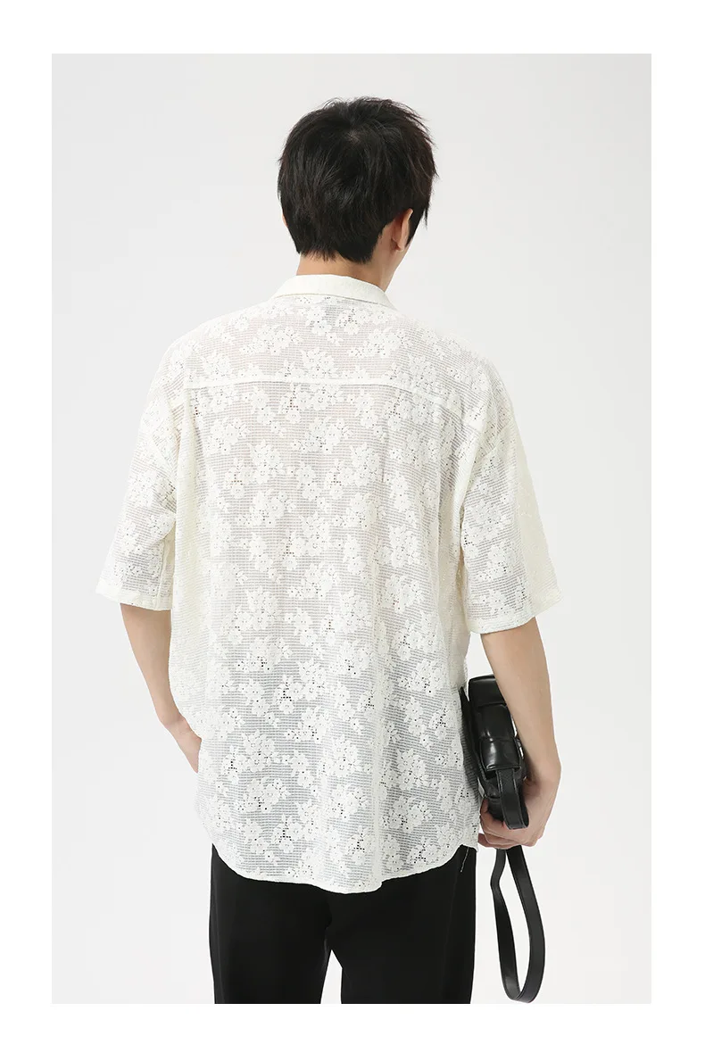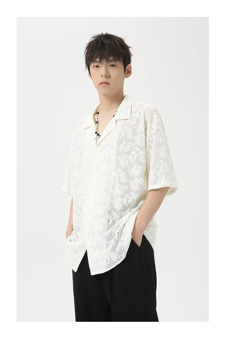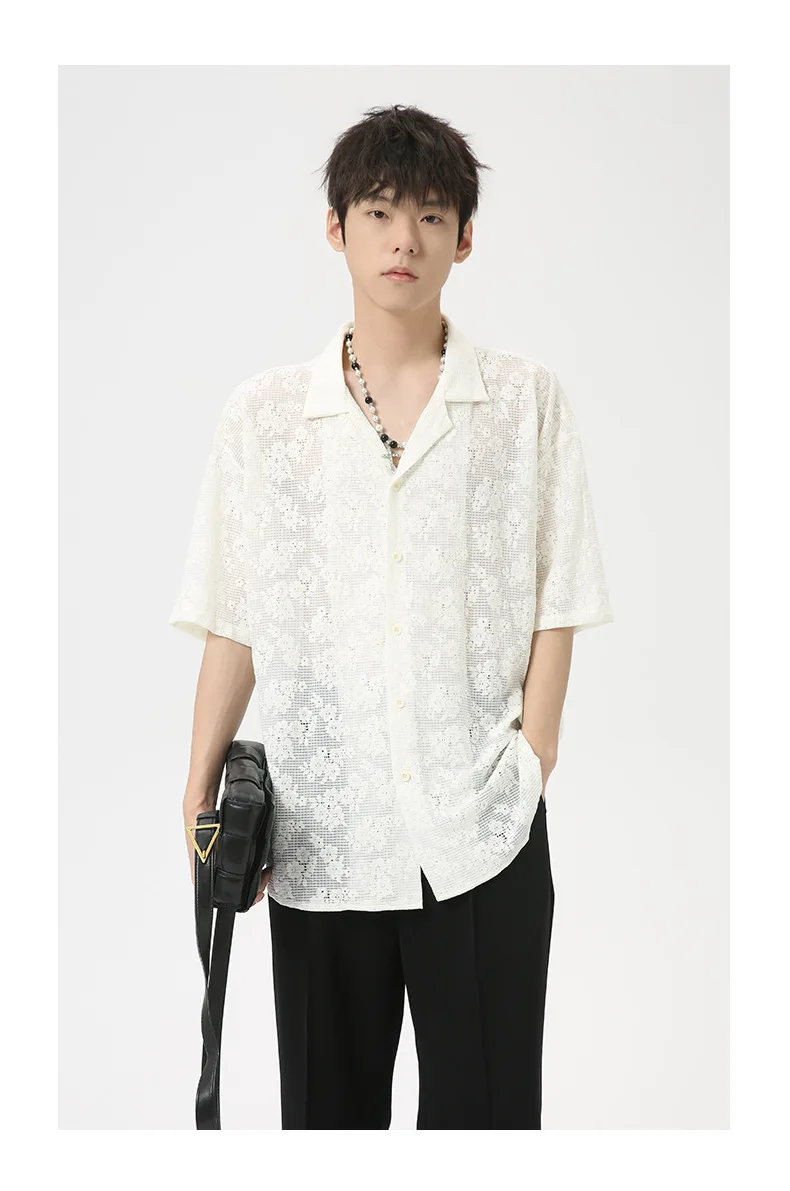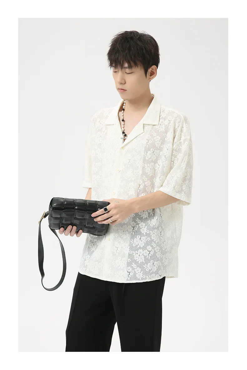Advbridge Men's Wear 2024 Summer Flower Embroidery Hollow Out Cuban Collar Shirts Top Trendy Korean Streetwear Short Sleeve Shirt
