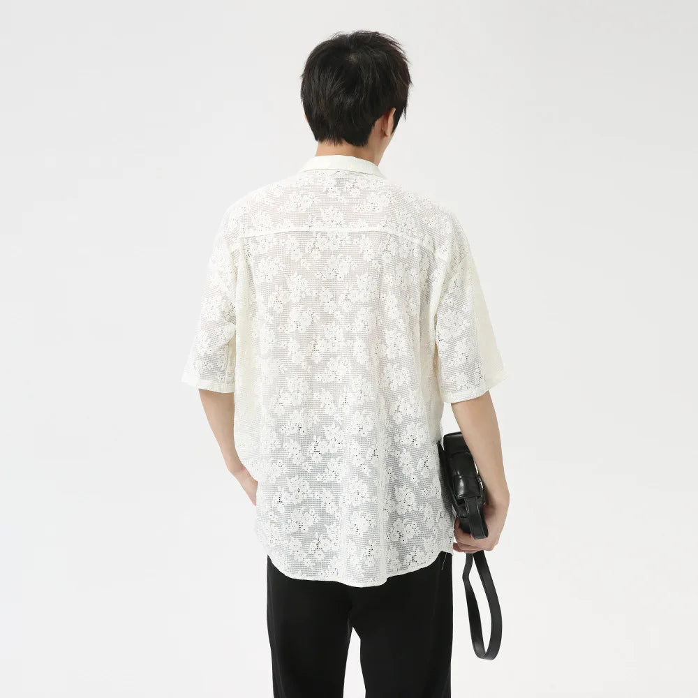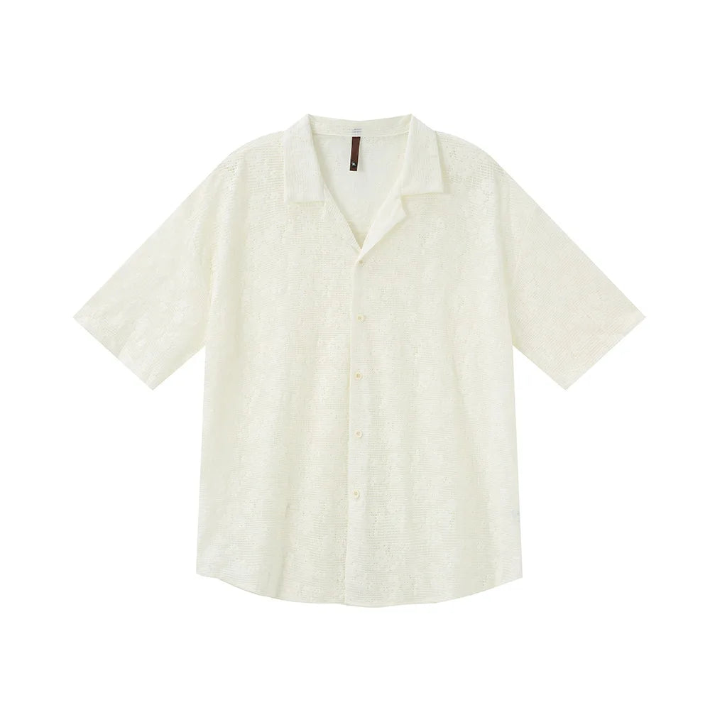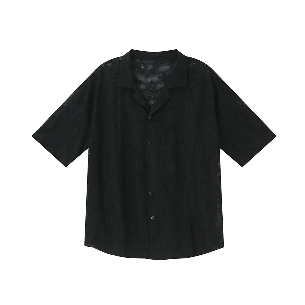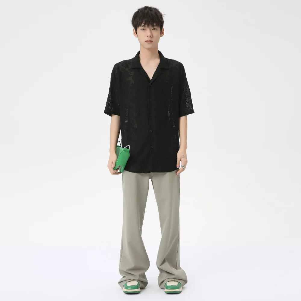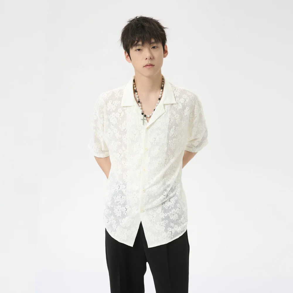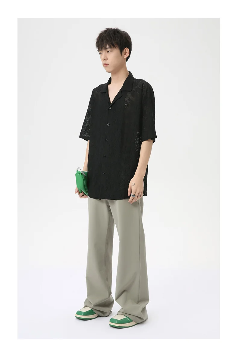 Advbridge Men's Wear 2024 Summer Flower Embroidery Hollow Out Cuban Collar Shirts Top Trendy Korean Streetwear Short Sleeve Shirt
