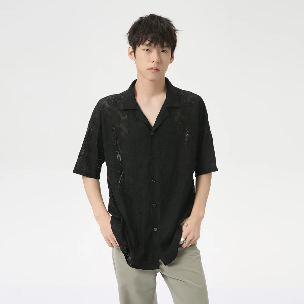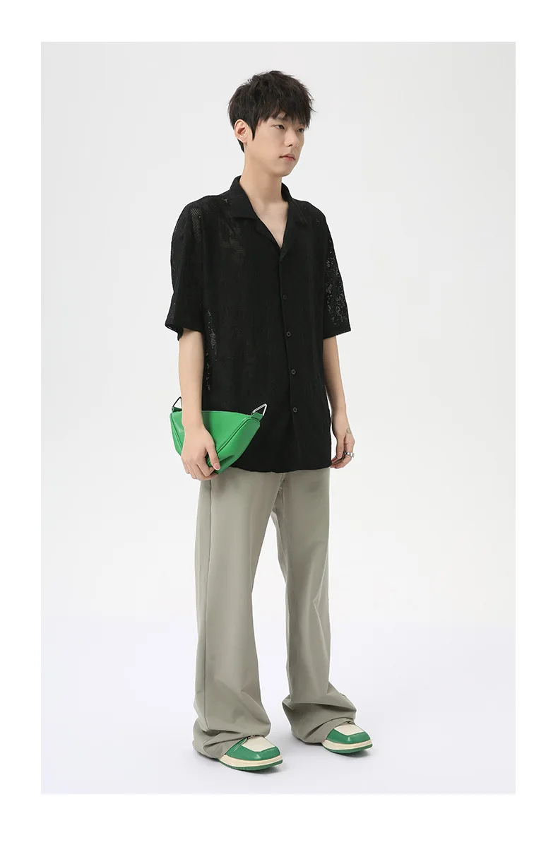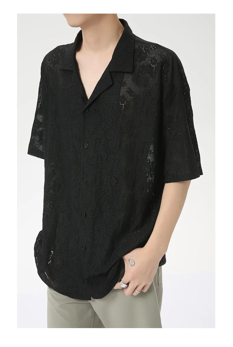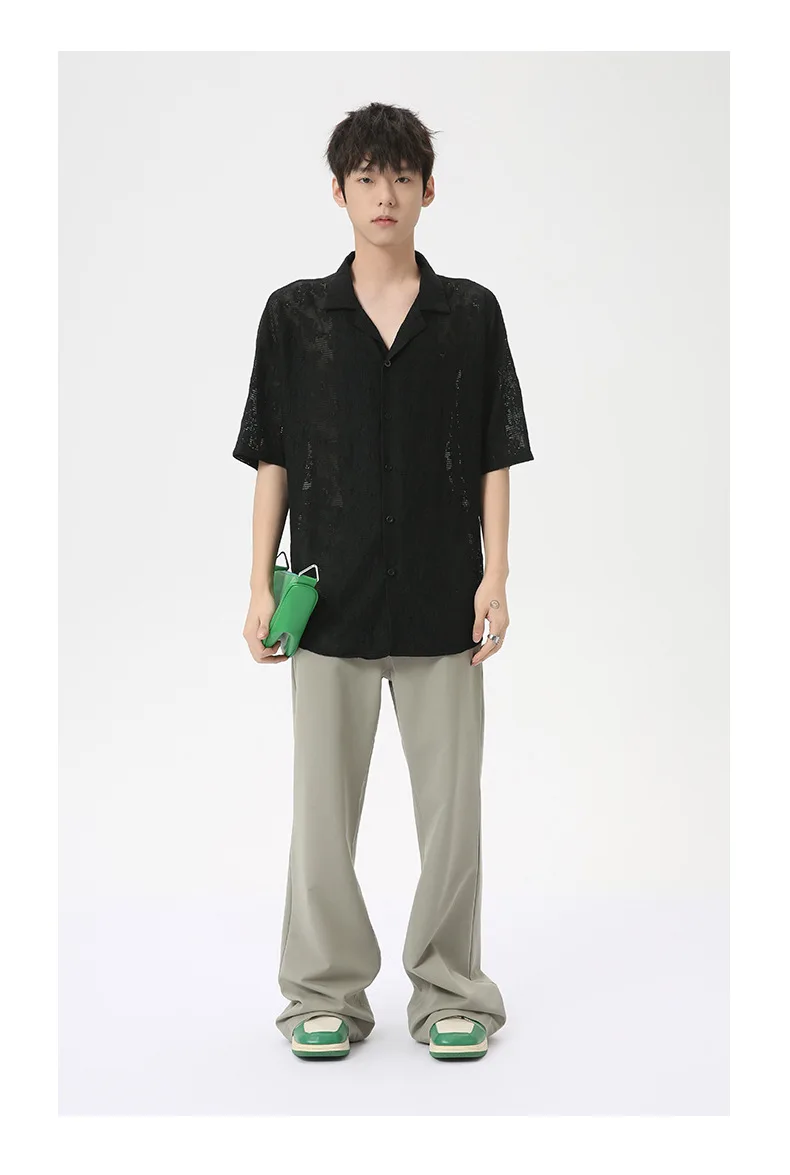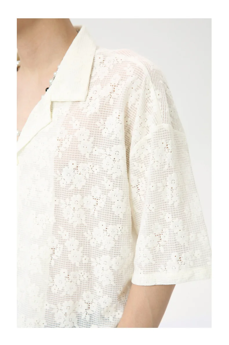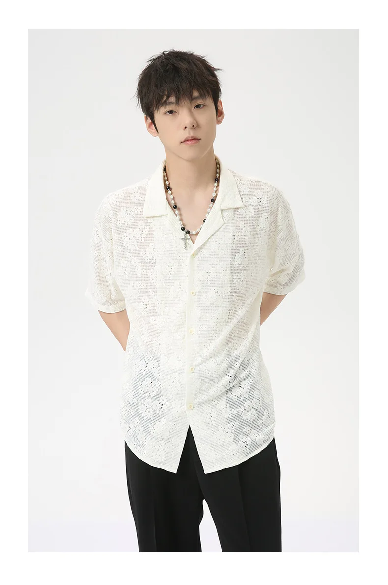 Advbridge Men's Wear 2024 Summer Flower Embroidery Hollow Out Cuban Collar Shirts Top Trendy Korean Streetwear Short Sleeve Shirt