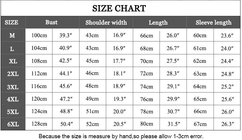 Note: We sell ASIAN SIZE.It is about2-3 sizeSMALLER than US,UK,AU,EU size.Please choose the size according to our size form.All the dimensions we have personally measured and reality try. When you place the order please live the message with your Shoulder(CM) and Chest(CM) .We will help you to confirm the size.Think you for buying !