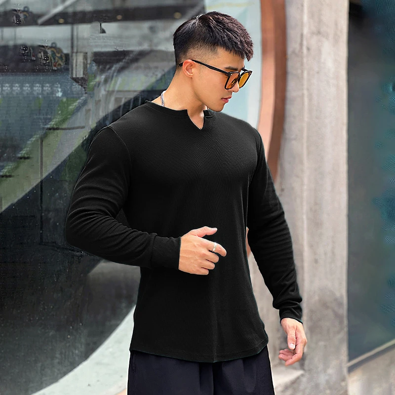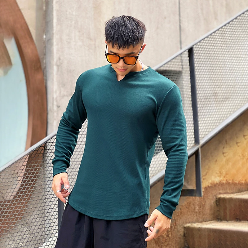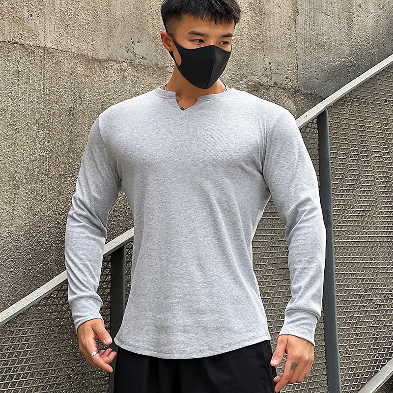 Advbridge Solid Color V-neck Fitness Cotton Long-sleeved Men's High Elastic Slim T-shirt Sports Running Training Quick-drying Tights