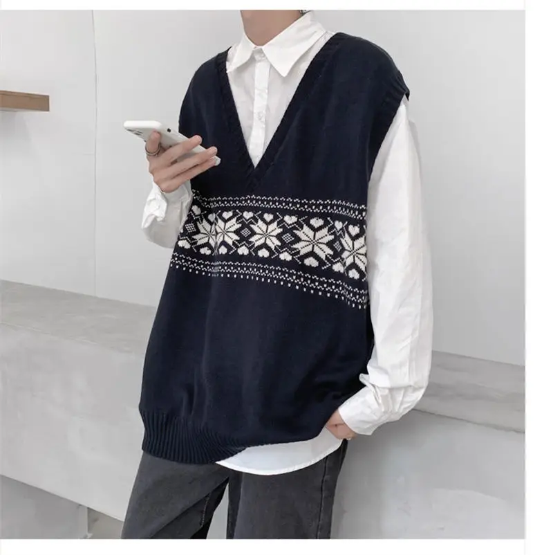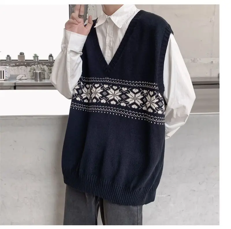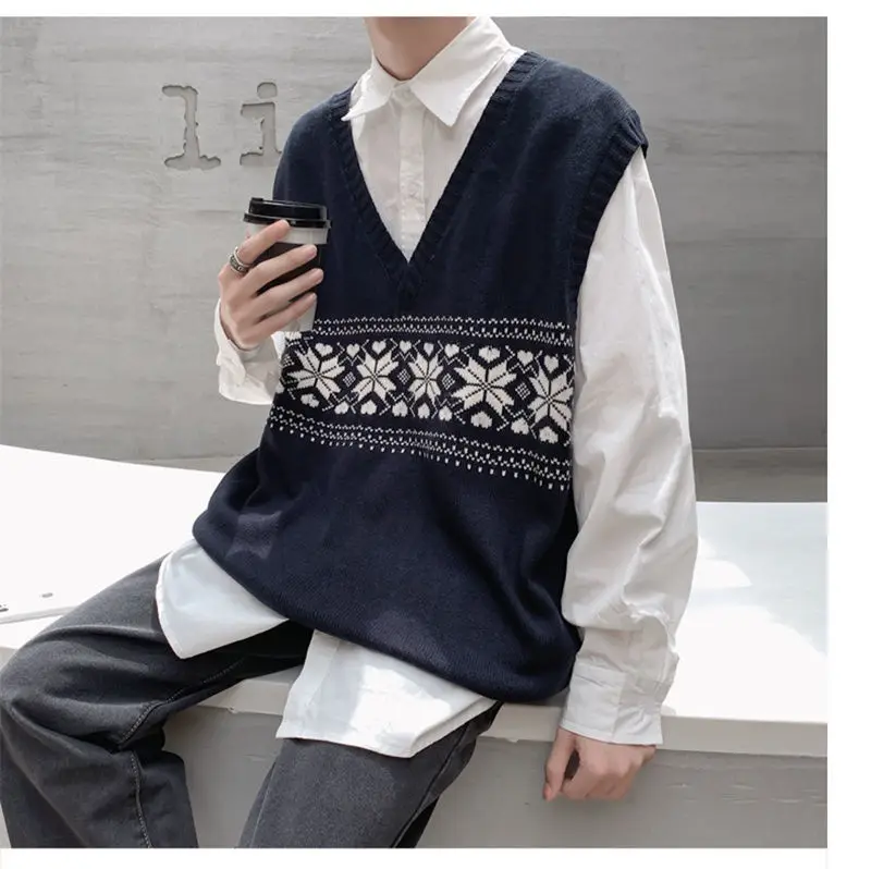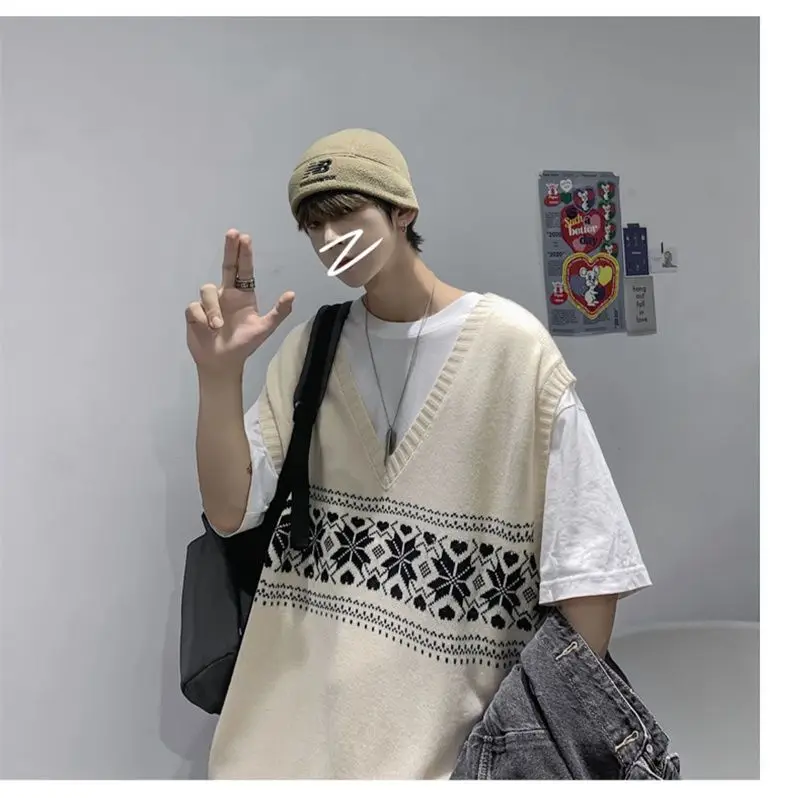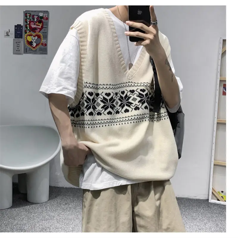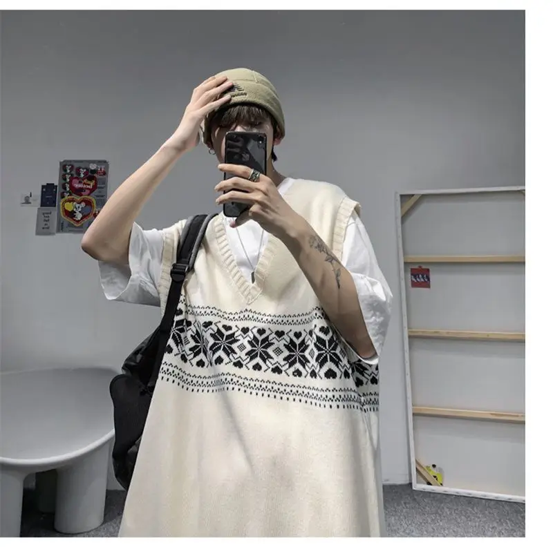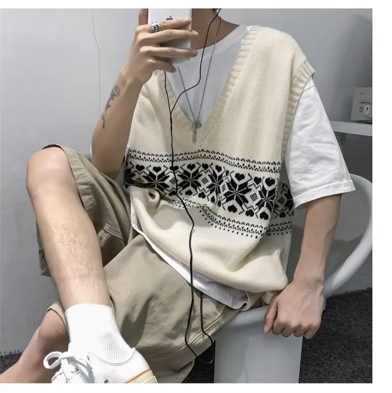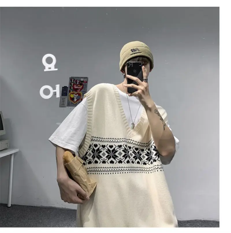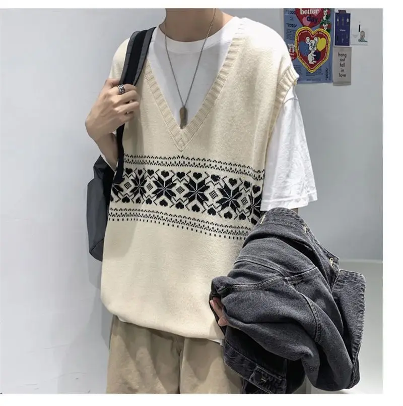 Advbridge Spring Autumn Winter Solid Patchwork Stripes Casual Pullover Vest Men Loose Knitted Top Student Sweater Retro Versatile Flower