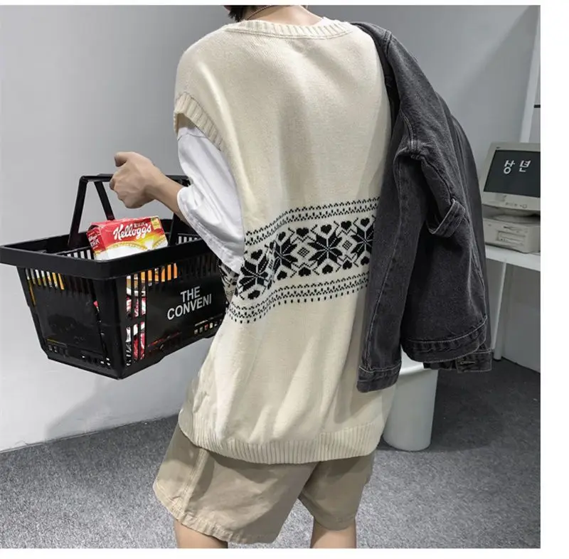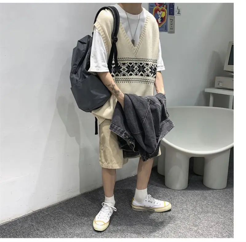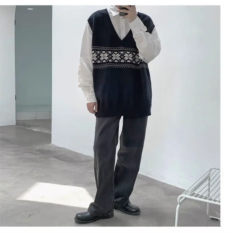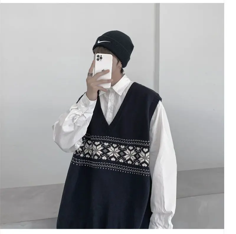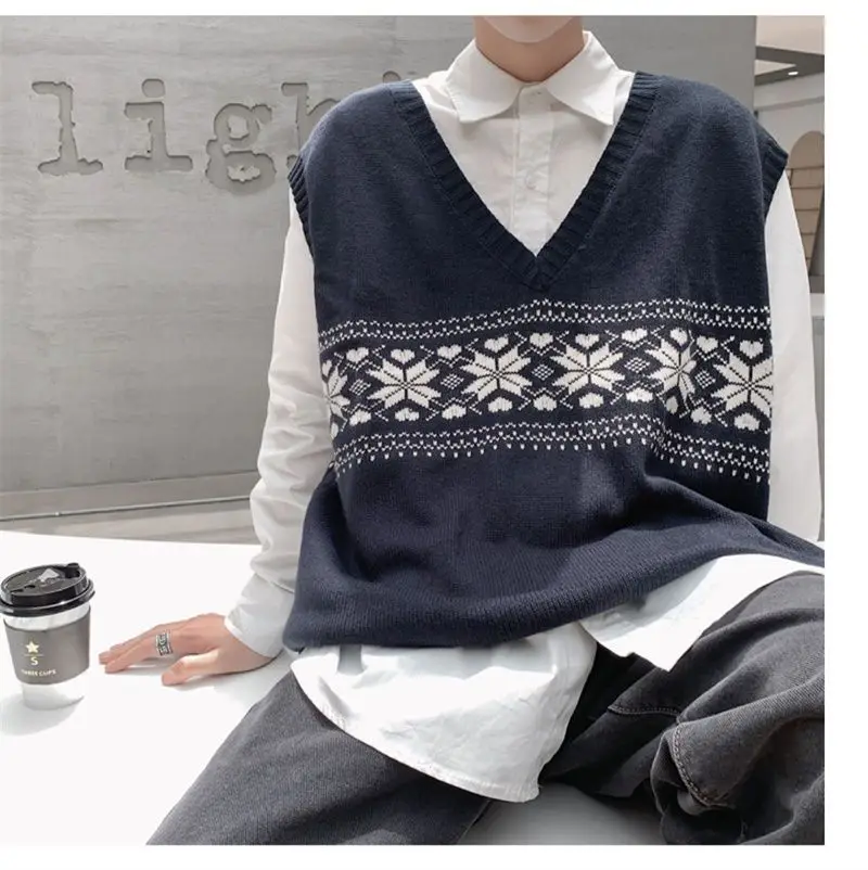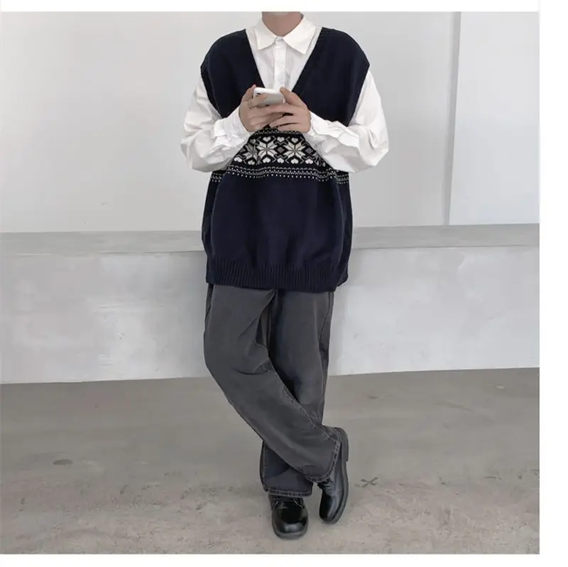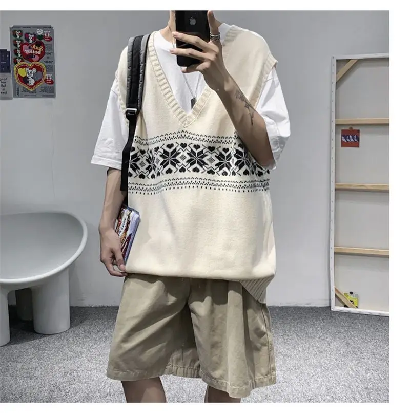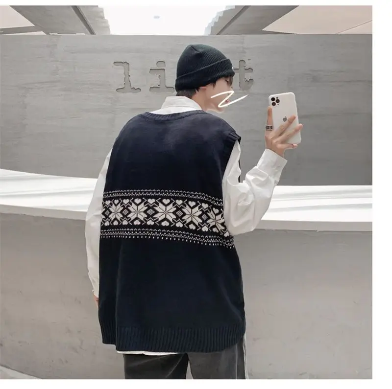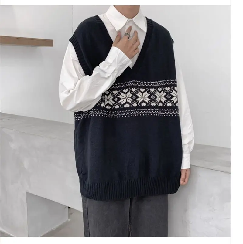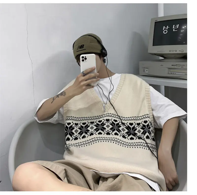 Advbridge Spring Autumn Winter Solid Patchwork Stripes Casual Pullover Vest Men Loose Knitted Top Student Sweater Retro Versatile Flower