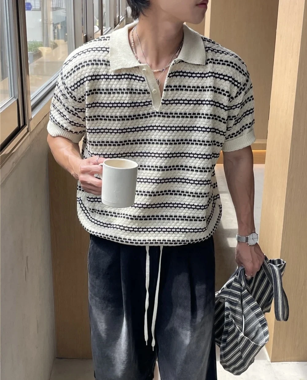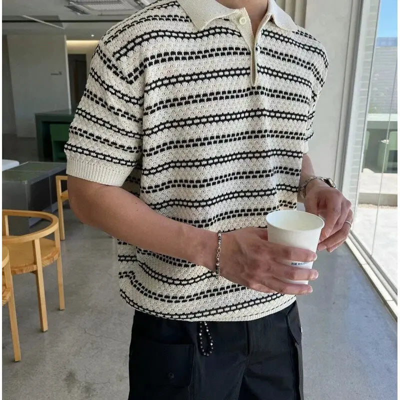 ADVBRIDGE - Summer Lapel Short Sleeved T-shirt Men Slim Fit Casual Striped T Shirt Men Streetwear Korean Knitted T Shirt Mens Polo Shirt