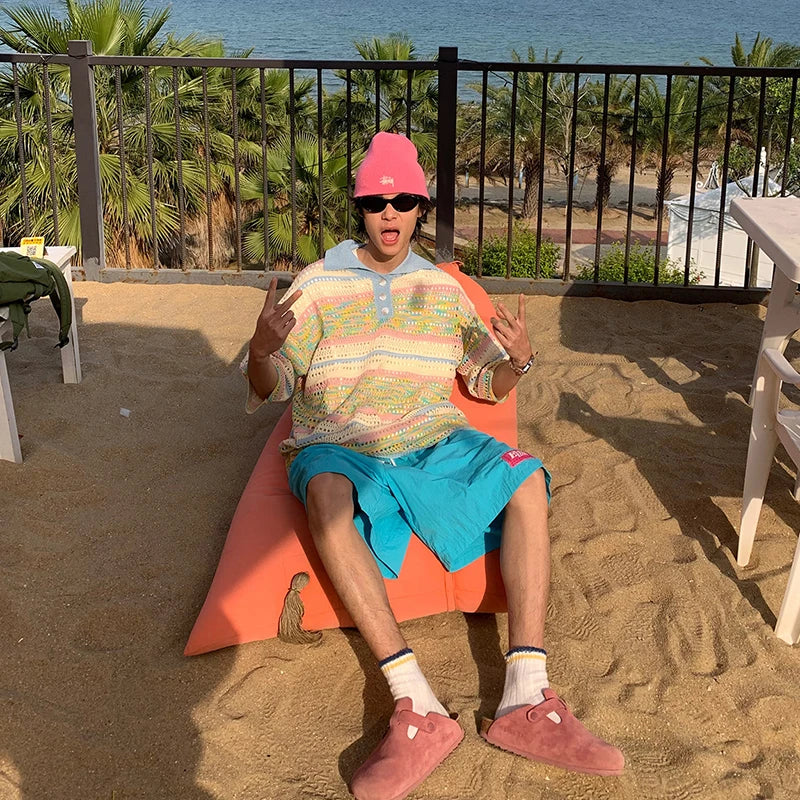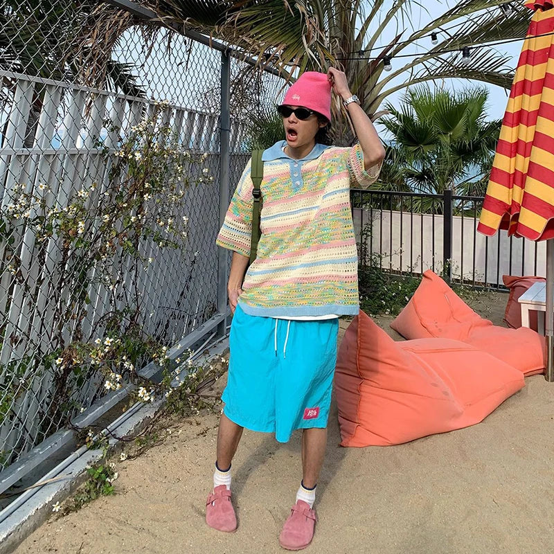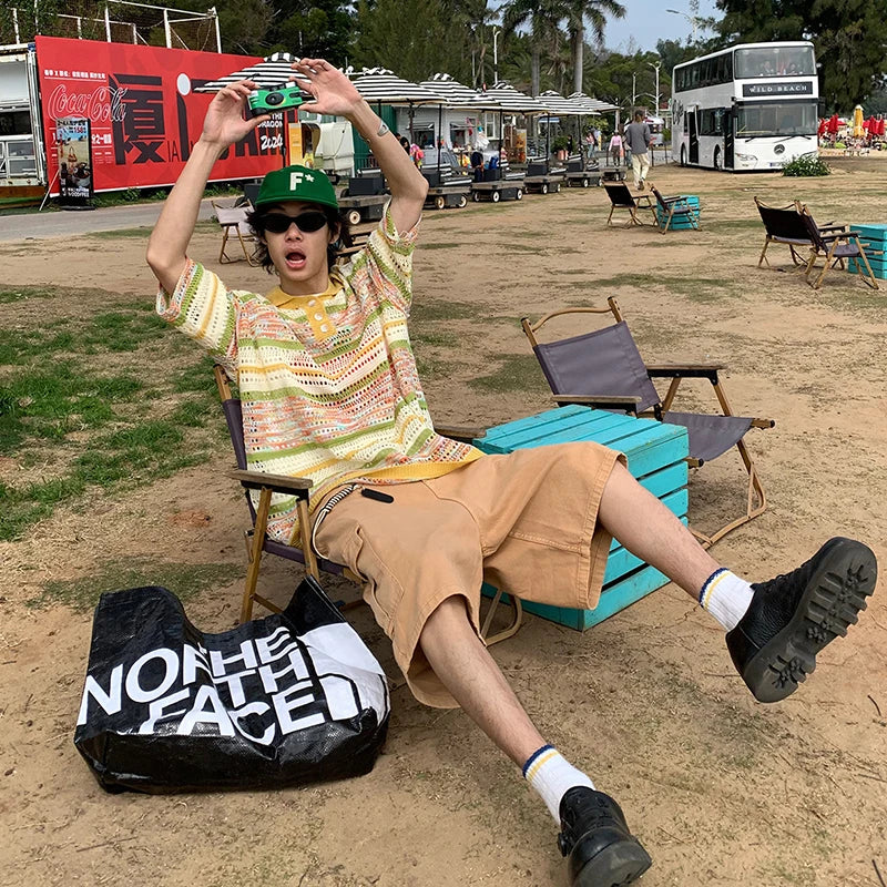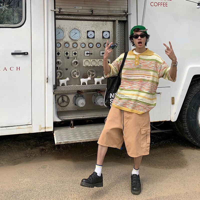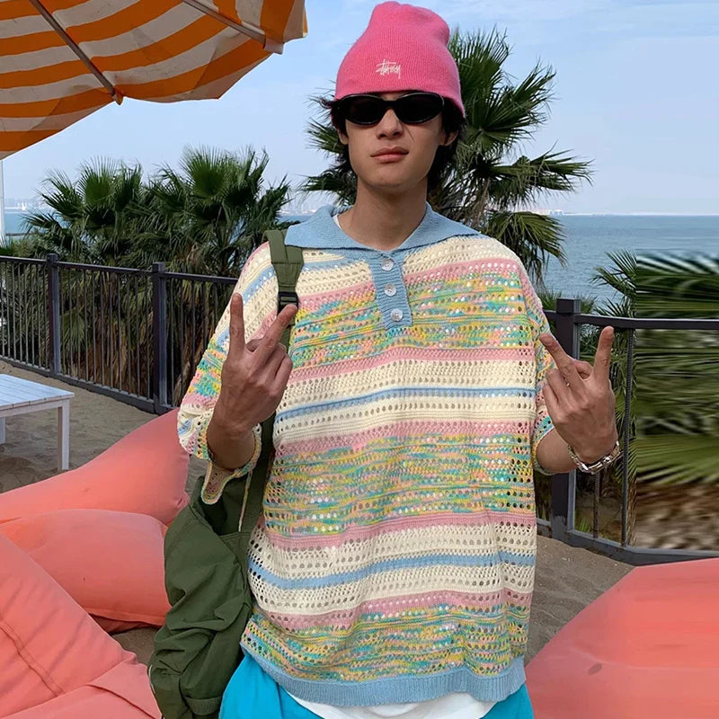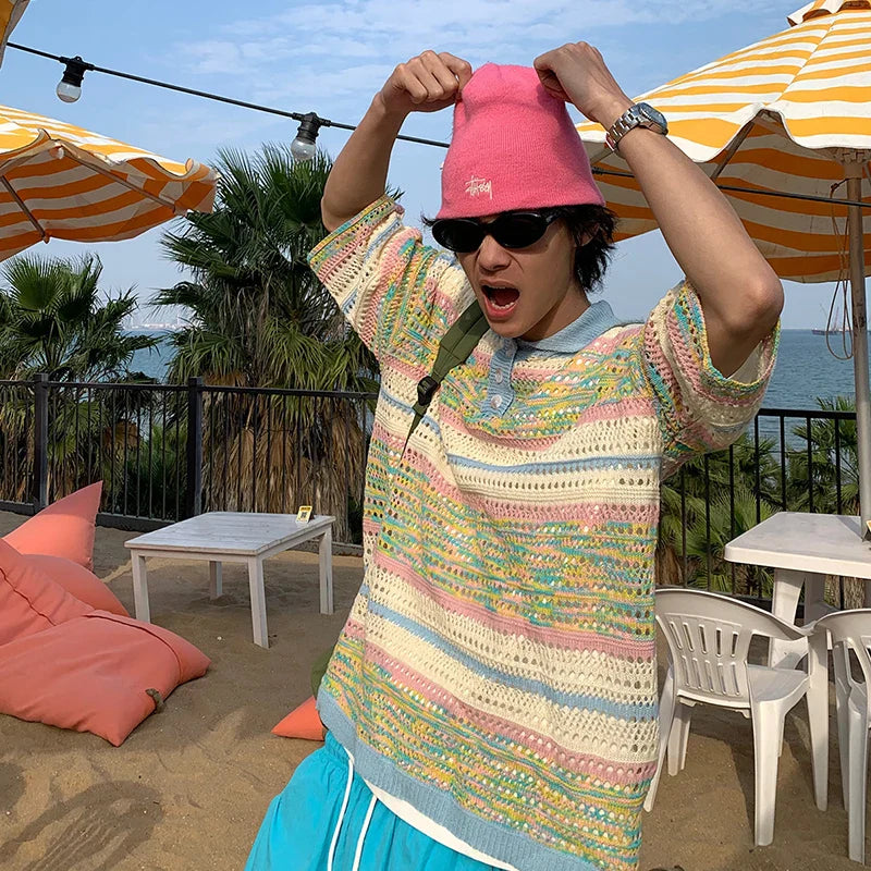 Advbridge Summer Men's Clothing Luxury Striped Hollow Out Knitted Polo Shirt Retro Short-sleeved Korean Popular Knitwear Leisure T-shirts