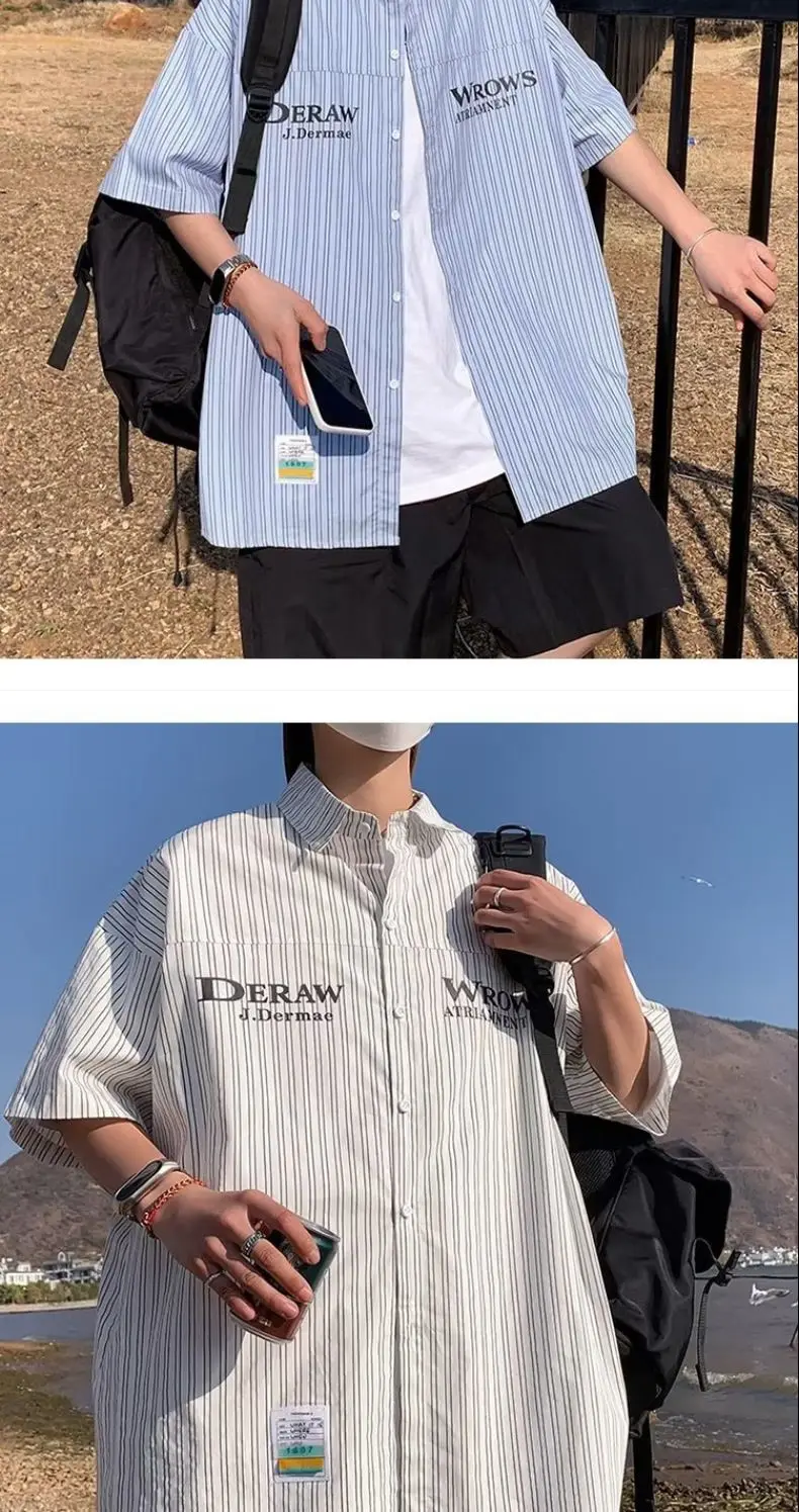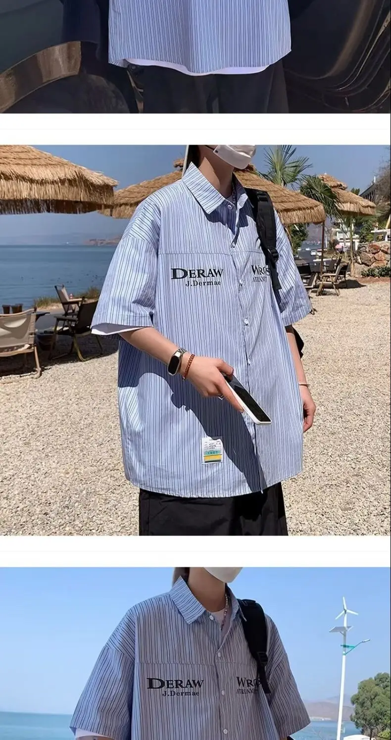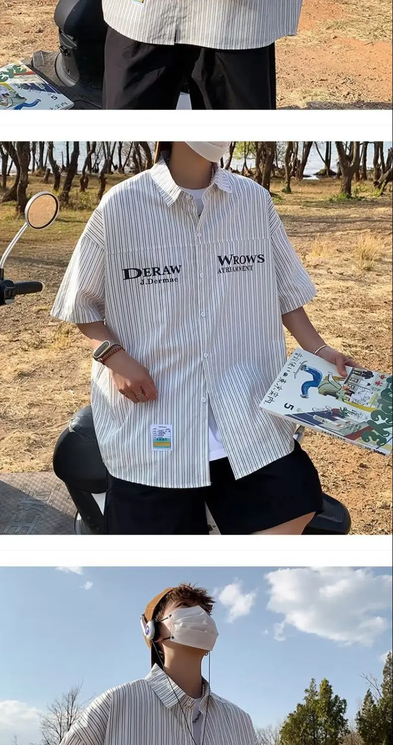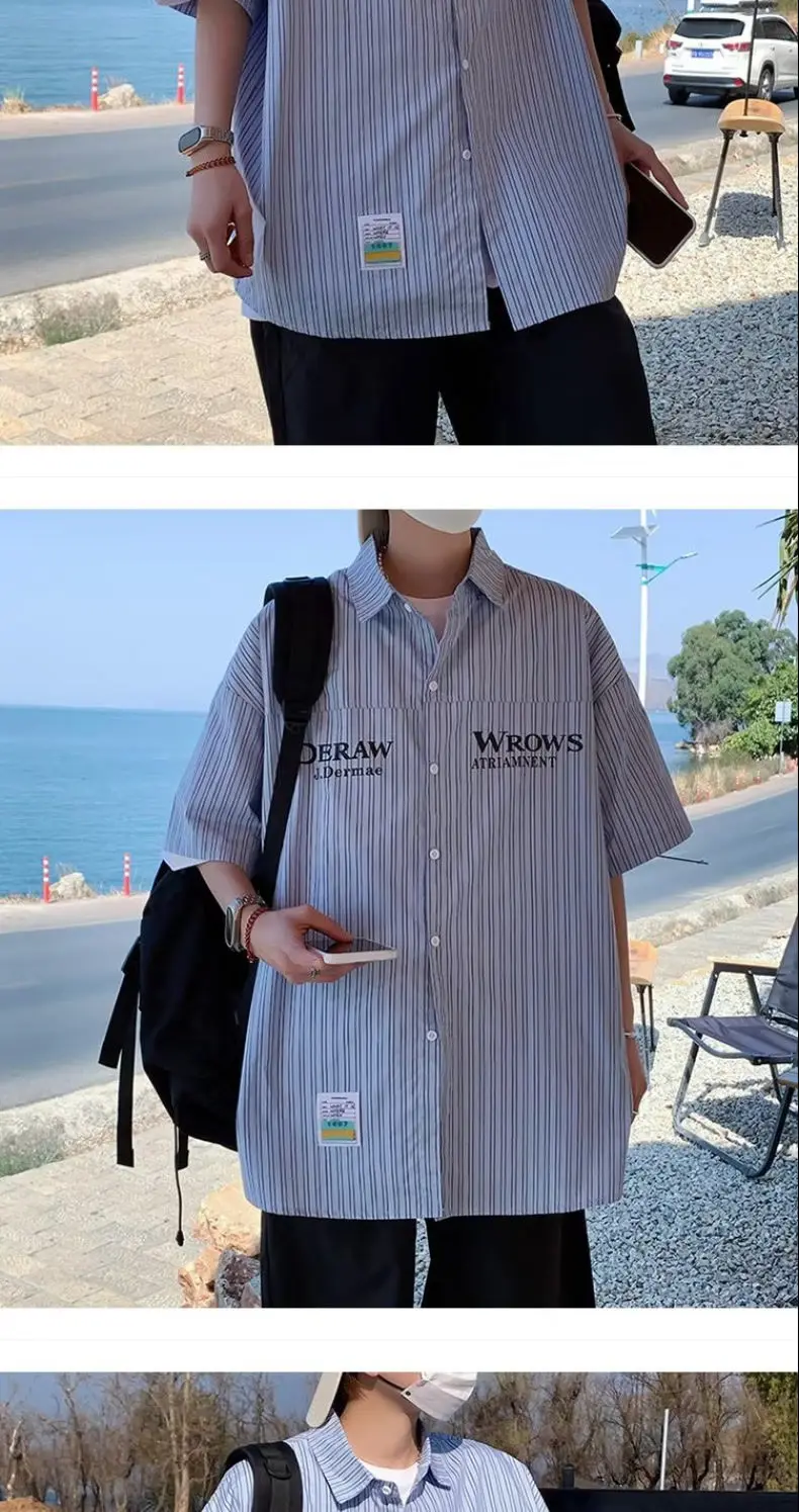 Advbridge Summer Versatile Men's Cool Casual Loose Tess Button T-Shirt Soft Short Sleeve College Style Letters Vertical Stripes Pocket
