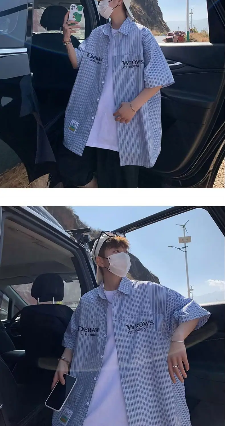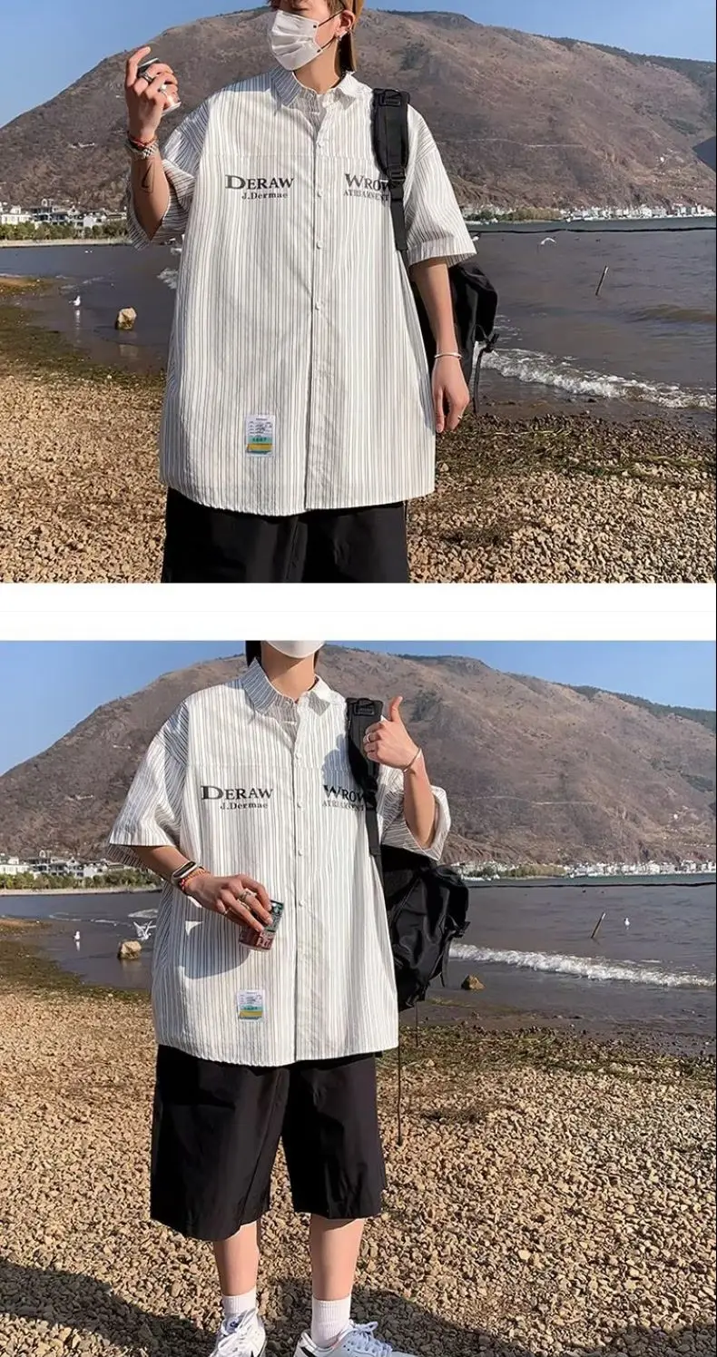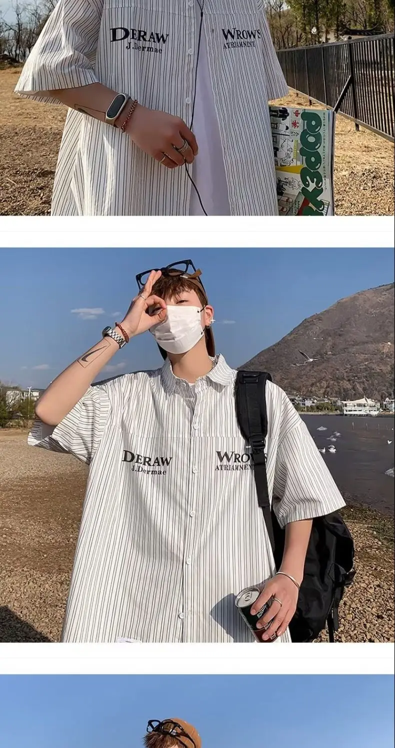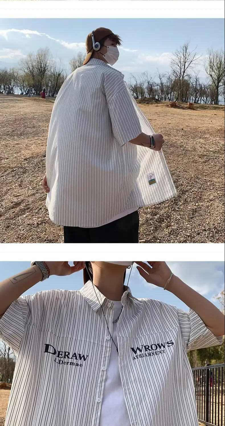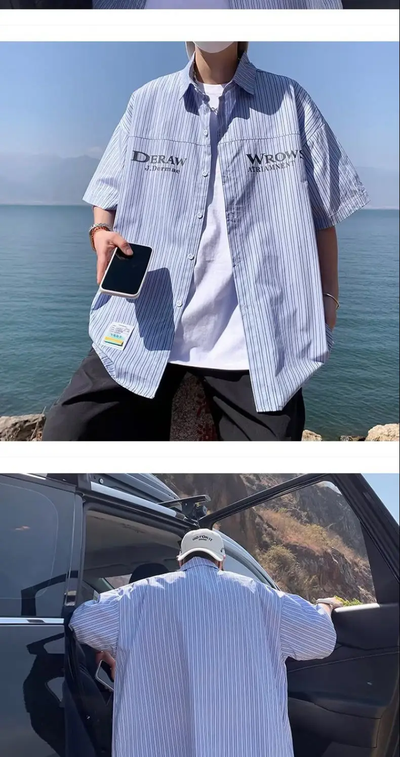 Advbridge Summer Versatile Men's Cool Casual Loose Tess Button T-Shirt Soft Short Sleeve College Style Letters Vertical Stripes Pocket