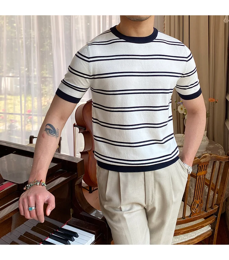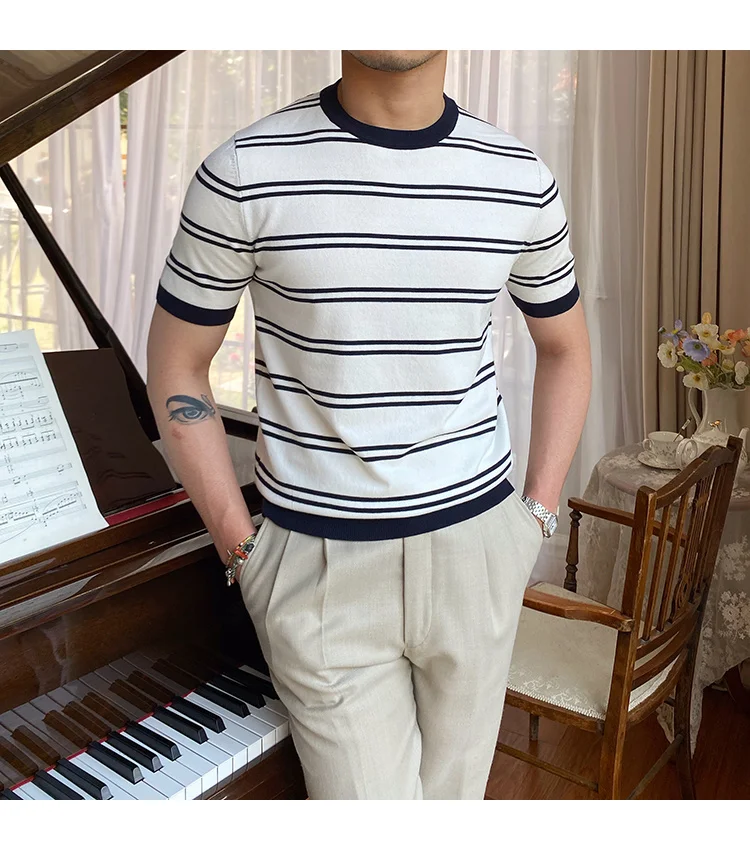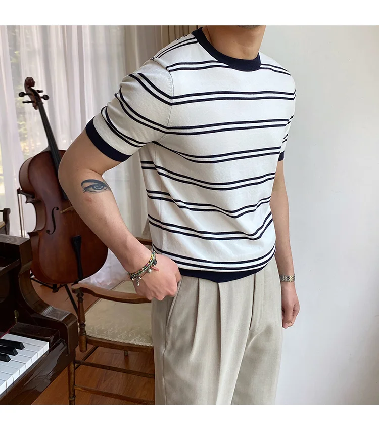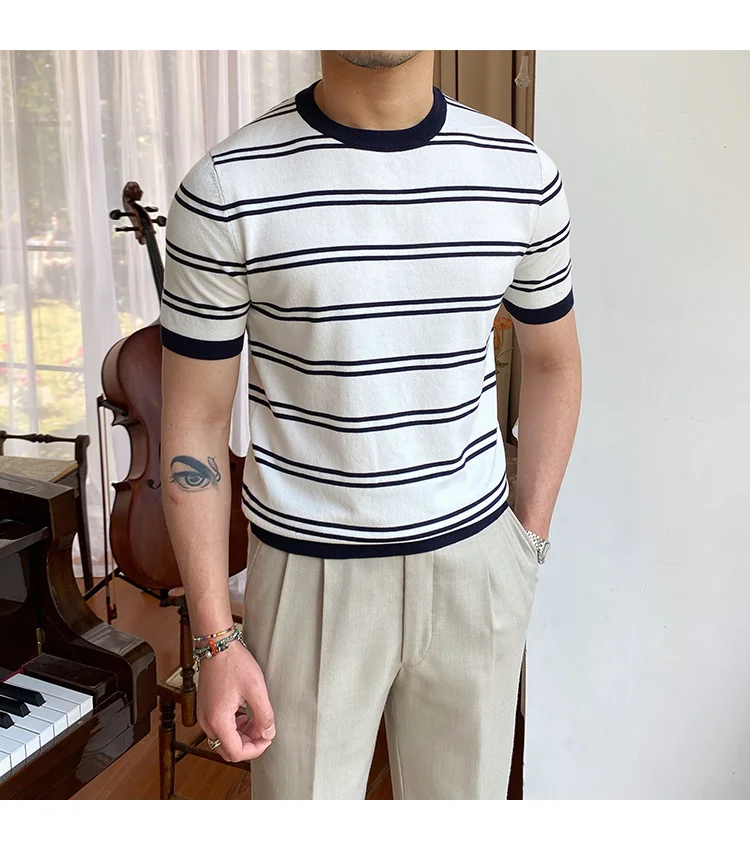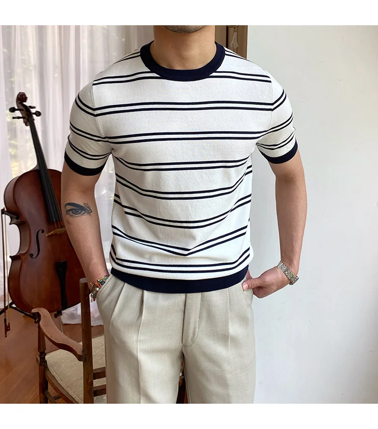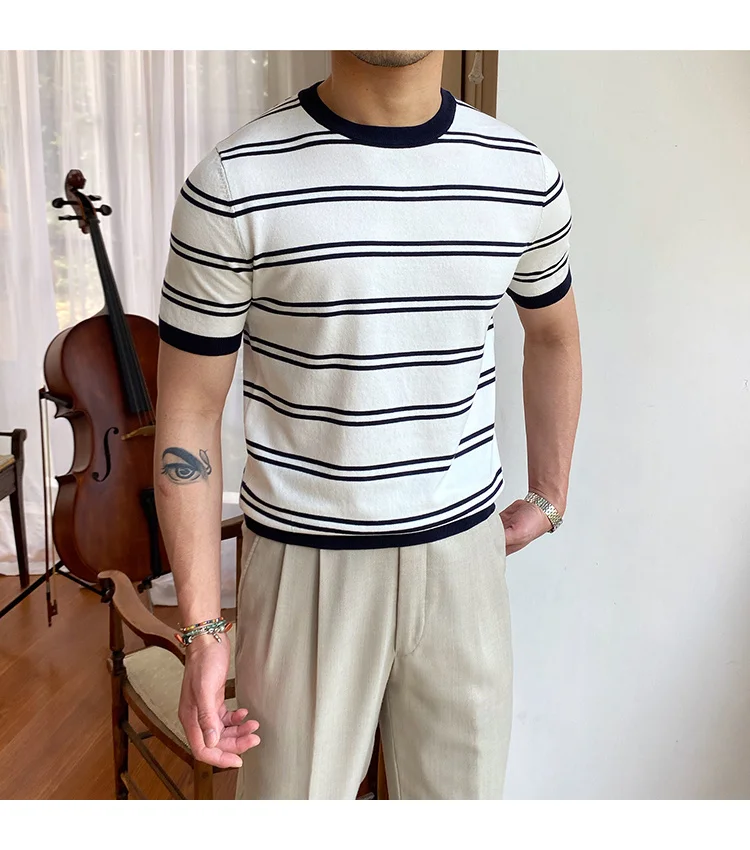 Advbridge Trend Splicing Striped Tee Shirt Men Short Sleeve Business Office Crew Neck Summer Breathable Tshirt Camiseta Manga Corta Hombre