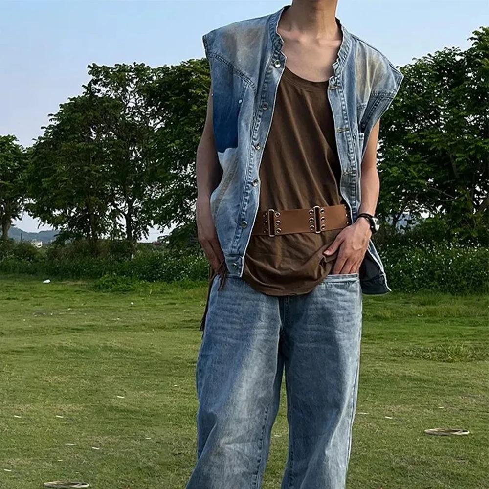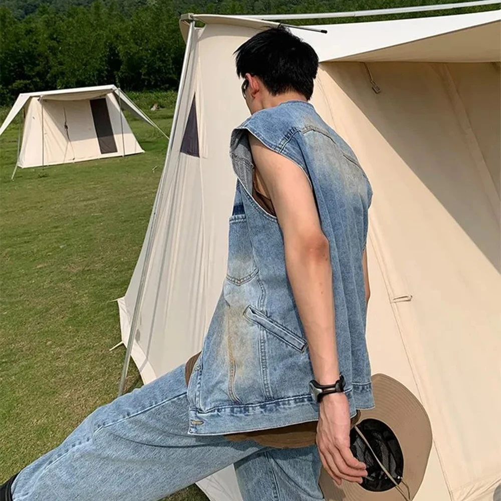 Advbridge Y2k Old Denim Jacket Summer Tide Brand Western Denim Sleeveless Vest Men's American Retro Loose Casual Waistcoat Top Street Coat