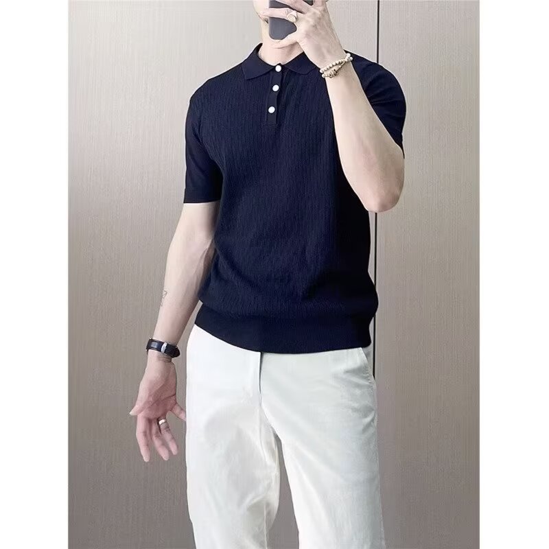Advbridge Men's Summer Ice Silk Breathable Knitted Polo Shirt Lapel Fashion Hollow High Elastic Short Sleeve T-shirt