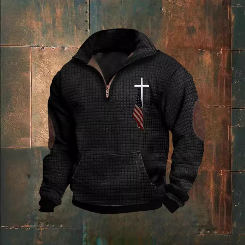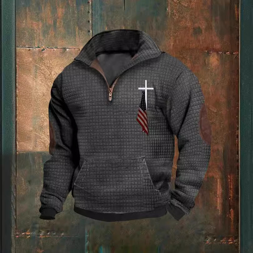 Advbridge Vintage Men Waffle Sweatshirts American Flag Print Half Zip Collar Pullover Tops Fall Fashion Casual Long Sleeves Hoodies Male