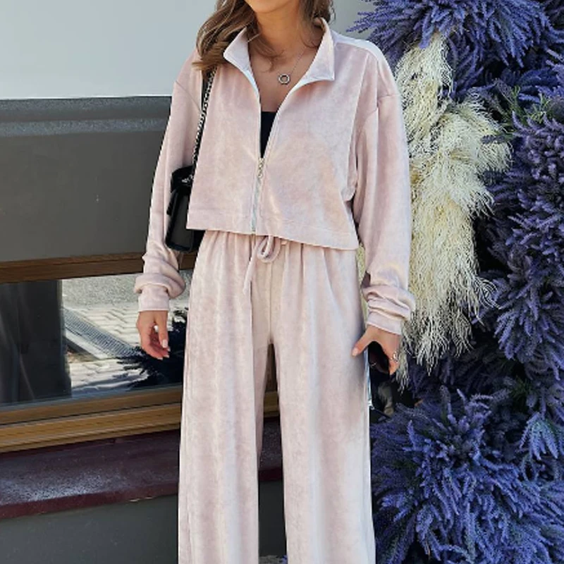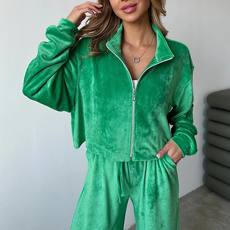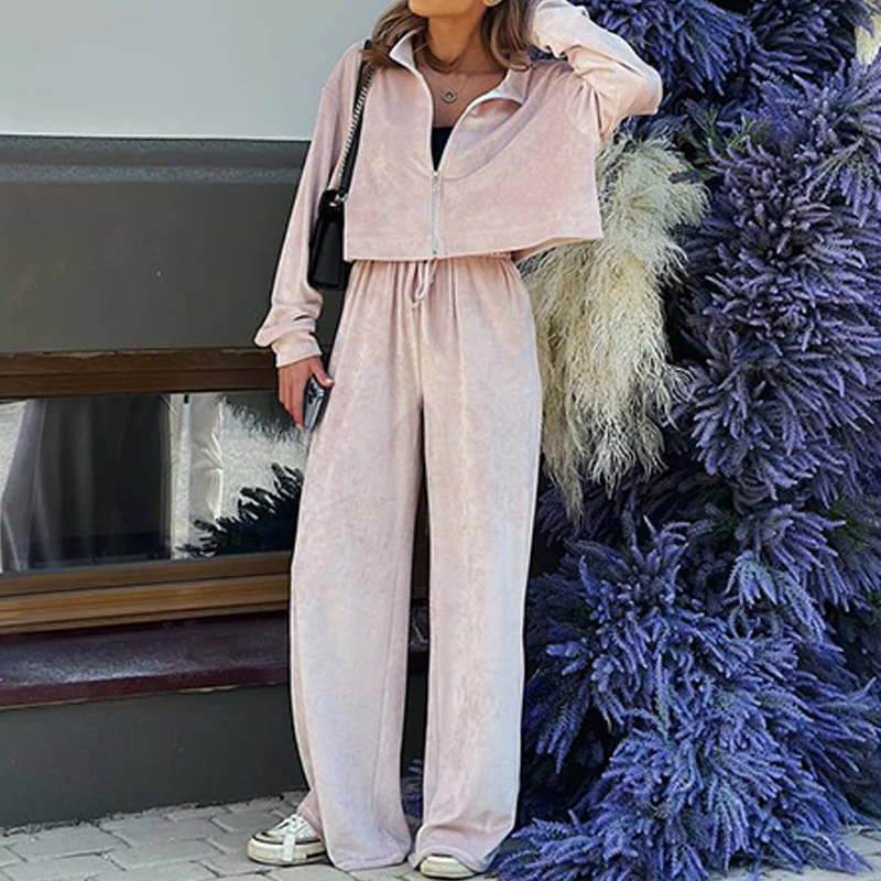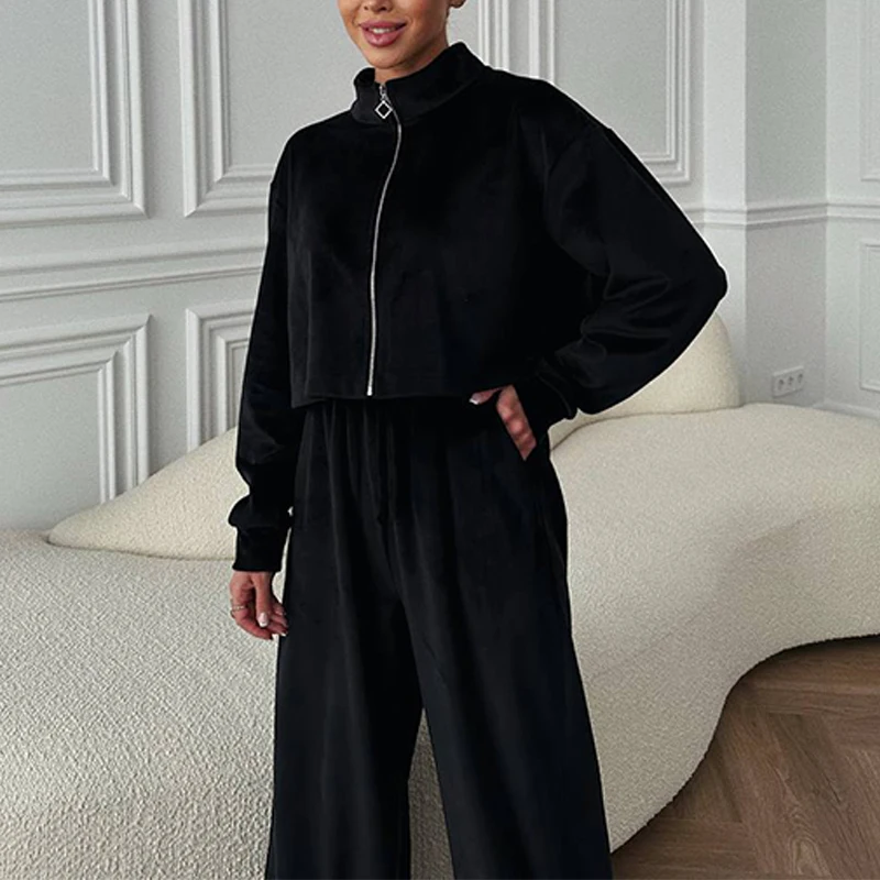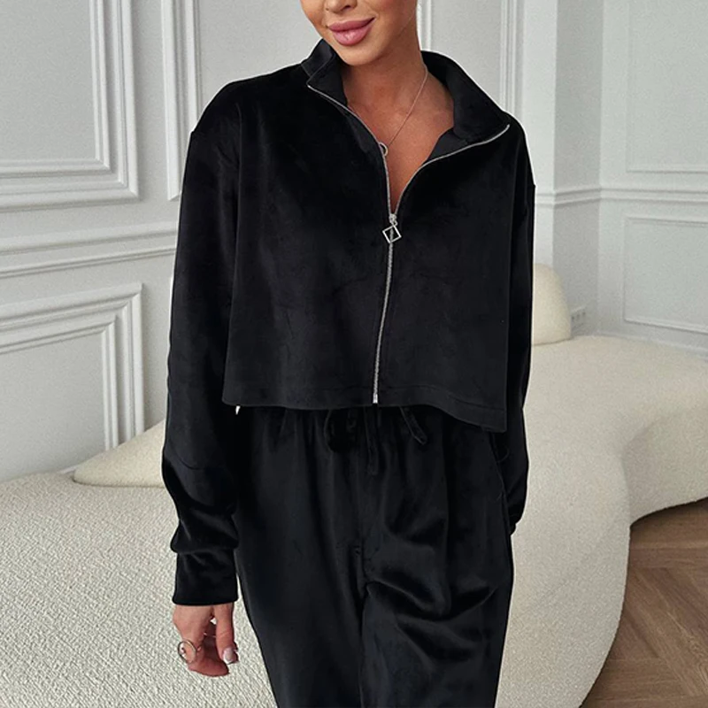 Advbridge Fashion Casual Velvet Tracksuits Outfits Autumn Stand Collar Zippered Crop Coat+Long Pant Set Elegant Solid Color Street 2pc Set