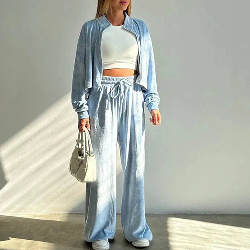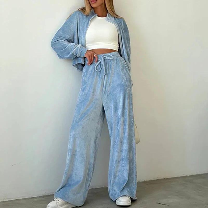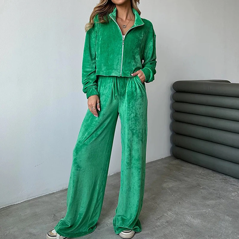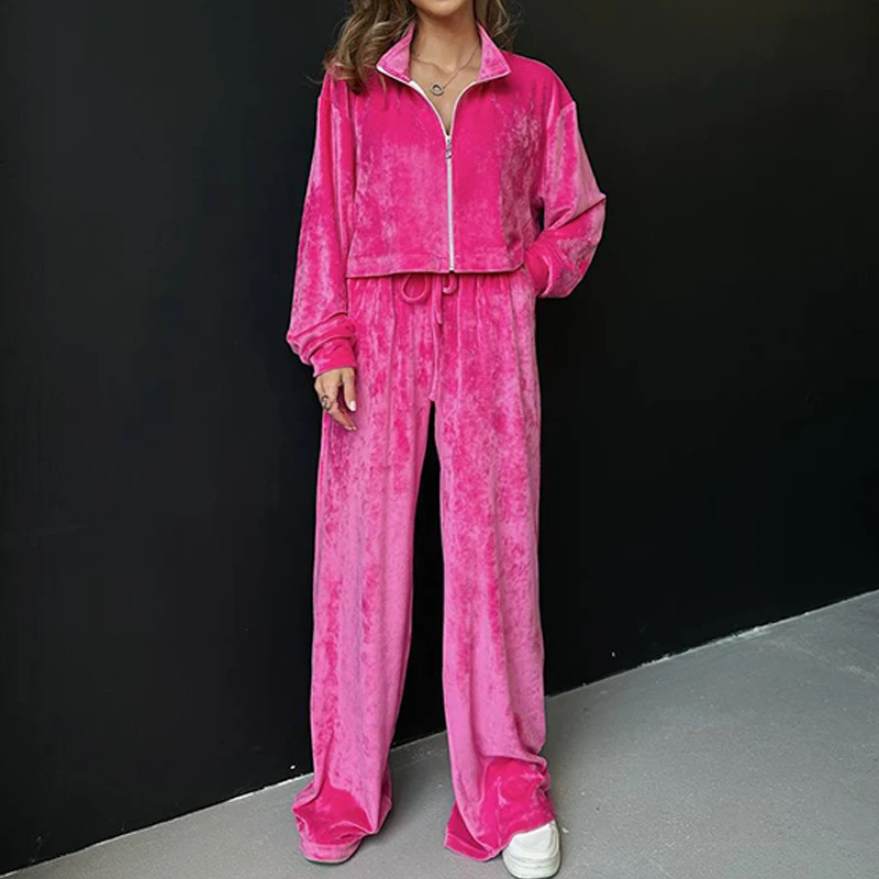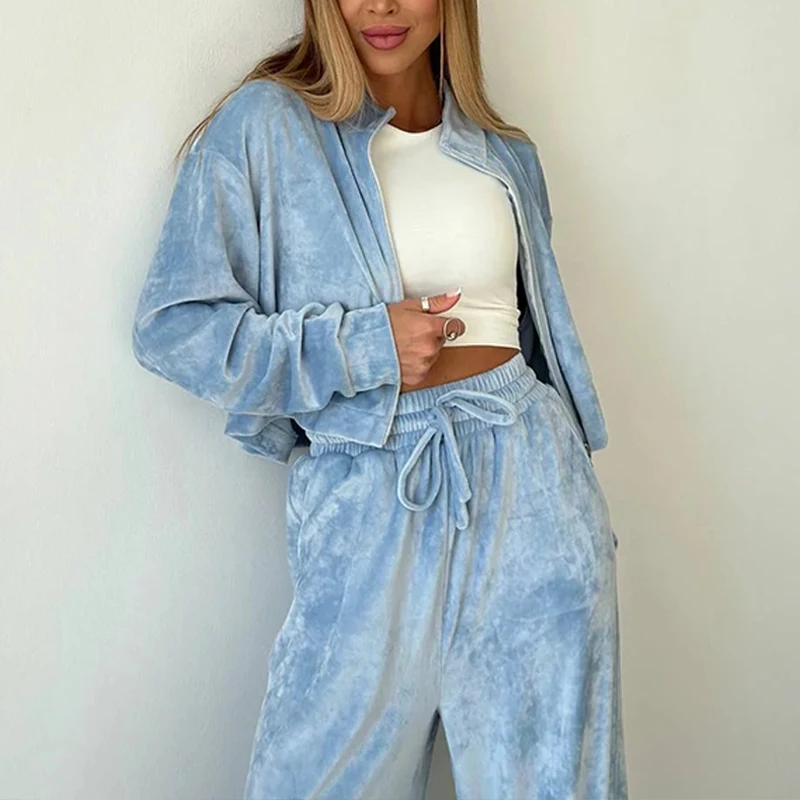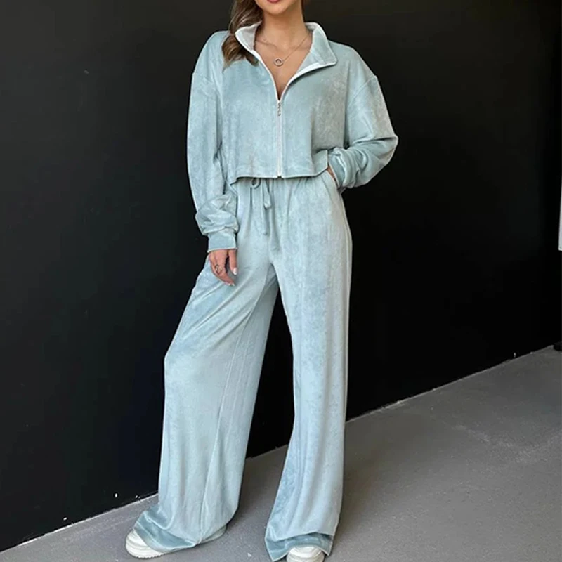 Advbridge Fashion Casual Velvet Tracksuits Outfits Autumn Stand Collar Zippered Crop Coat+Long Pant Set Elegant Solid Color Street 2pc Set