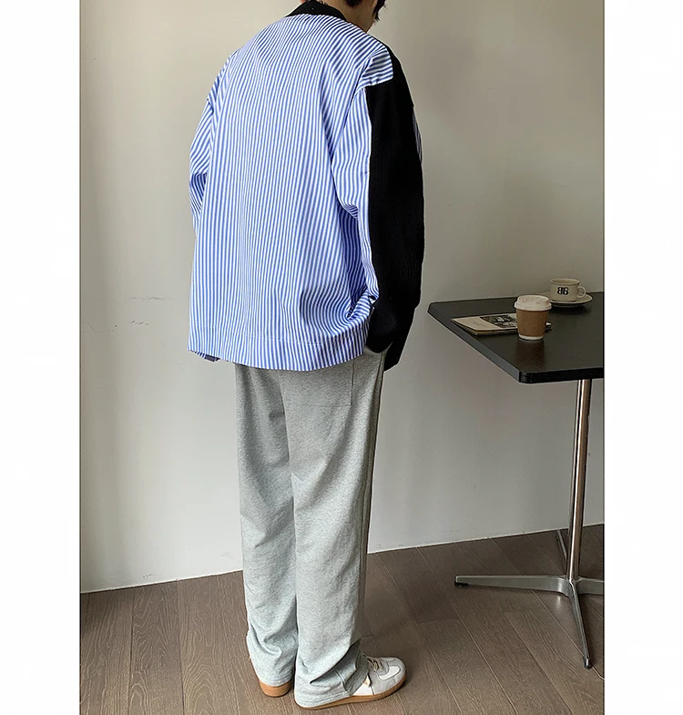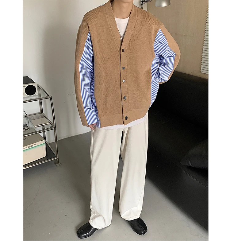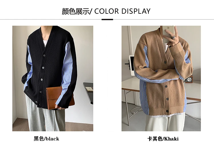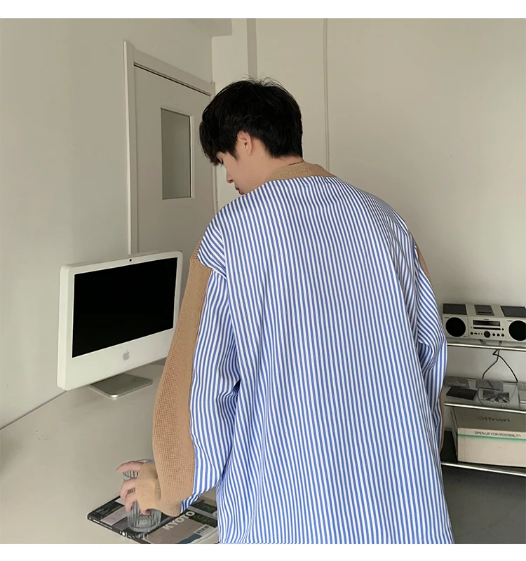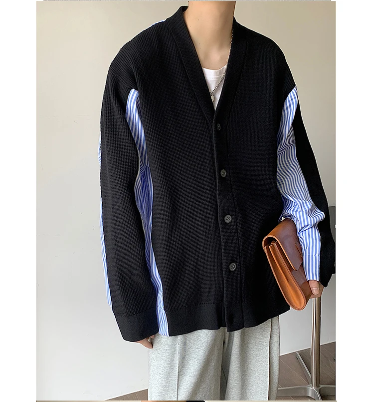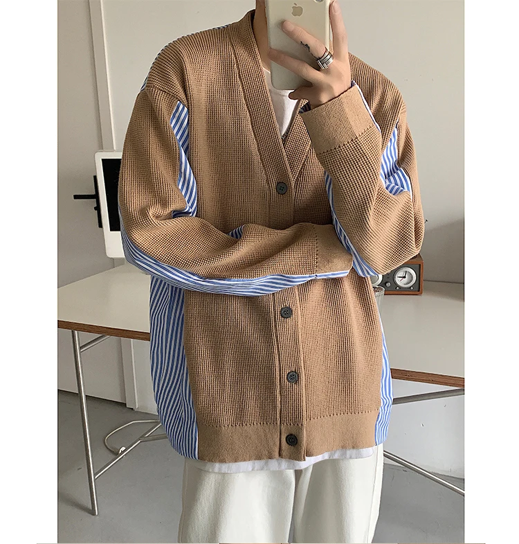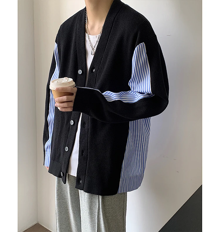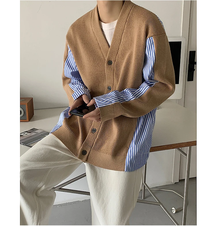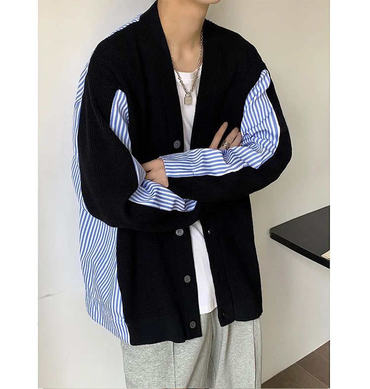 Advbridge High Quality Men's Knitted Sweater Blue Striped Patchwork Loose Casual V-neck Single-breasted Cardigan Coat Autumn New
