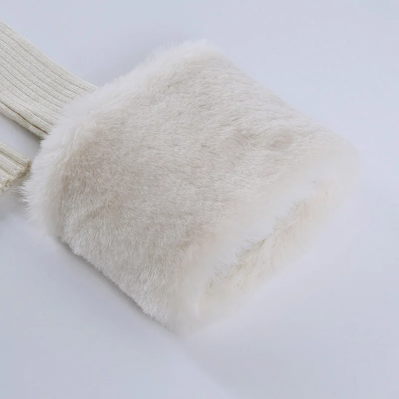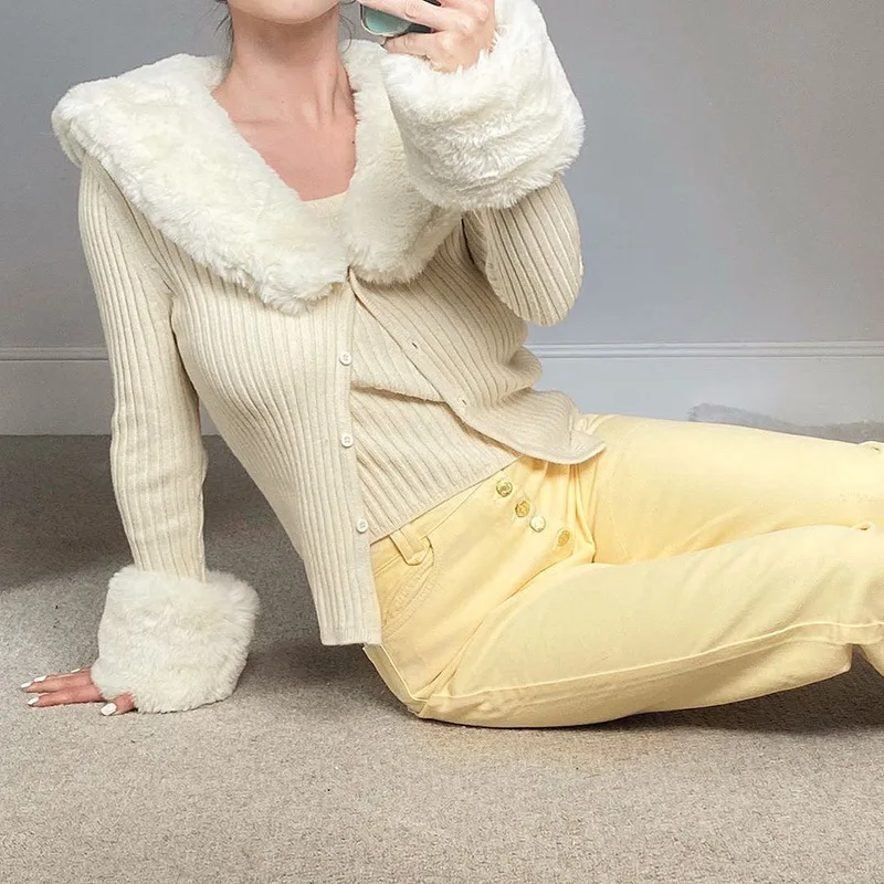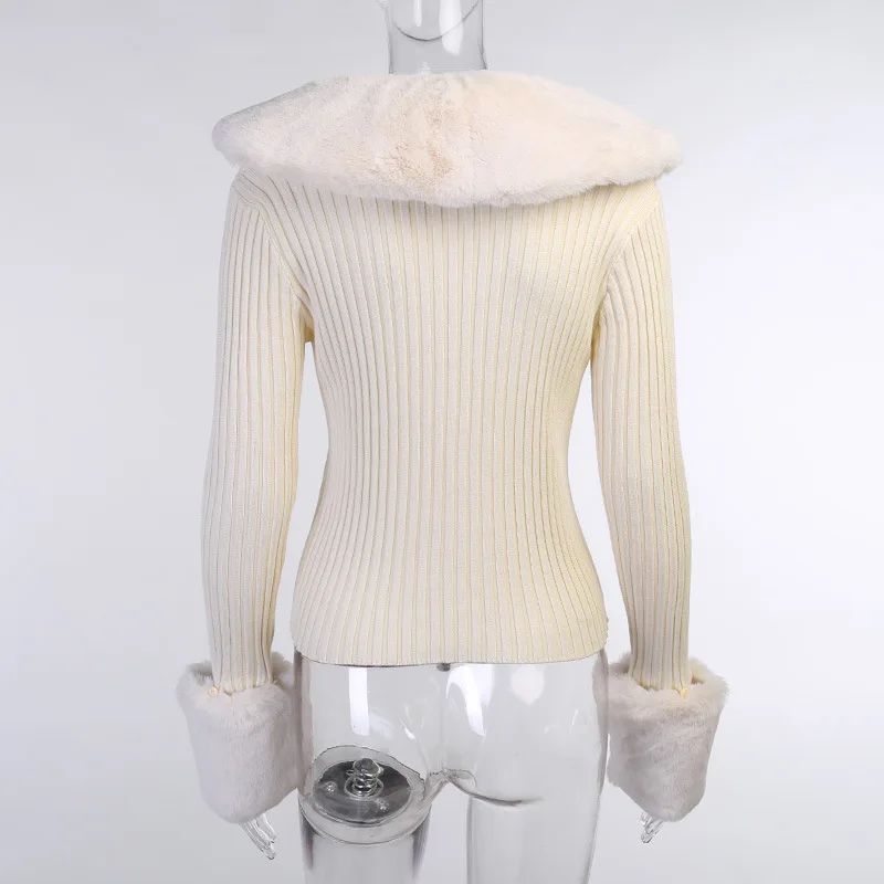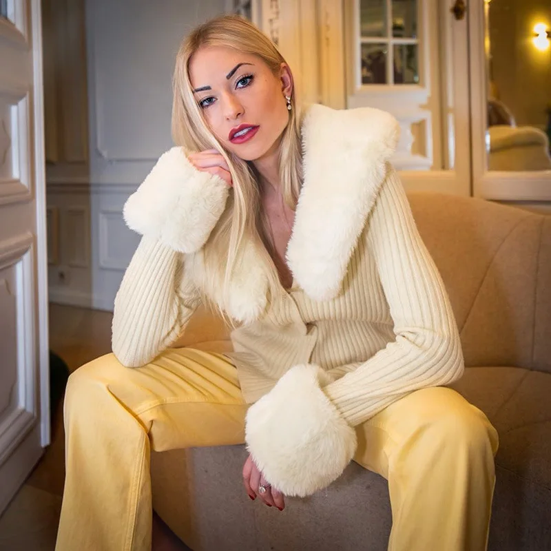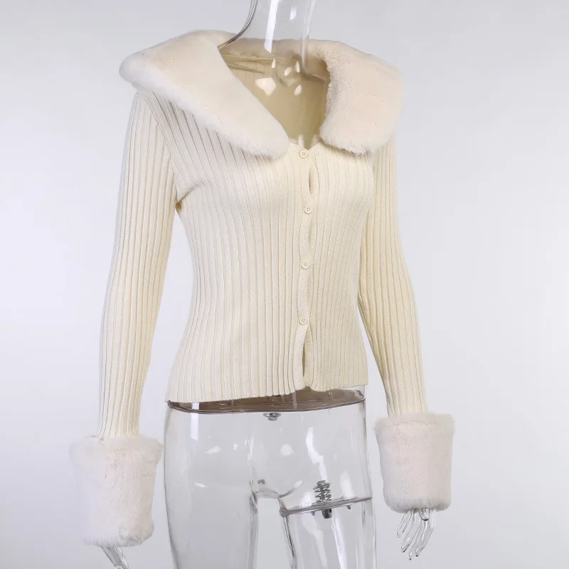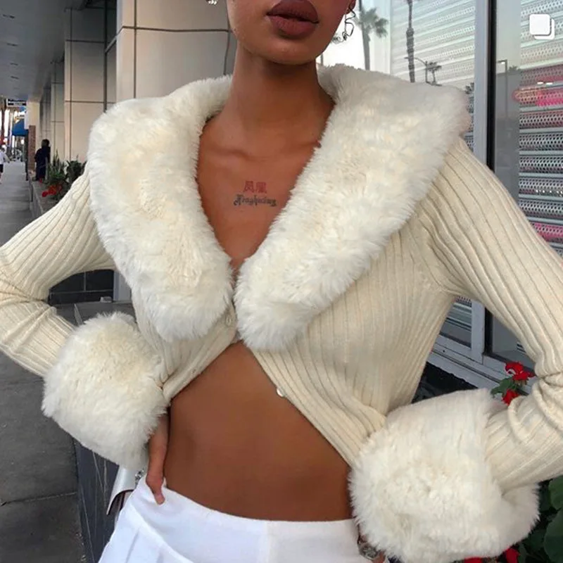 ADVBRIDGE Knitted Cardigans Coat Sexy Turn Down Fur Collar Fluffy Sleeve Button Sweater Winter Elegant Vintage Casual Slim Solid Jacket