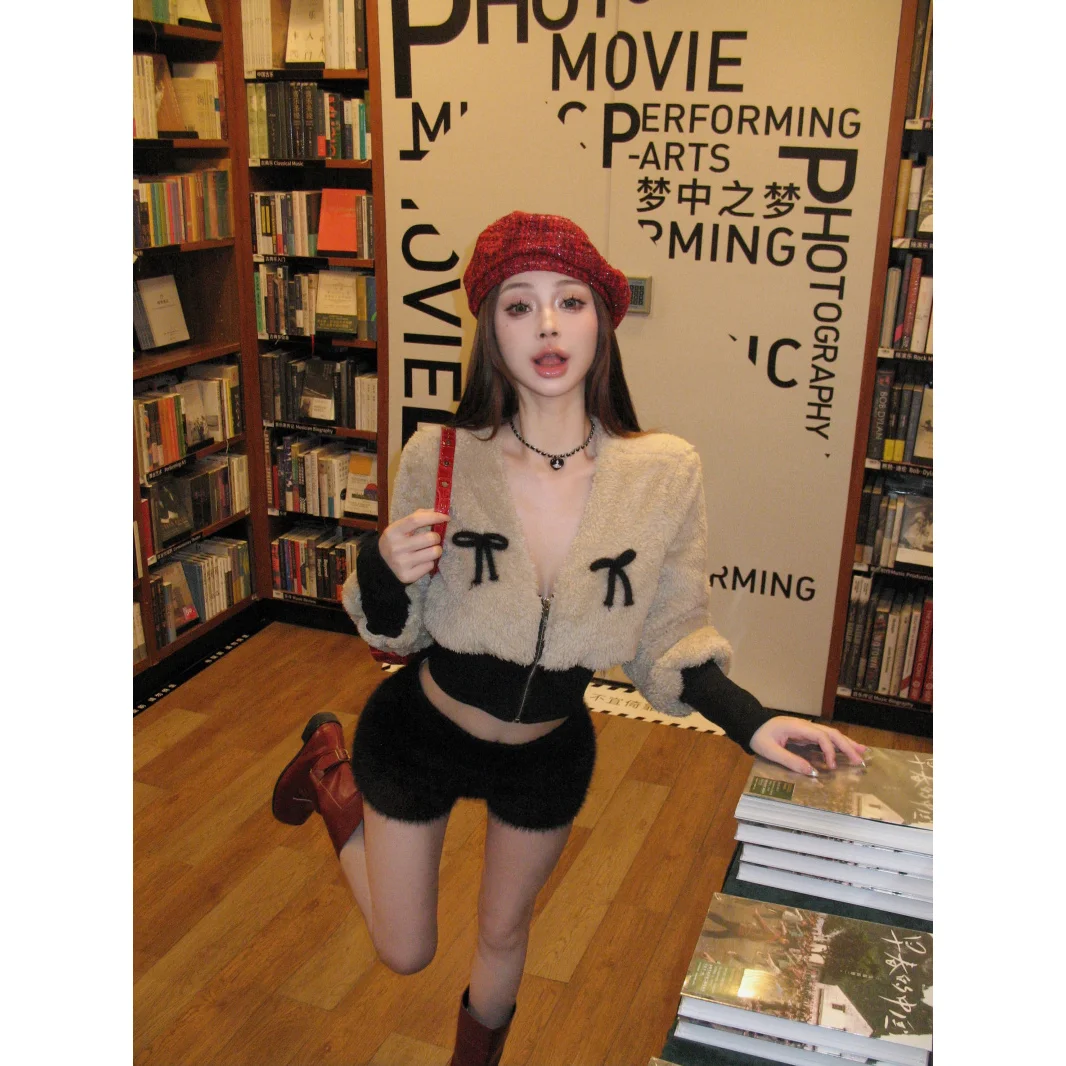 Advbridge Korean Style Short Coat with Bow Stitching V Neck Sherpa Long Sleeved Coat Autumn and Winter Slim Fit Sweet and Spicy Cardigan