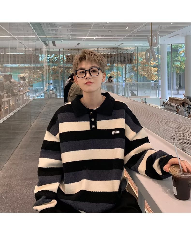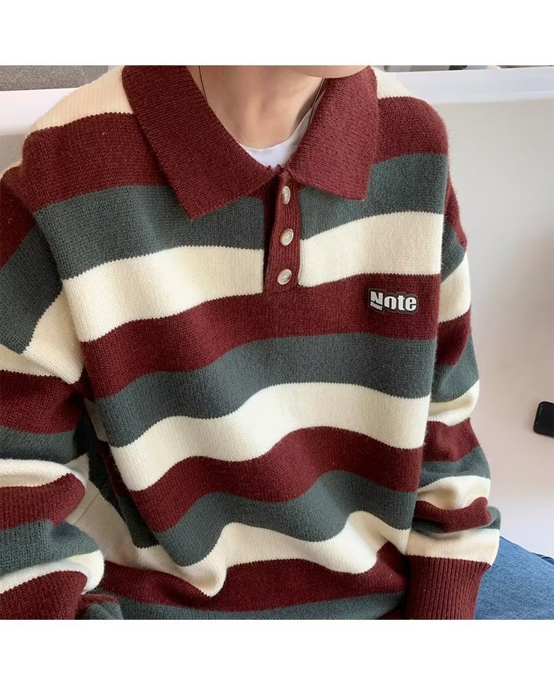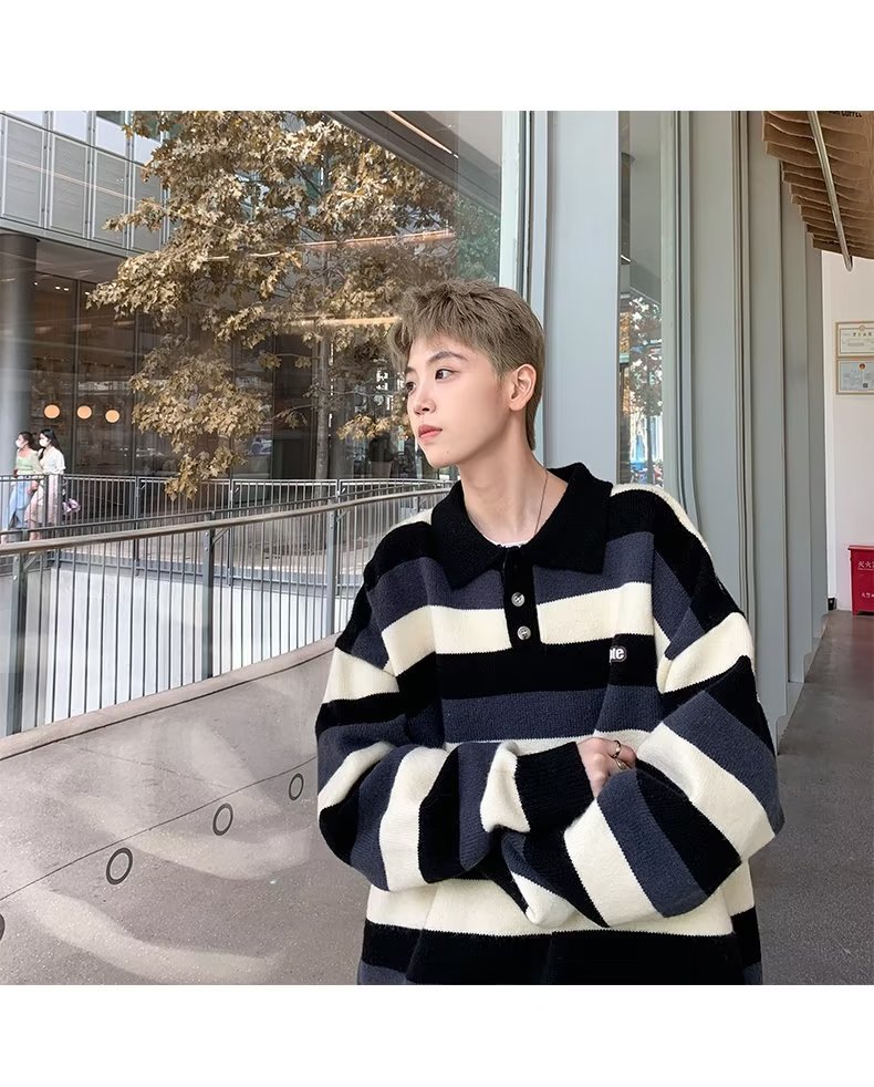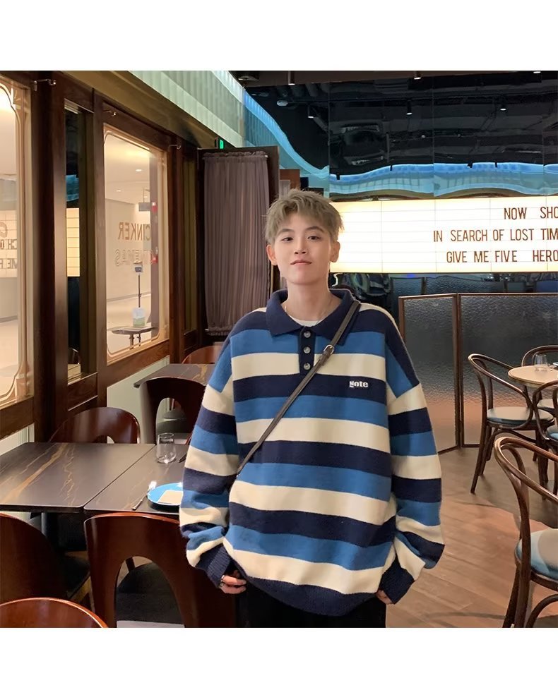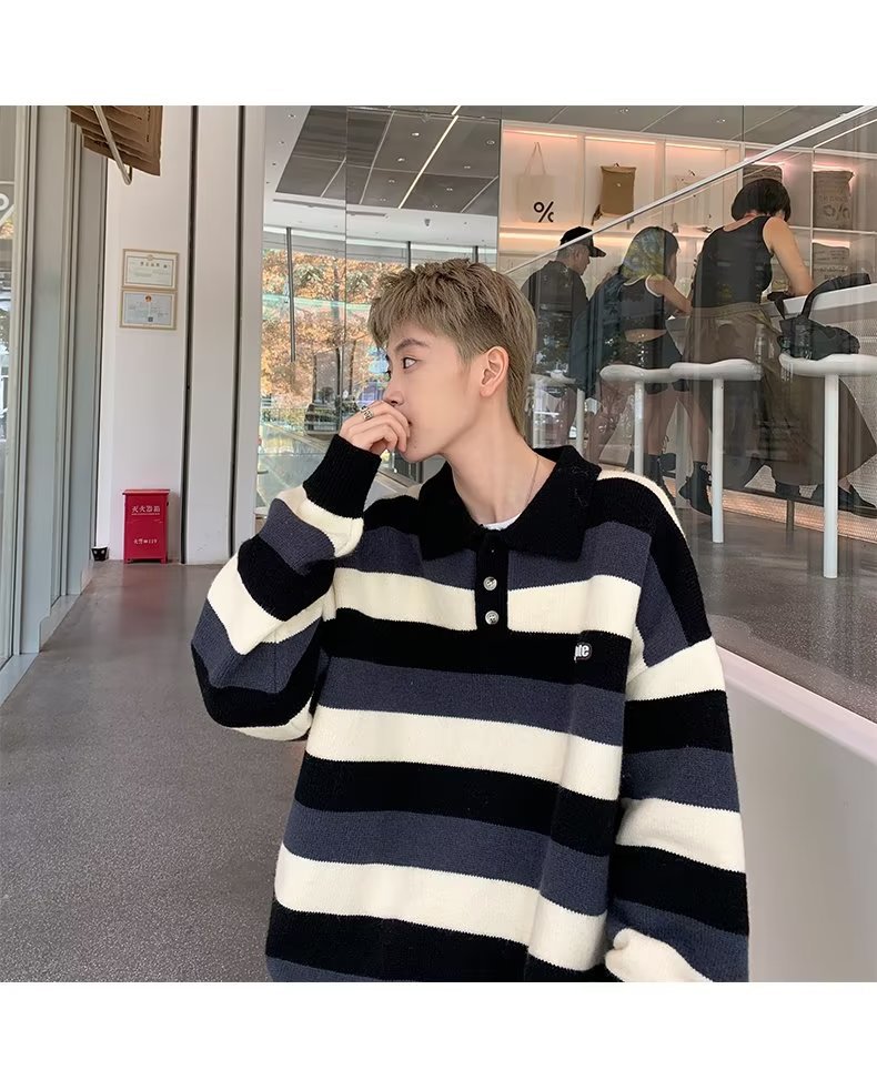 Advbridge Polo Collar Sweater Men Autumn Winter Harbor Wind Loose Fashion Trend Casual Striped Contrasting Color Sweater Coat With Sweater