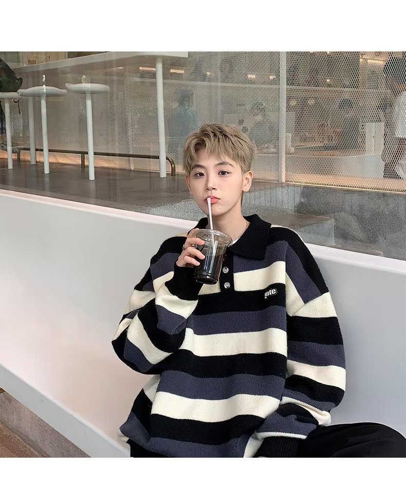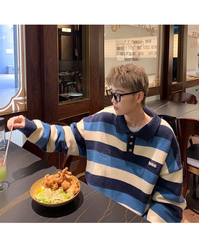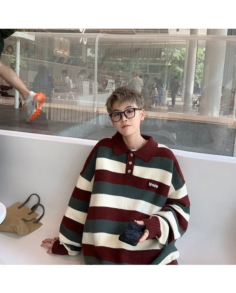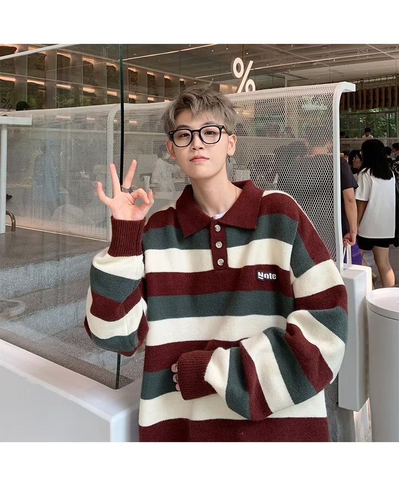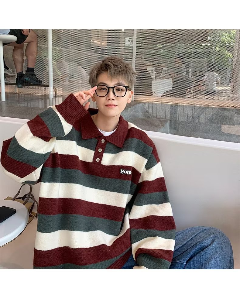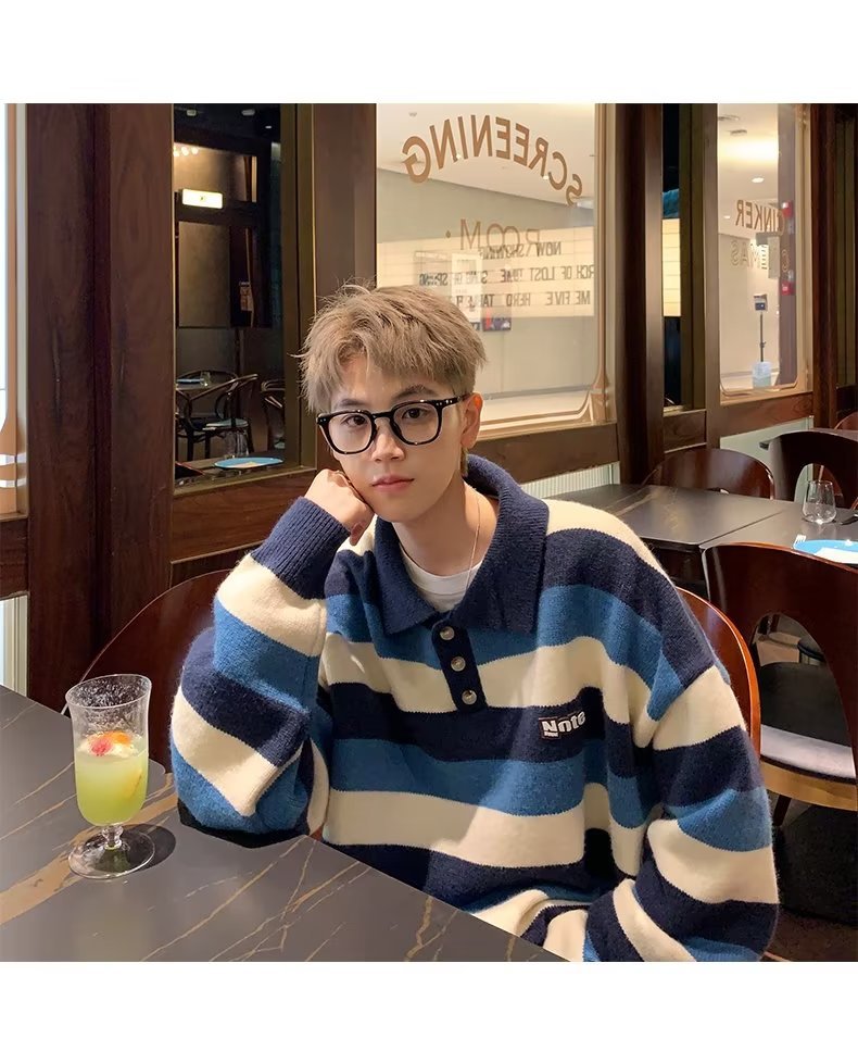 Advbridge Polo Collar Sweater Men Autumn Winter Harbor Wind Loose Fashion Trend Casual Striped Contrasting Color Sweater Coat With Sweater