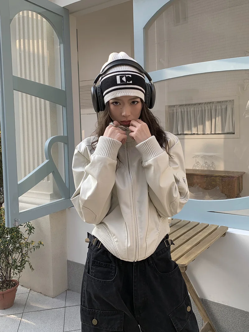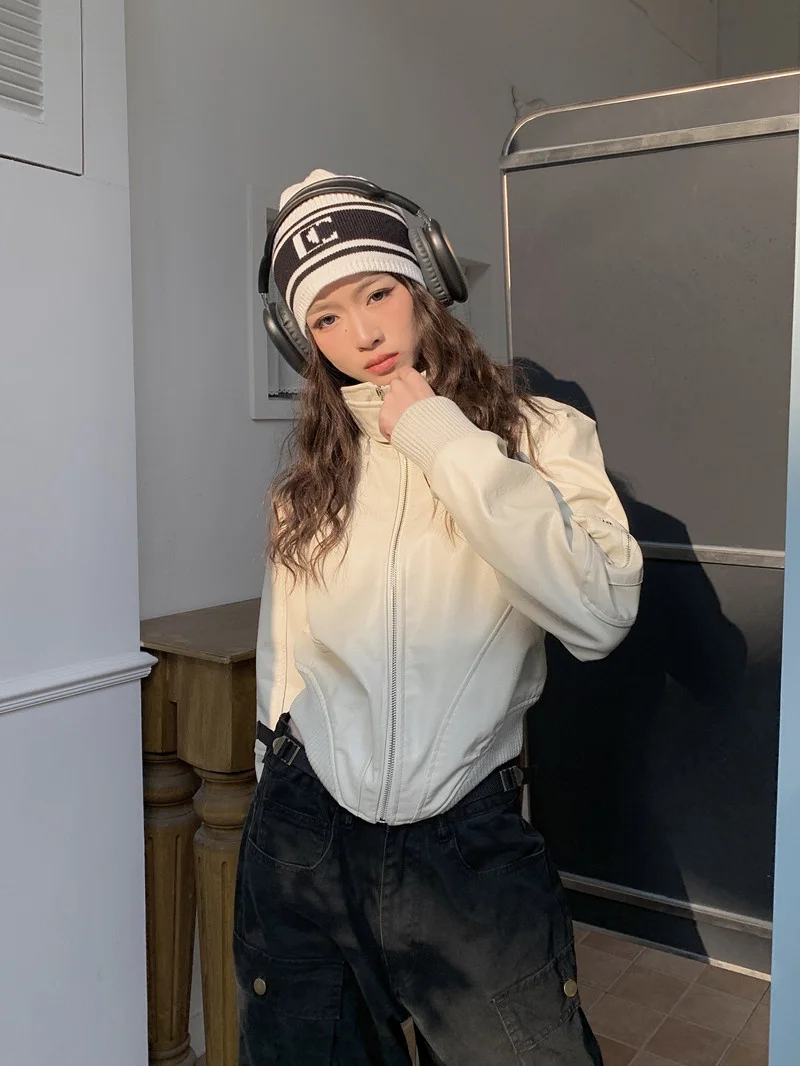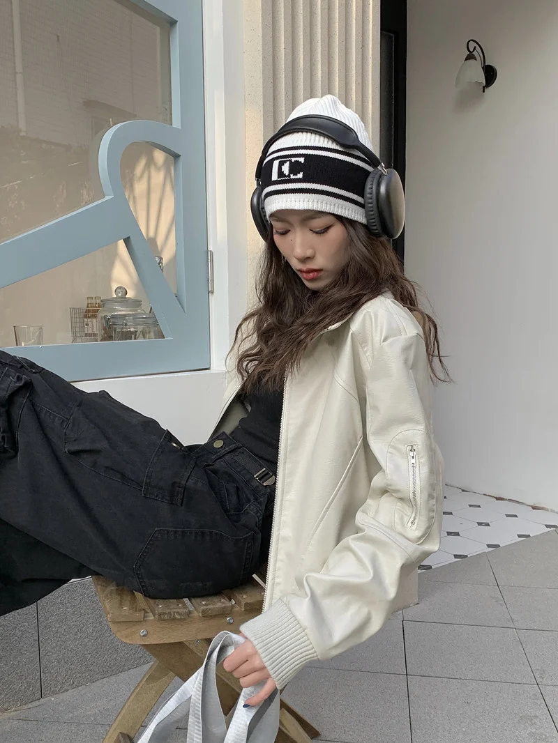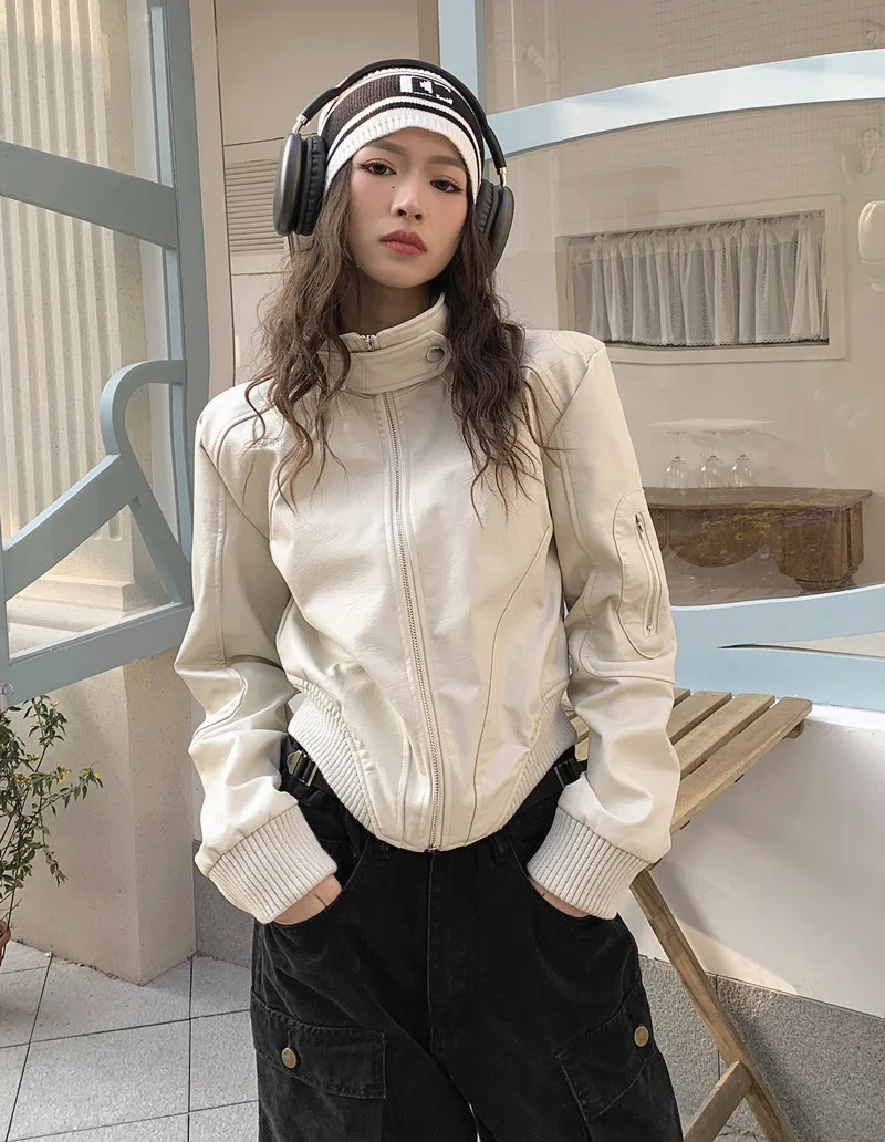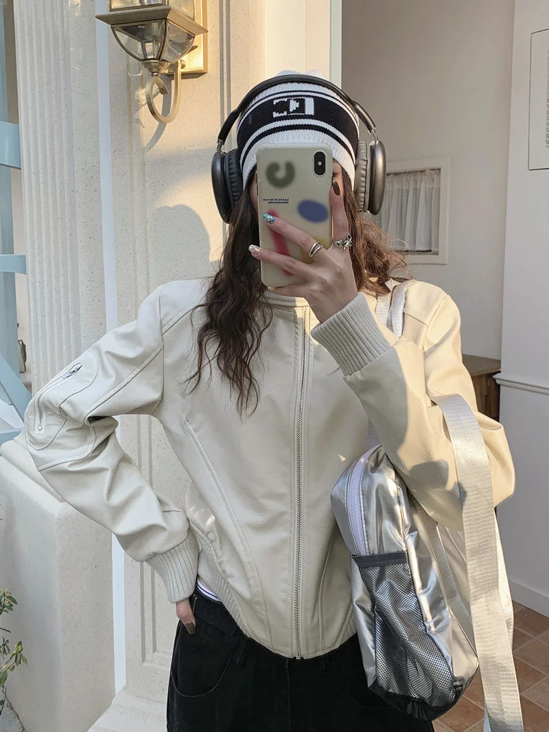 Stand Collar Zipper Woman Pu Jackets Loose Casual Motorcycle Jaquetas Retro Cropped White Leather Jackets Autumn 2023 New Coats