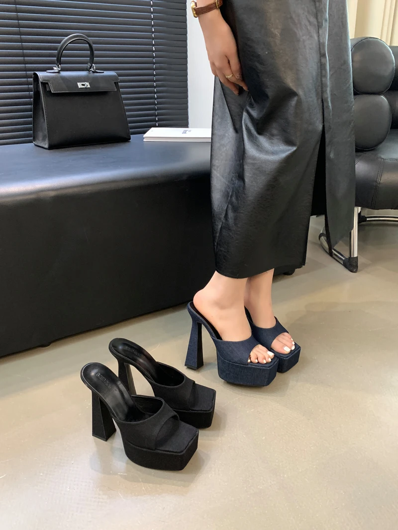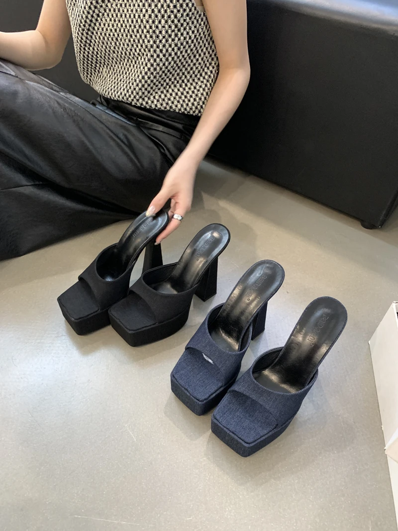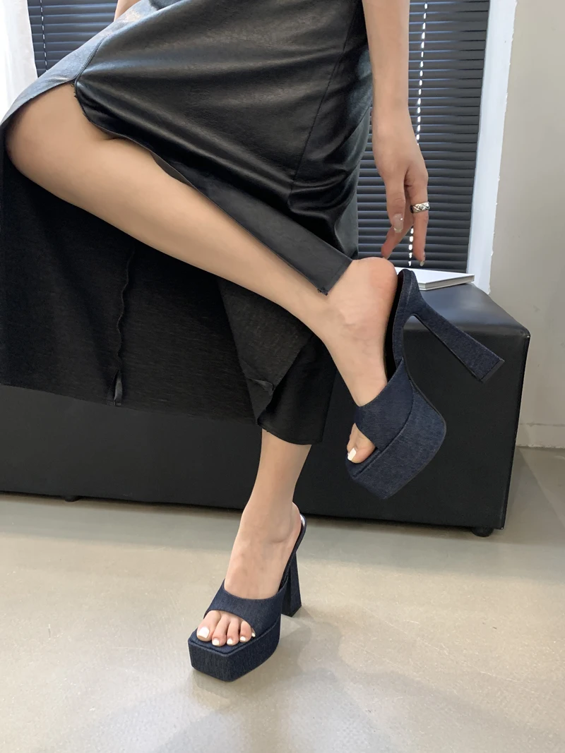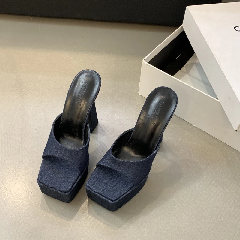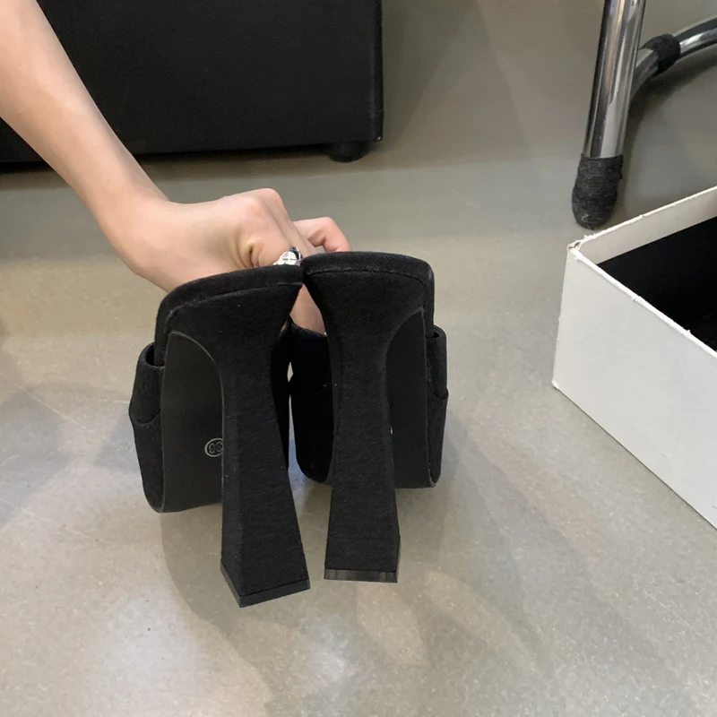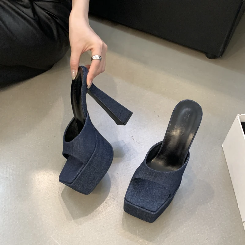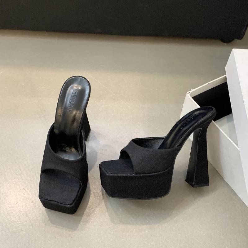 ADVBRIDGE - Blue Slippers 13cm Heeled Sandals Black Platform High Heels Summer Shoes Women Ladies Chunky Slippers Fashion Sandalias Mujer