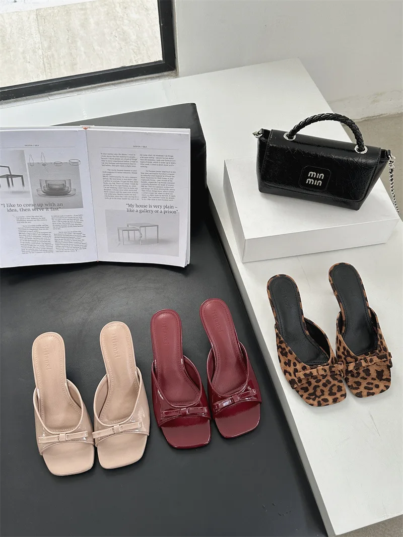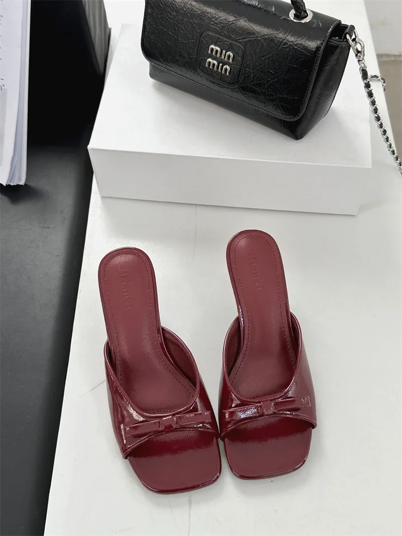 ADVBRIDGE - Cute Low Heel Slide Sandals Sexy Open Toe Patent Leather Bow Design Slippers Women Summer Sandals for Women Zapatillas De Casa