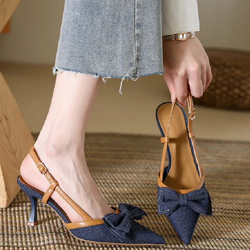 ADVBRIDGE - Denim Bow knot Women Sandals Pointed Toe Back Strap thin Heel Slide Sandals Summer Fashion Comfortable Buckle designer High Shoe