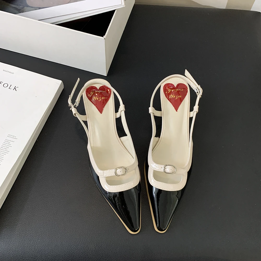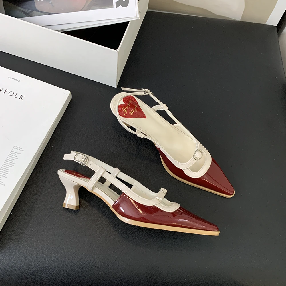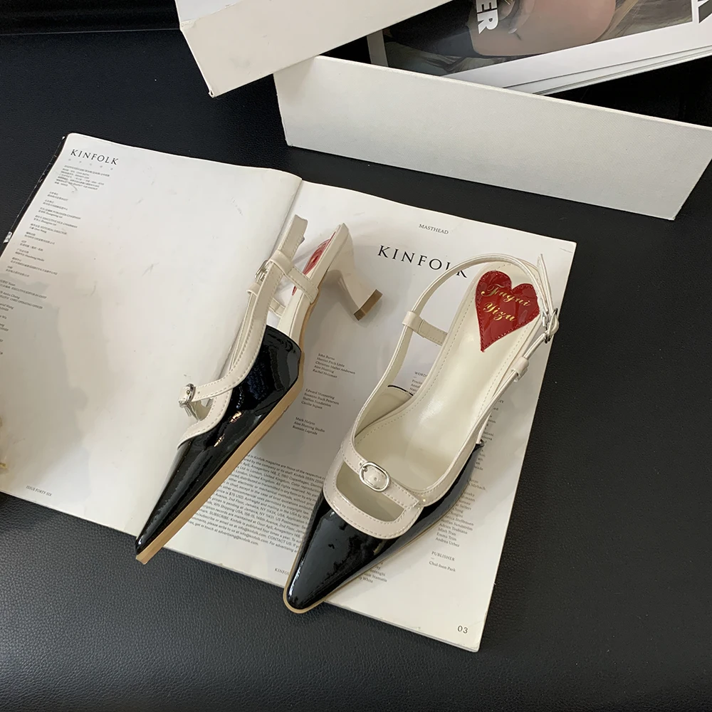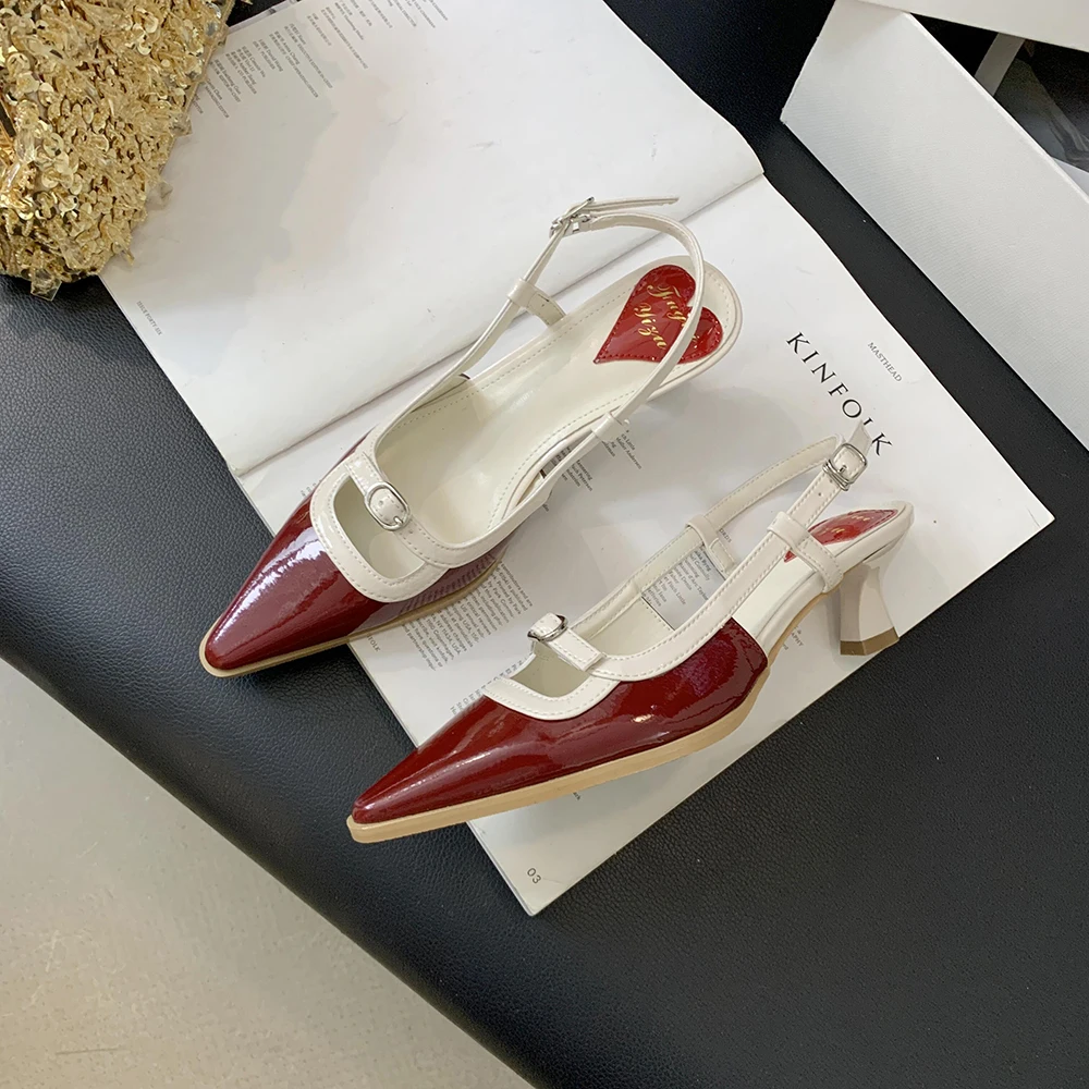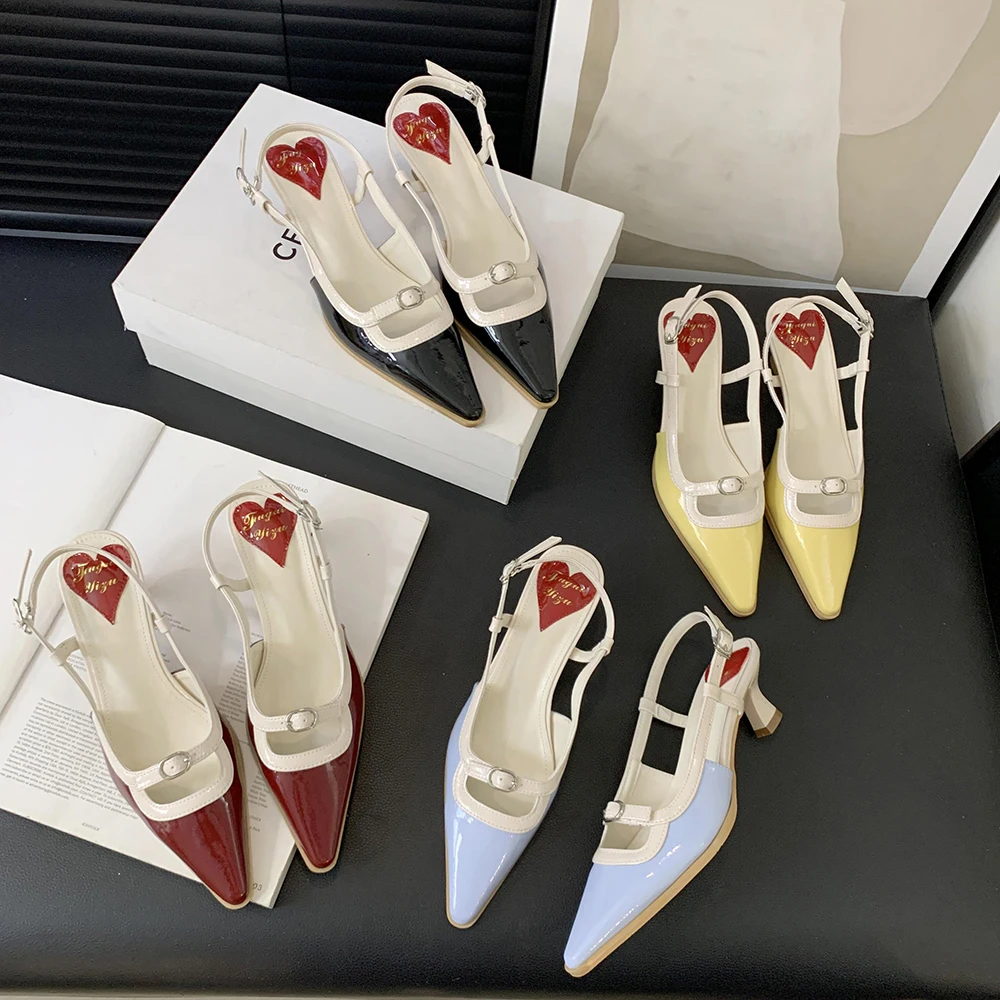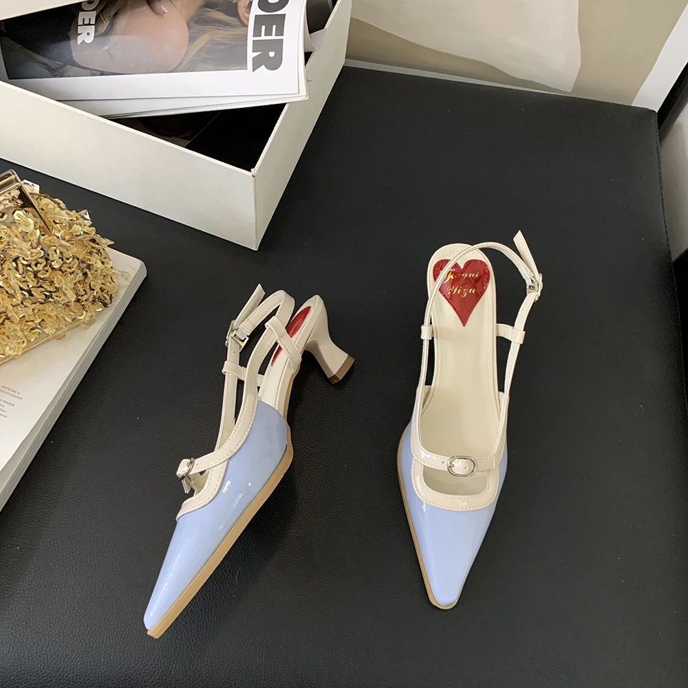 Advbridge Fashion Women Sandals Round Toe Summer Dress Shoes Thin Mid Heels Back Strap Patent Leather Belt Buckle Slides Mules Shoes 35-39