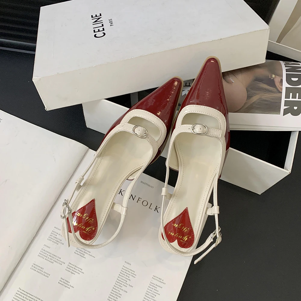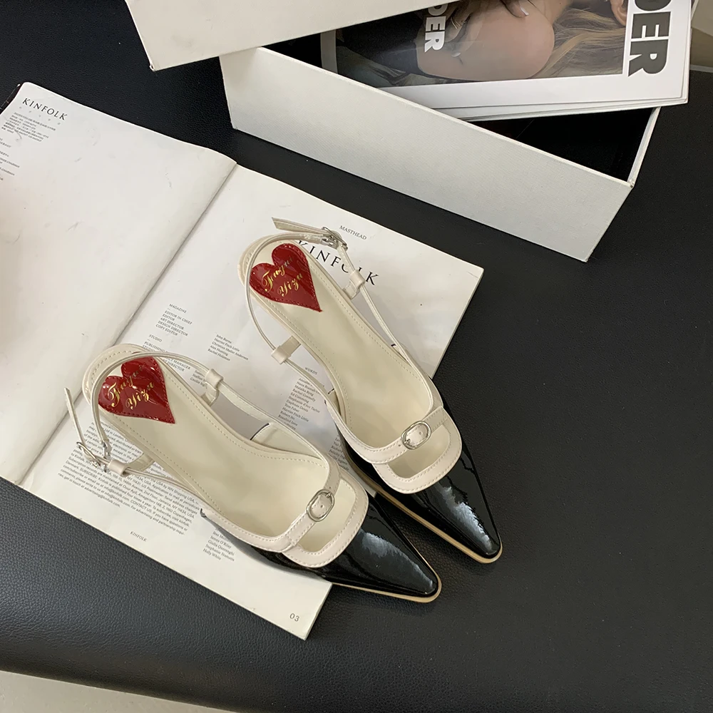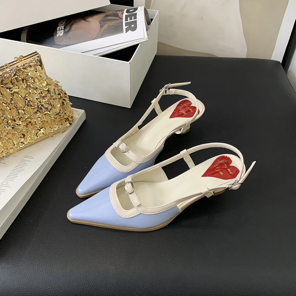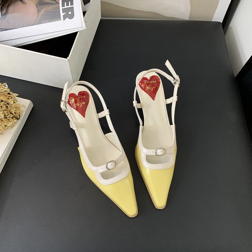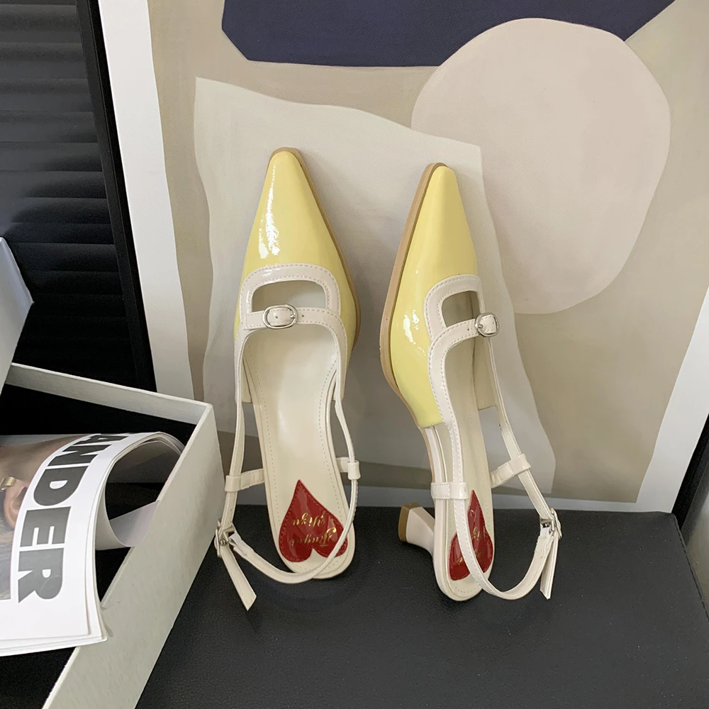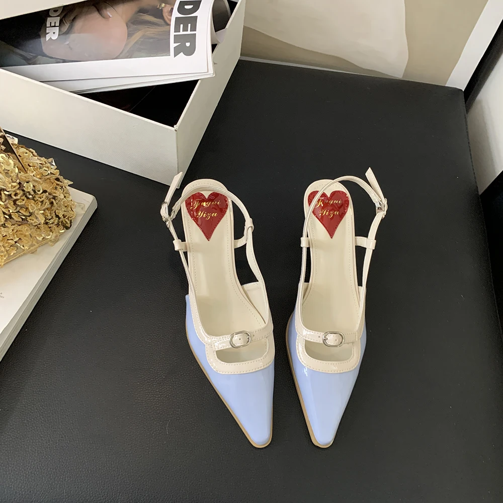 Advbridge Fashion Women Sandals Round Toe Summer Dress Shoes Thin Mid Heels Back Strap Patent Leather Belt Buckle Slides Mules Shoes 35-39