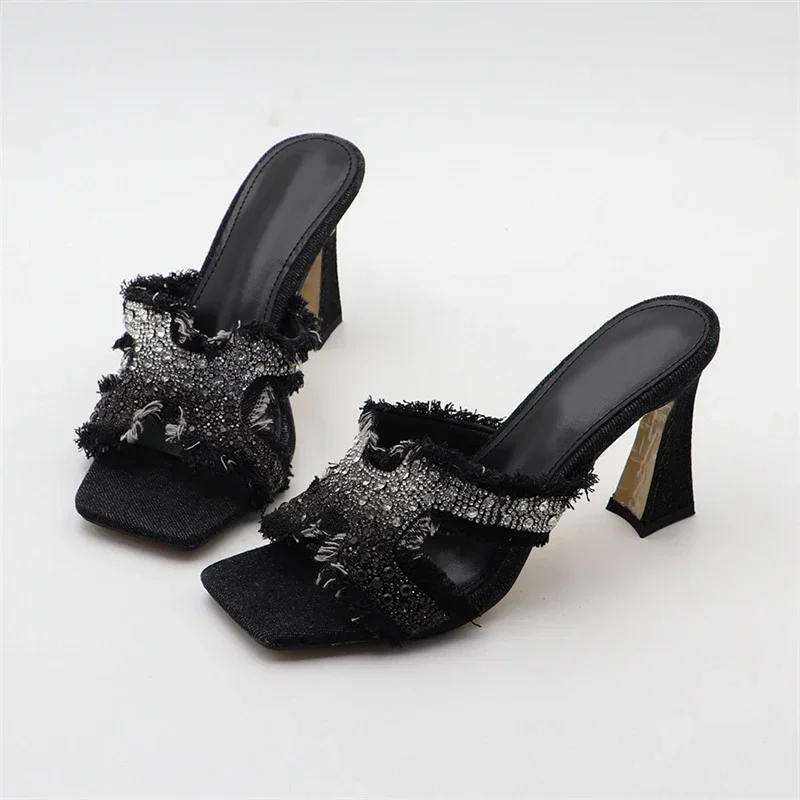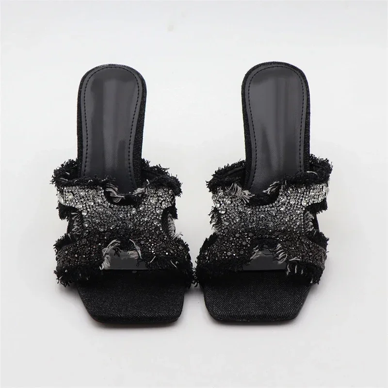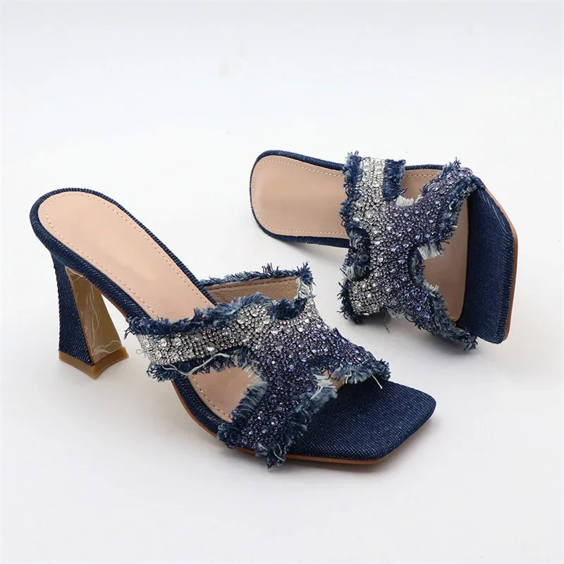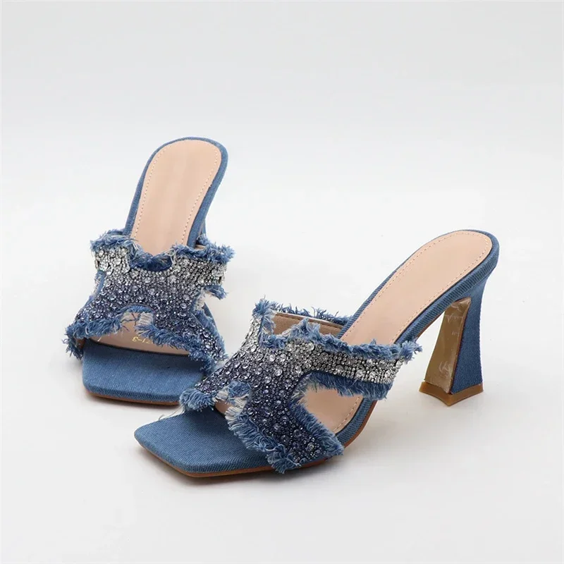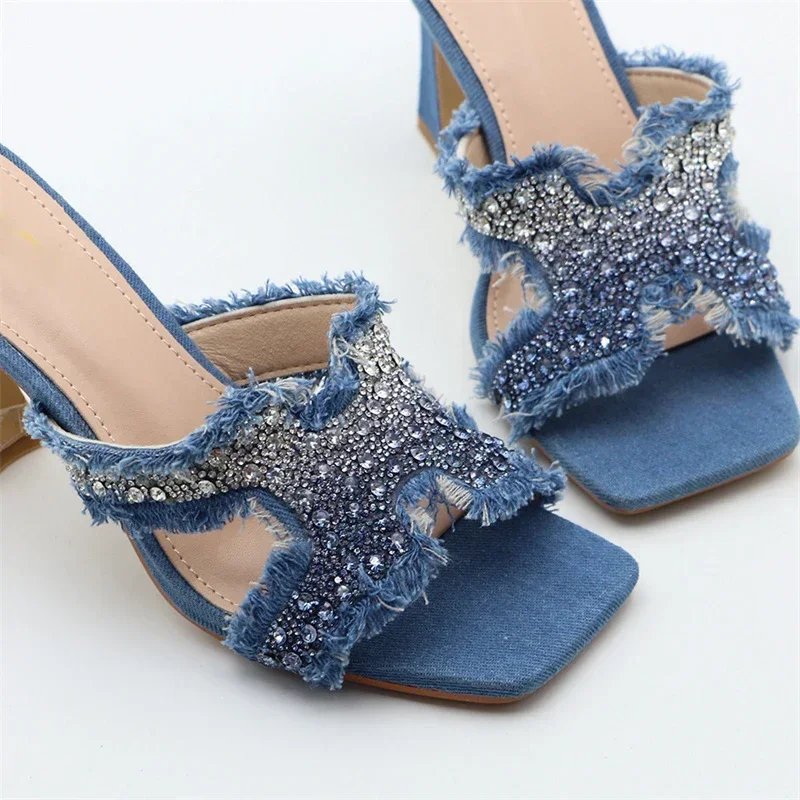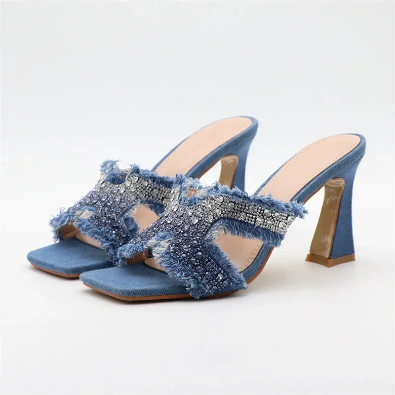 ADVBRIDGE - Luxury Design Crystal Rhinestone Women Slippers Sandal Blue Denim Summer 8CM Slides High Heels Sexy Square Toe Party Dress Shoes