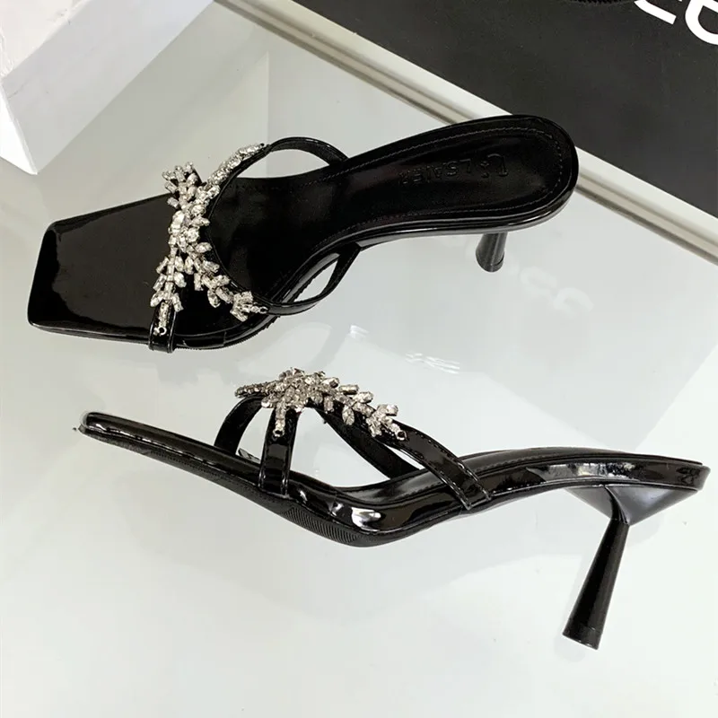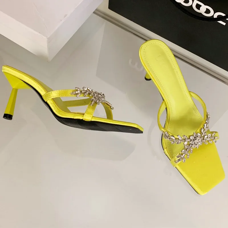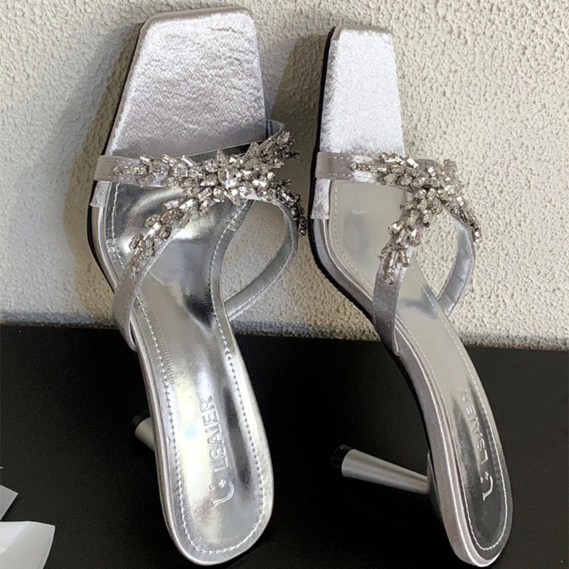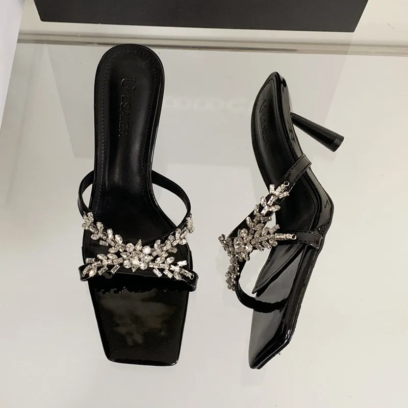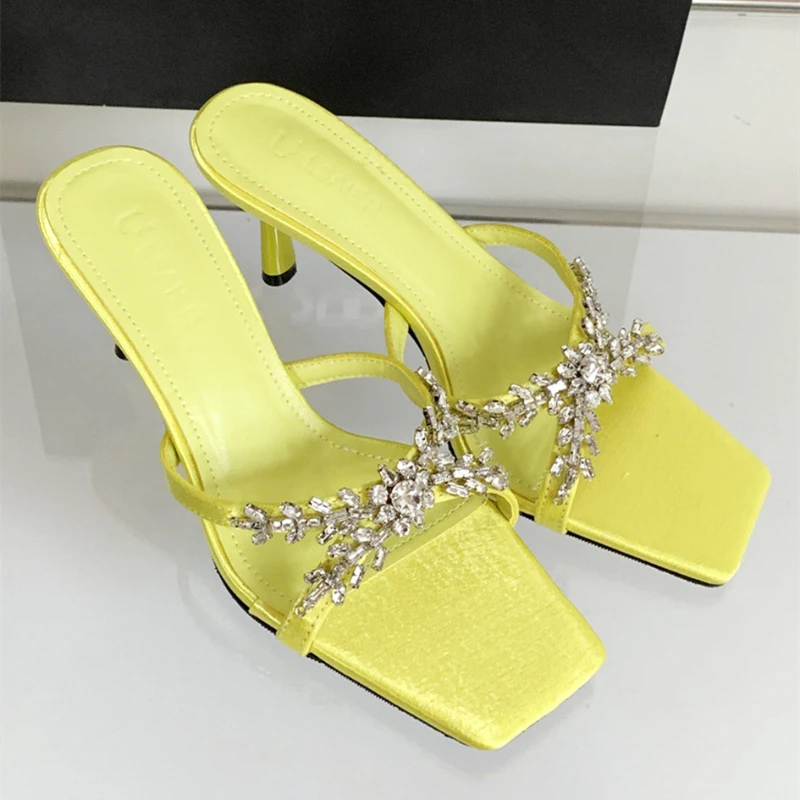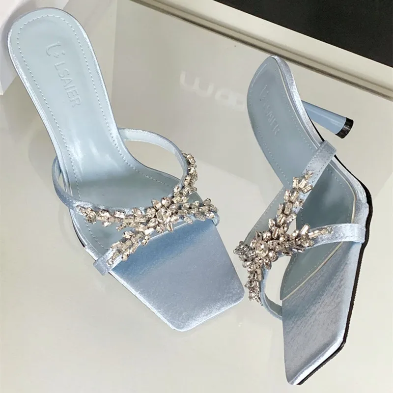 ADVBRIDGE - Luxury Rhinestone Open Toe Heeled Shoes Woman Satin Square Toe Designer Women Sandals Fashion Elegant Thin Heeled Slide Sandals