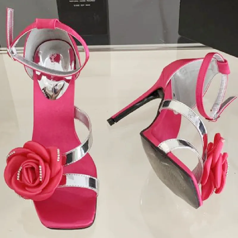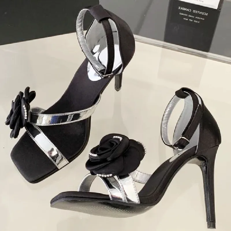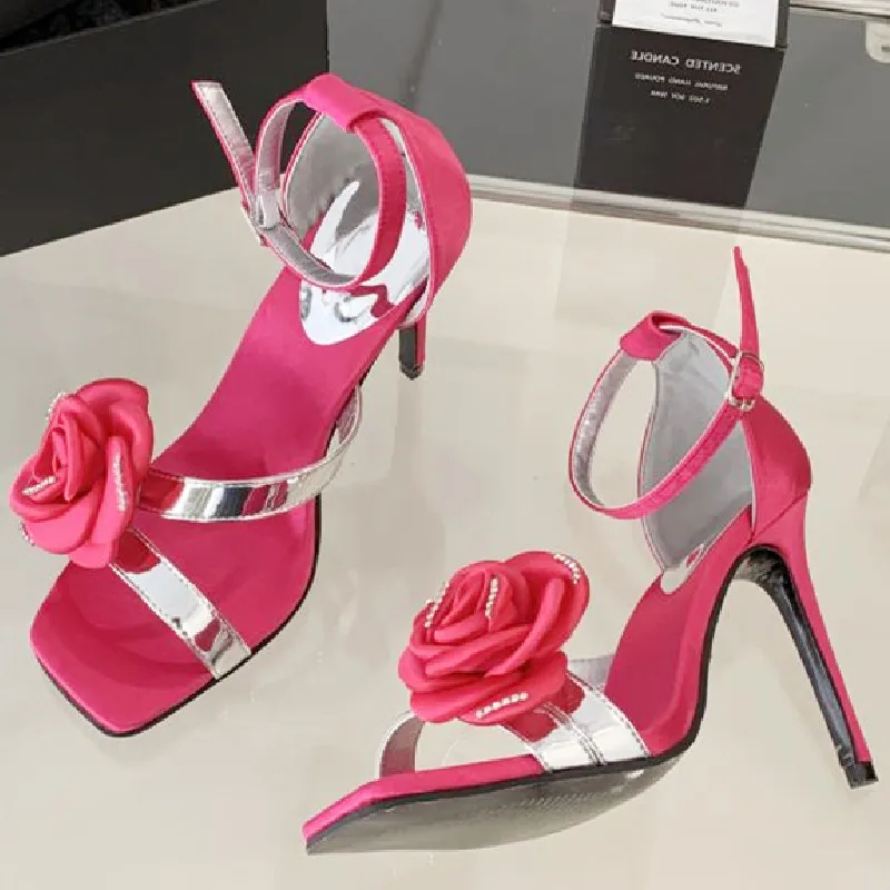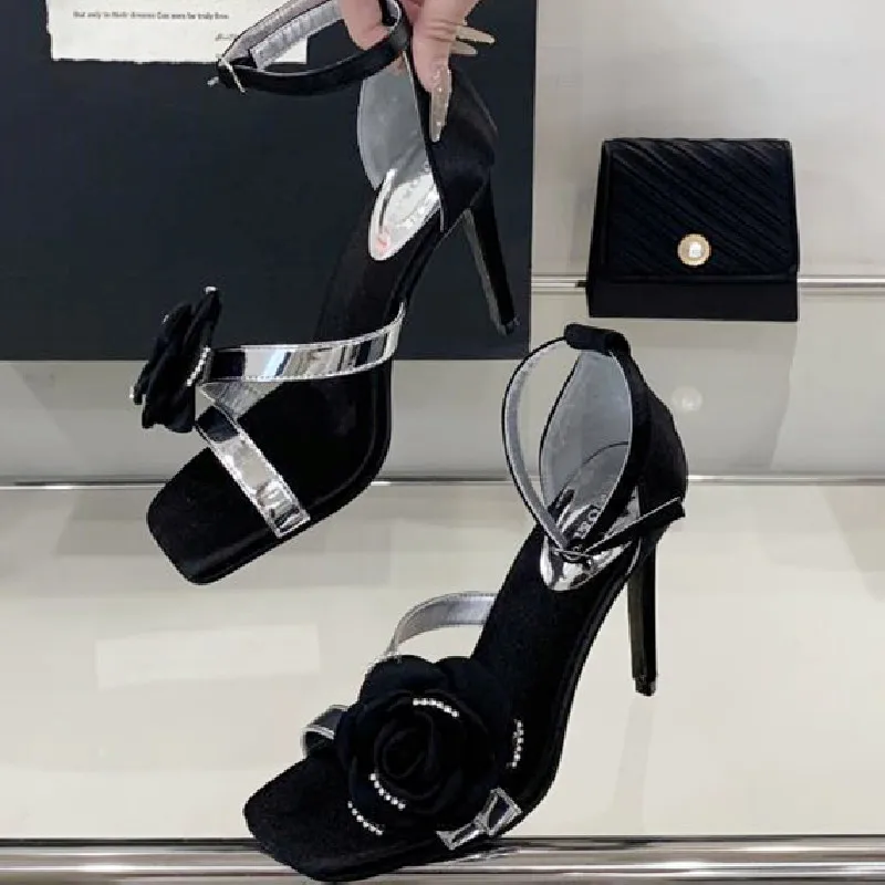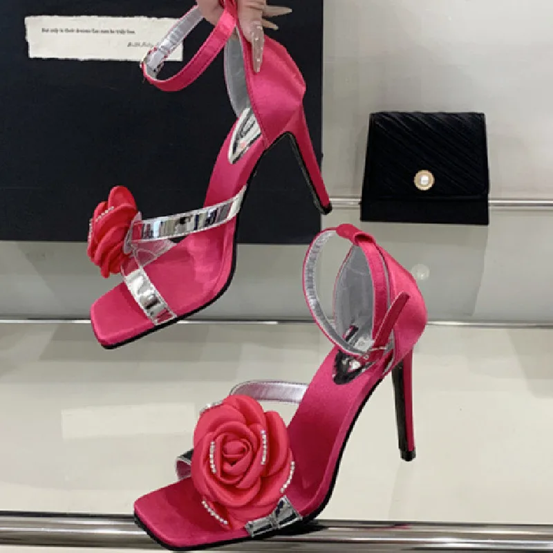 ADVBRIDGE - Luxury Rose Decoration Women Sandals Square Toe Belt Buckle Open Toe Heels Summer Fashion Ankle Strap Thin Heeled Slide Sandals