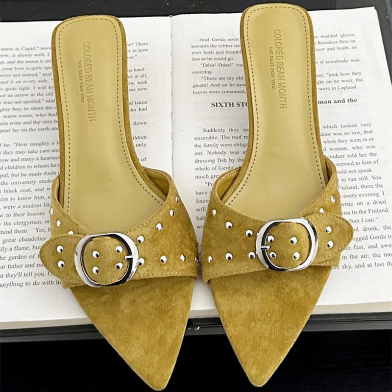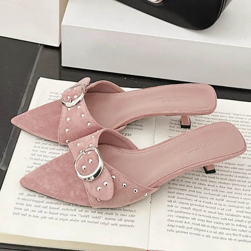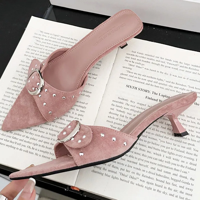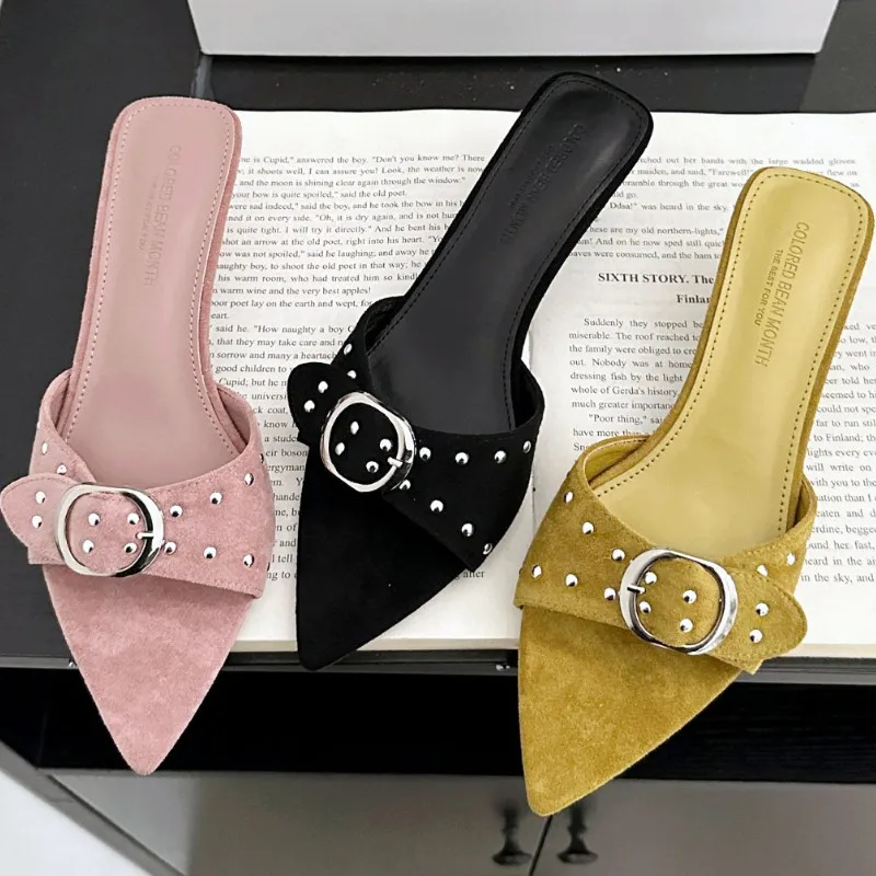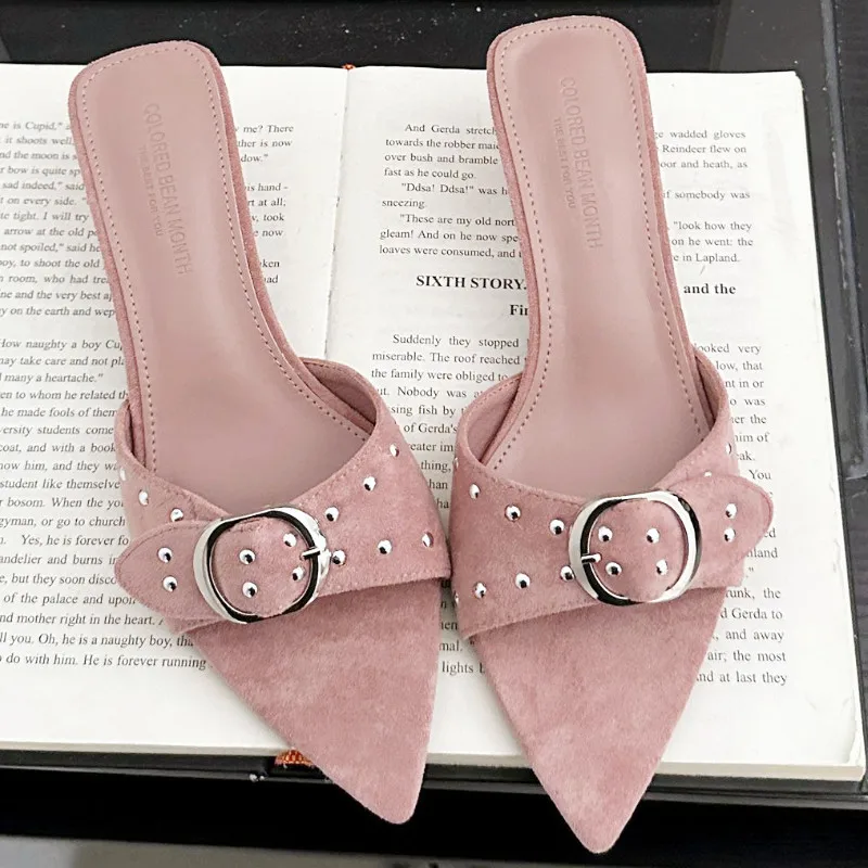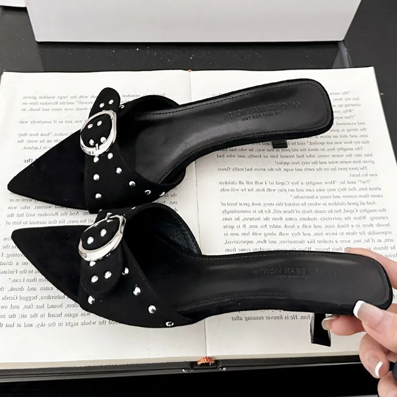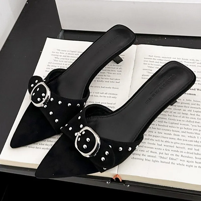 ADVBRIDGE - Metal Rivet Belt Buckle Open Toe Designer Shoes Fashion Satin Pointed Toe Women Sandals Simple Comfort Thin Heel Slide Sandals