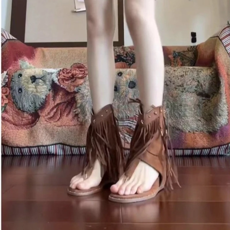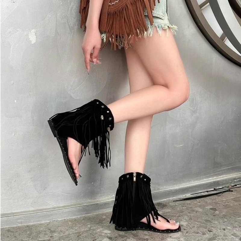 ADVBRIDGE - New fashion tassel rivets bohemian Roman sandals boots inner height clip toe Roman sandals