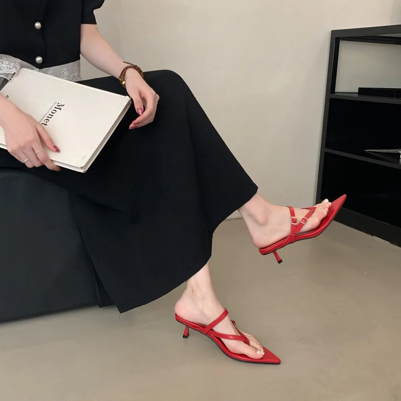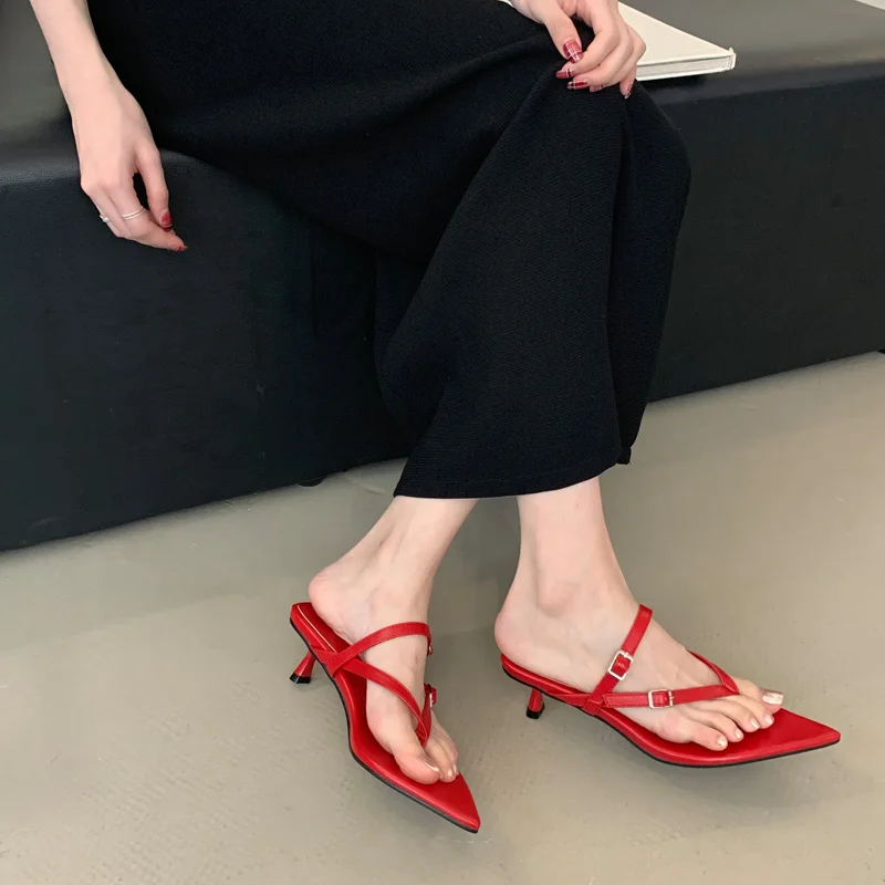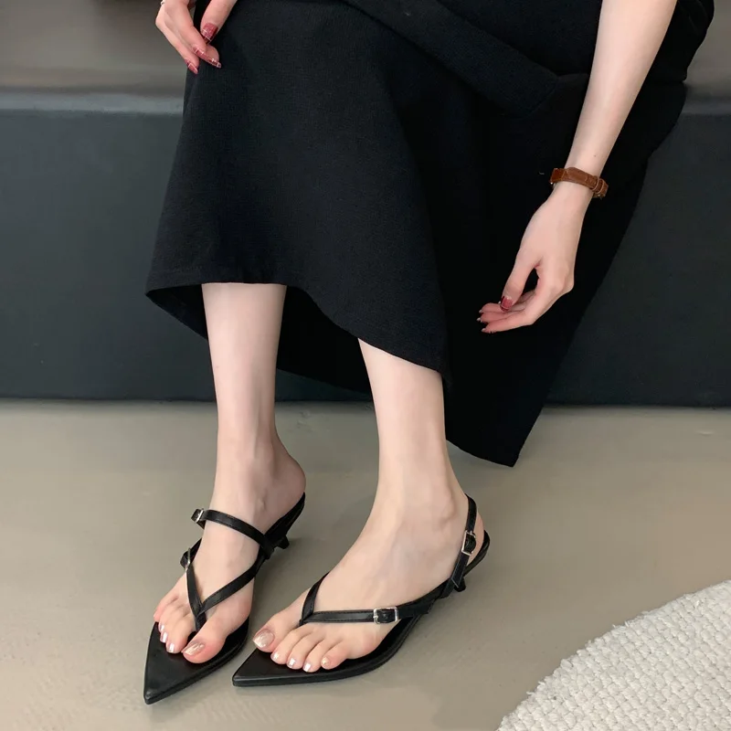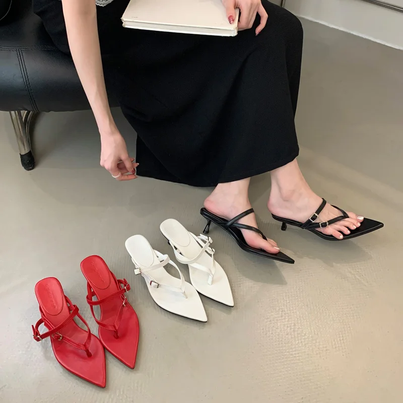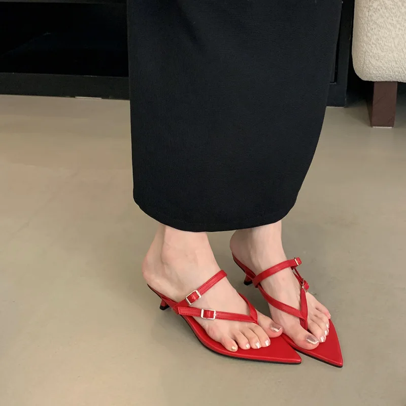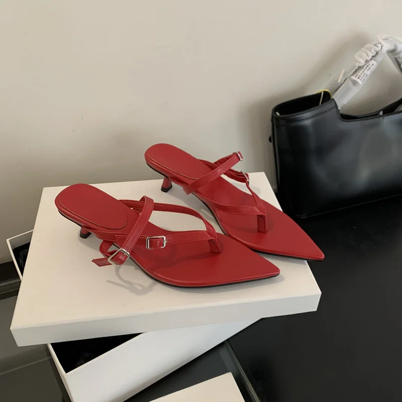 ADVBRIDGE - Red Thong Heeled Sandals Woman Low Heels Sandals Black Pointed Toe Belt Buckle Summer Shoes Comfort Sandalias De Mujer Verano