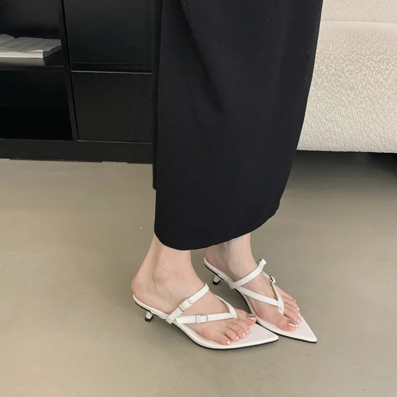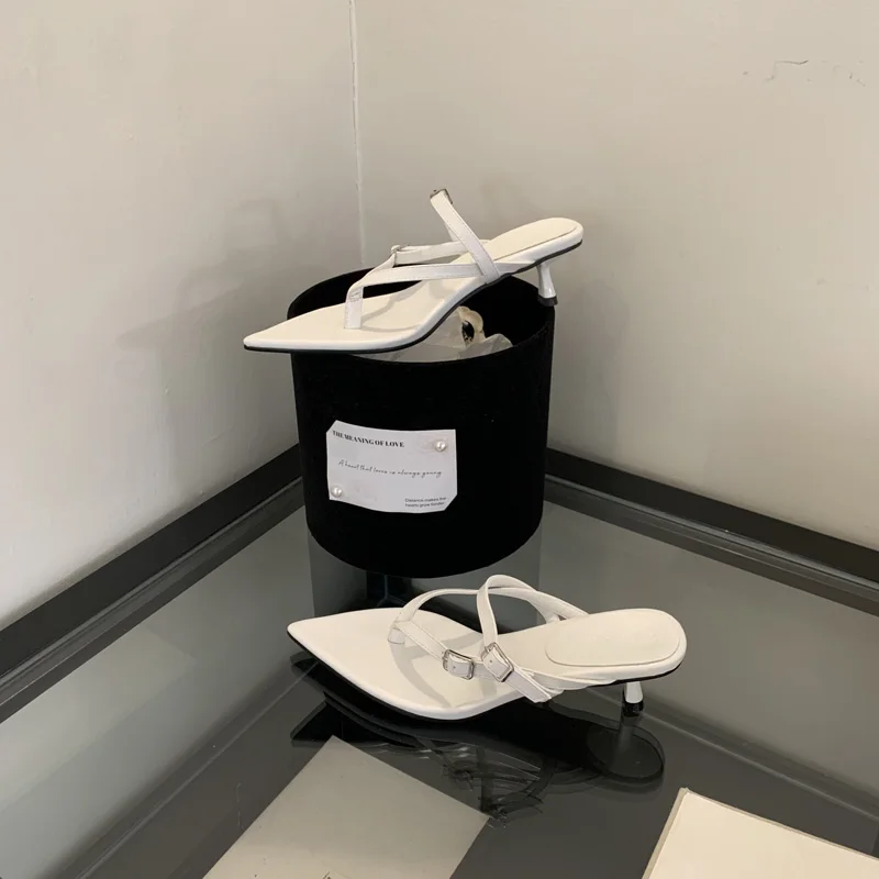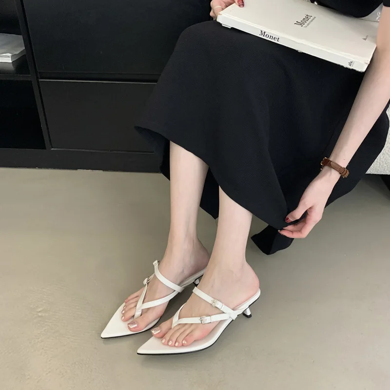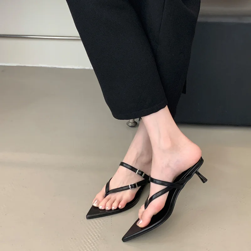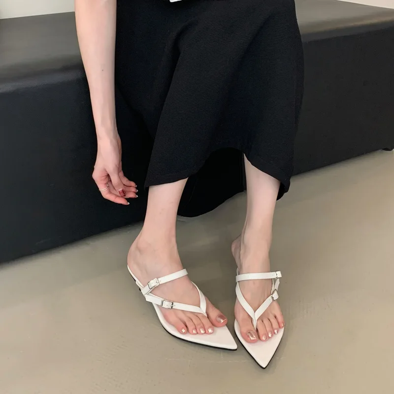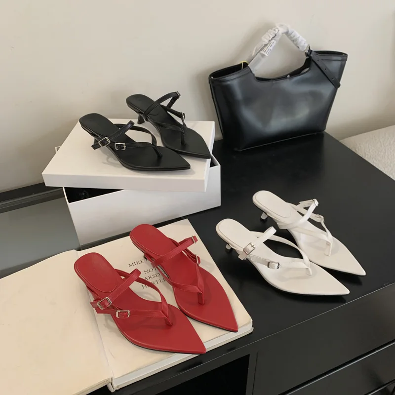 ADVBRIDGE - Red Thong Heeled Sandals Woman Low Heels Sandals Black Pointed Toe Belt Buckle Summer Shoes Comfort Sandalias De Mujer Verano