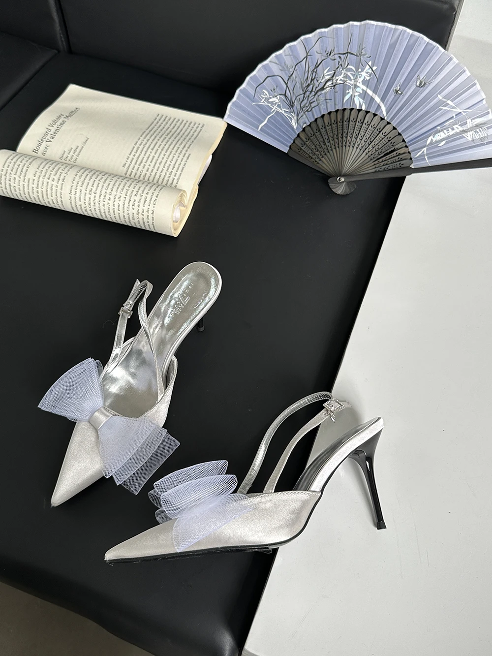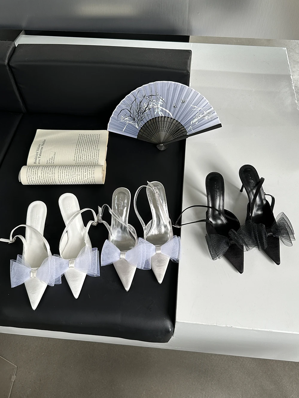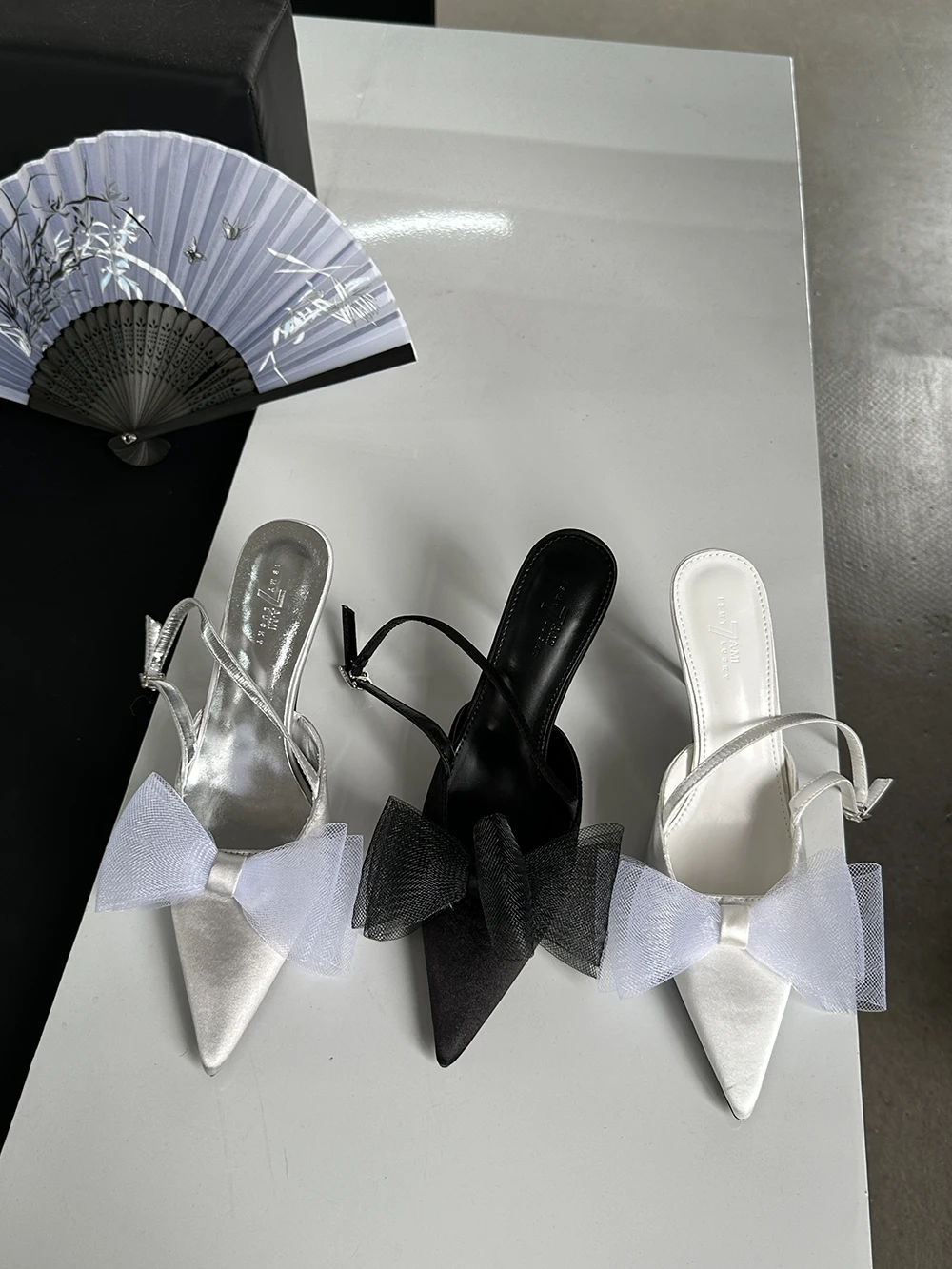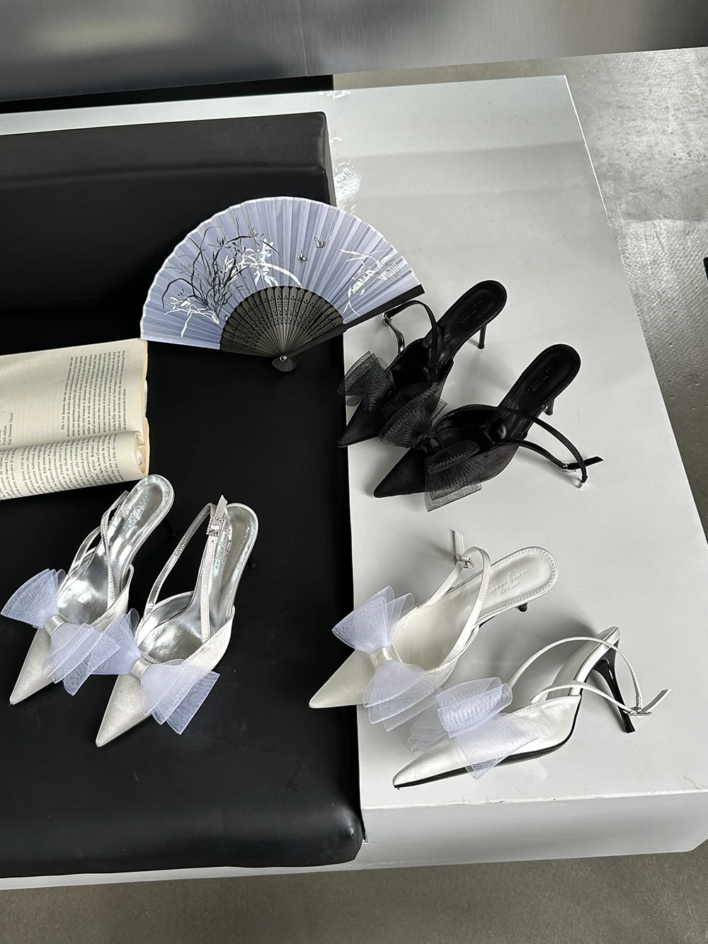 Advbridge Sexy Women Sandals Pointed Toe Summer Dress Shoes Black White Silver Back Strap Bow Design Size 35-39 Thin High Heels Sandals