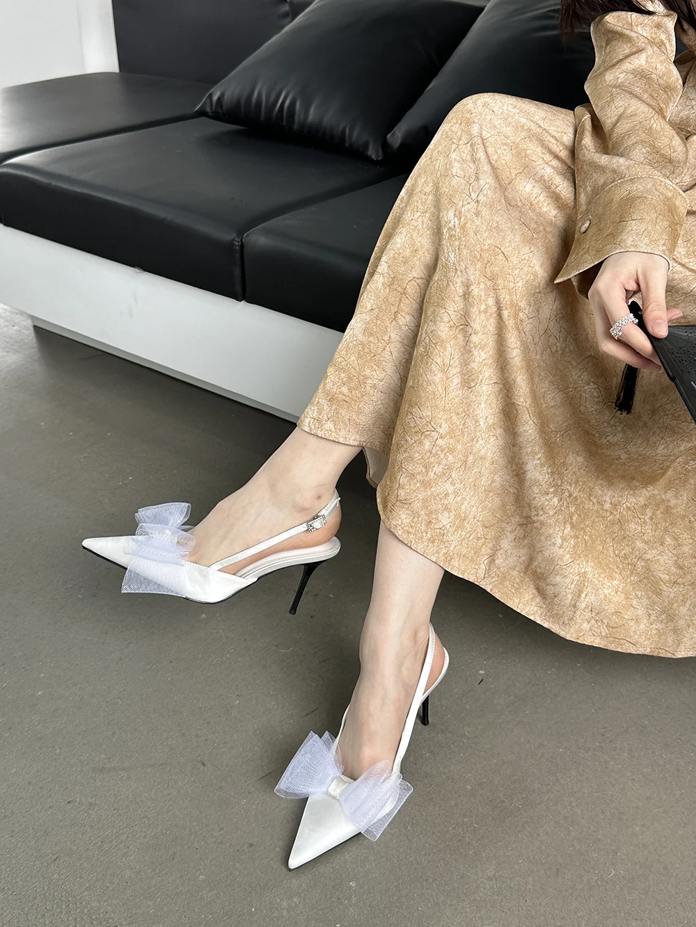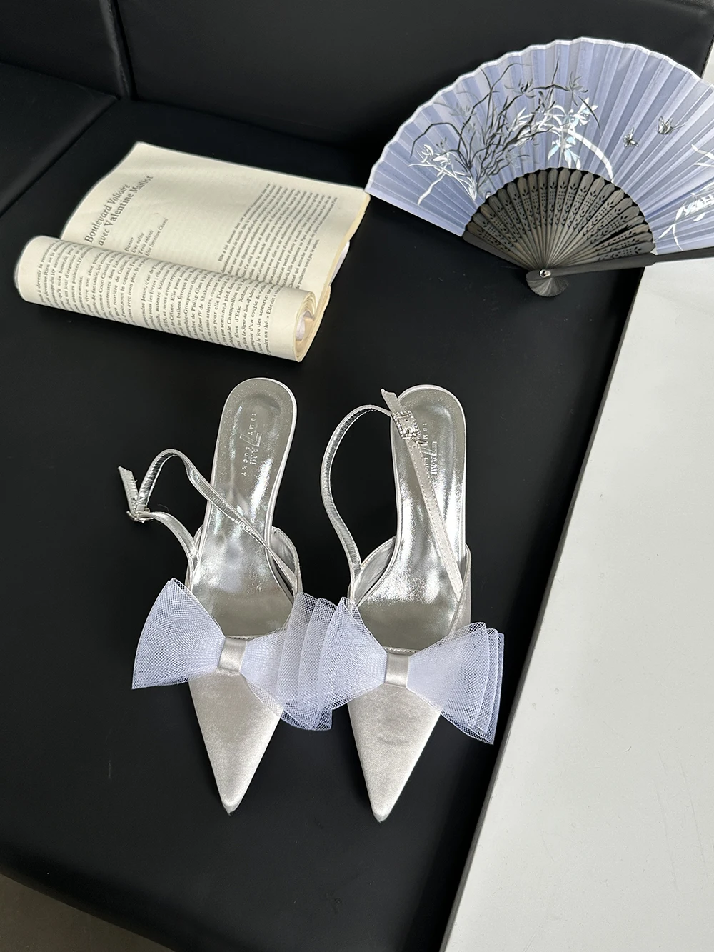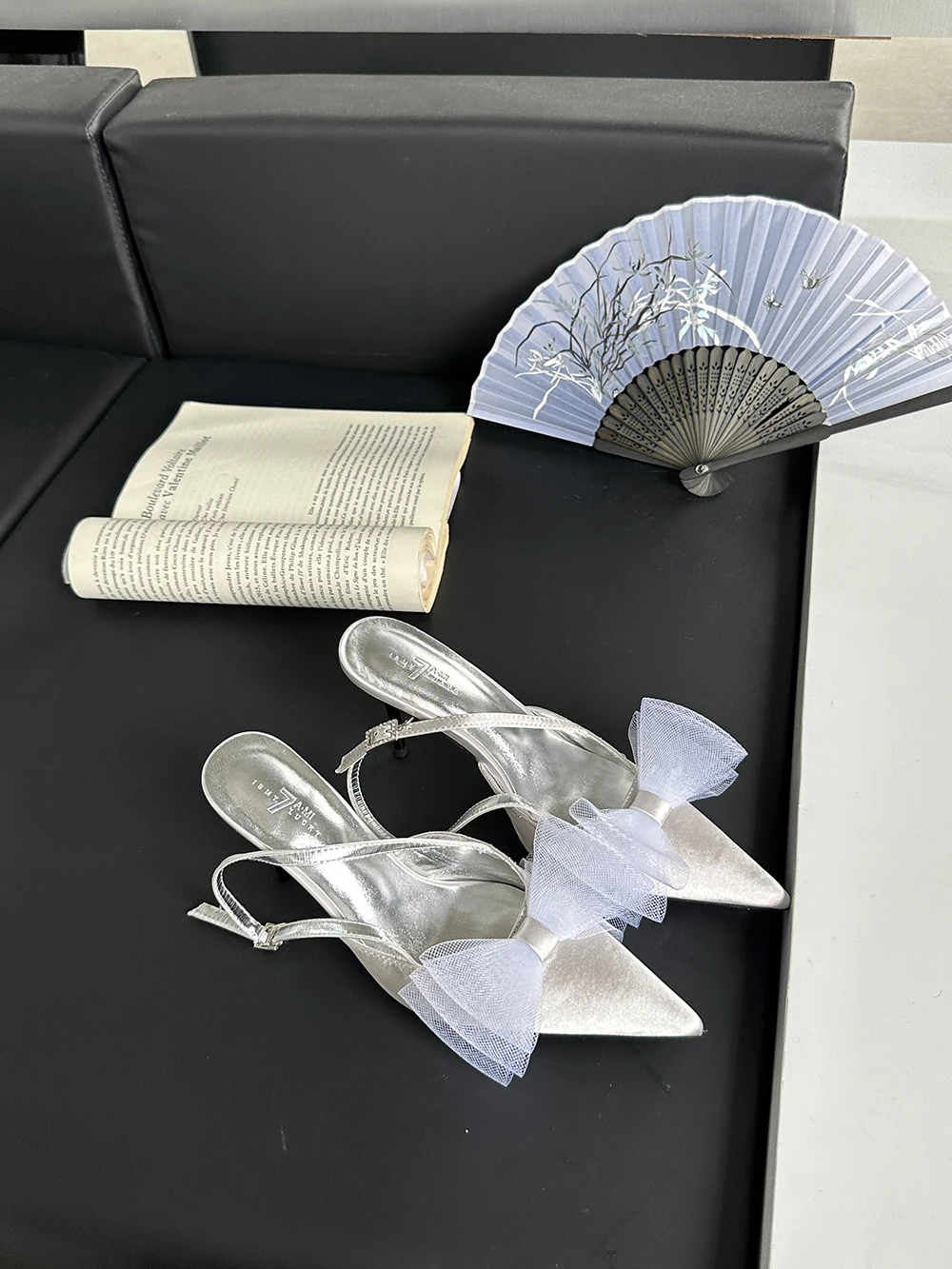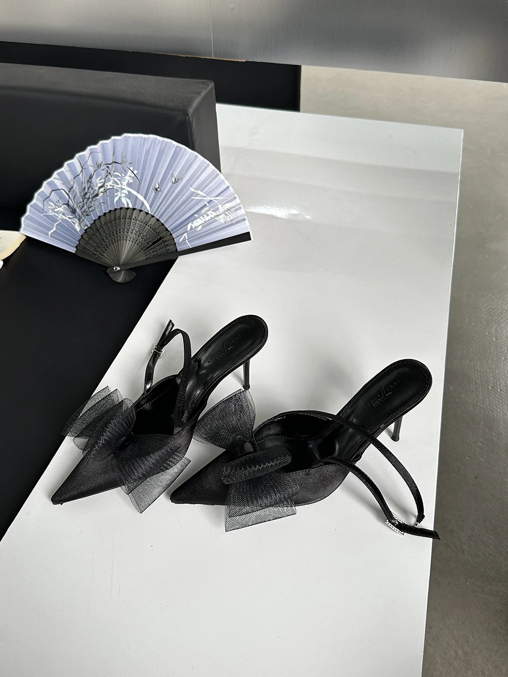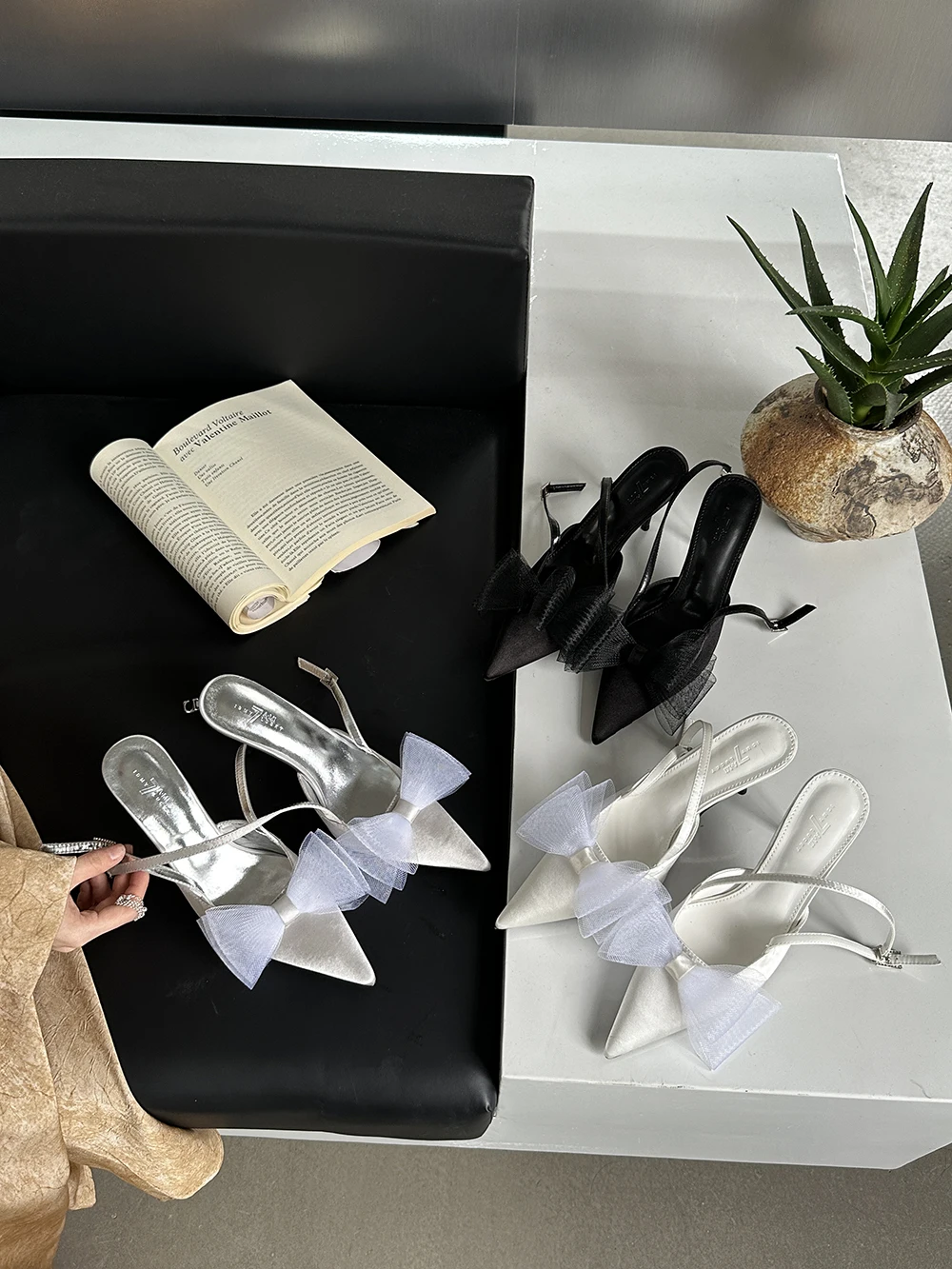 Advbridge Sexy Women Sandals Pointed Toe Summer Dress Shoes Black White Silver Back Strap Bow Design Size 35-39 Thin High Heels Sandals