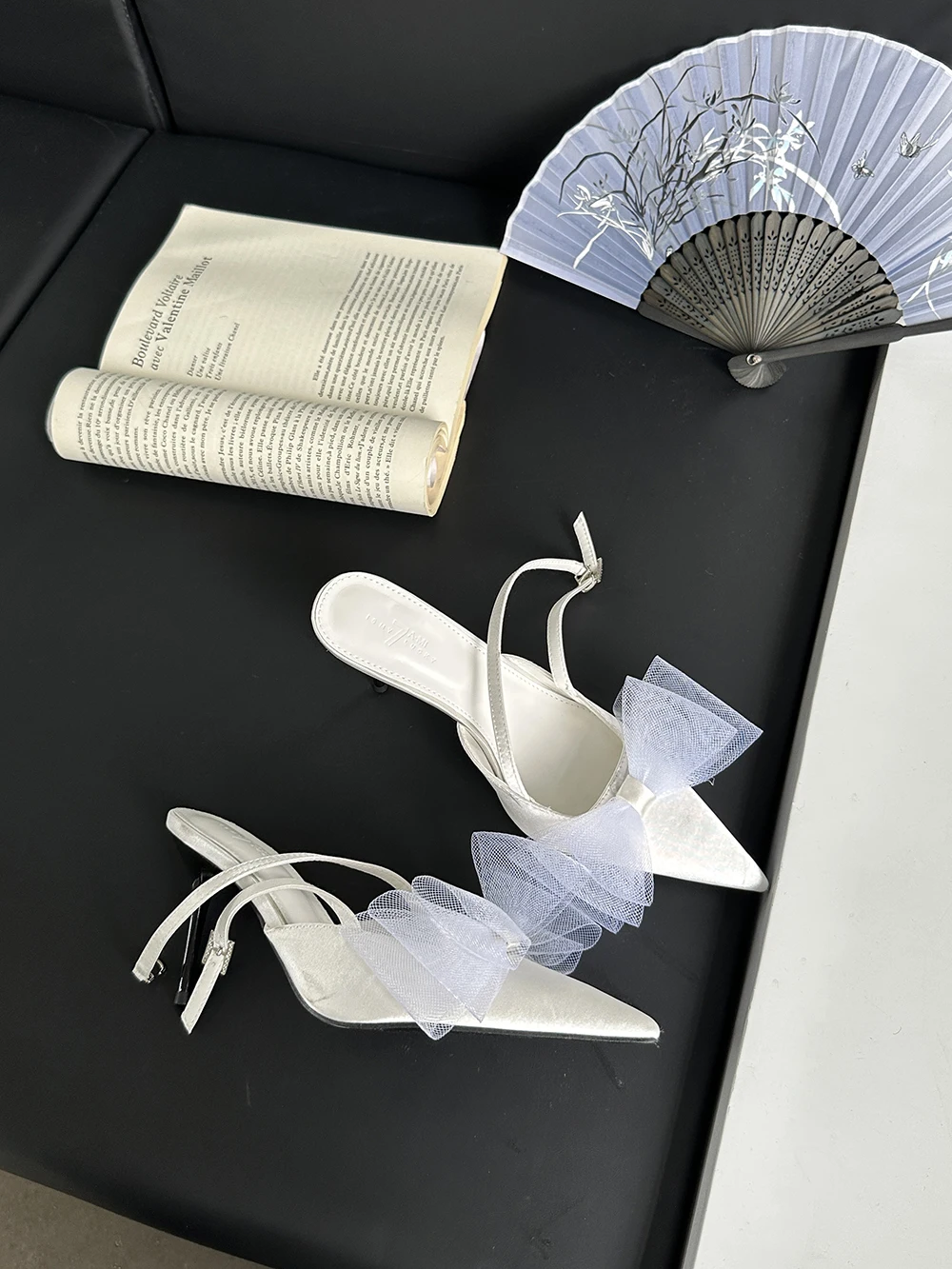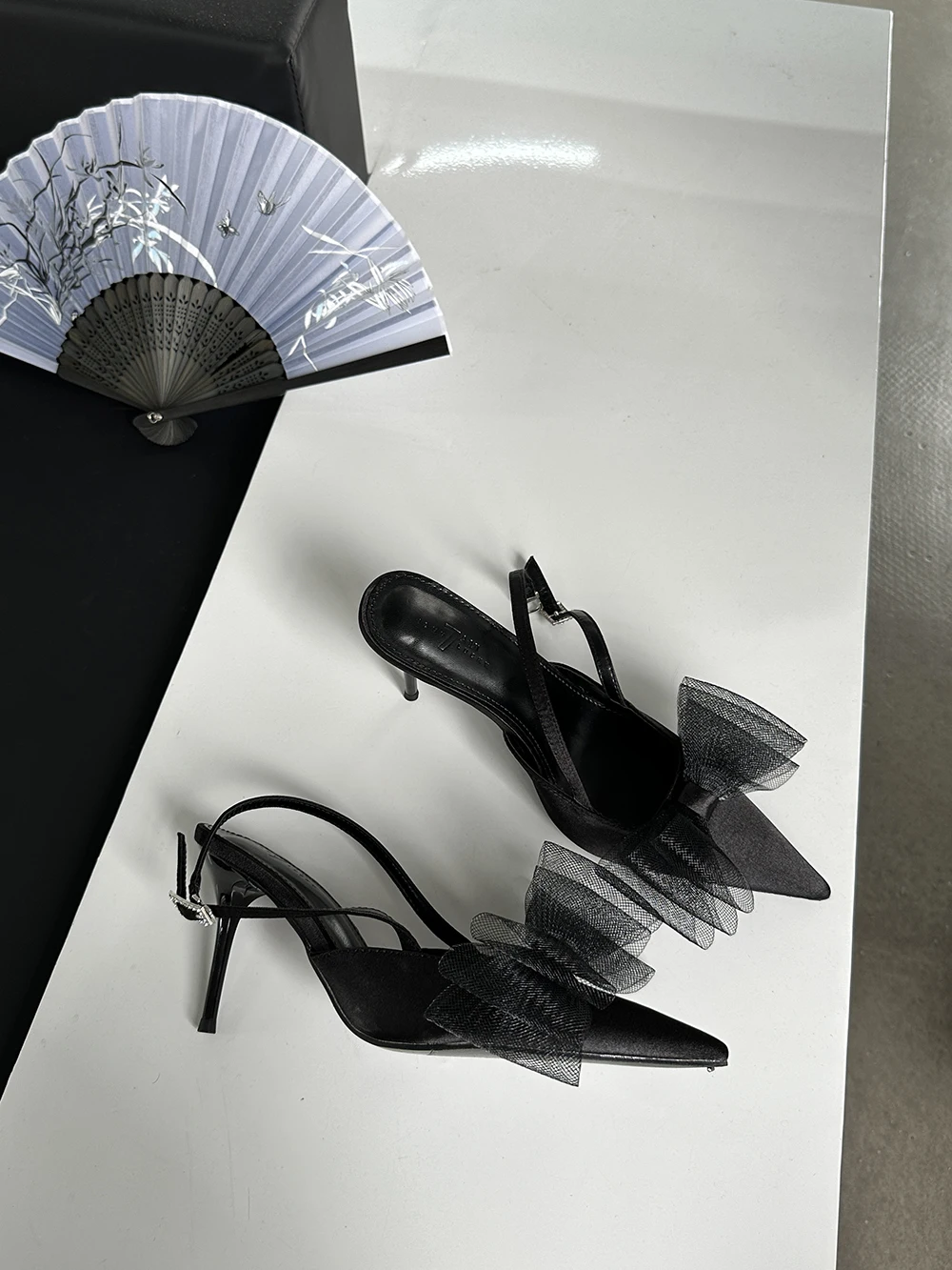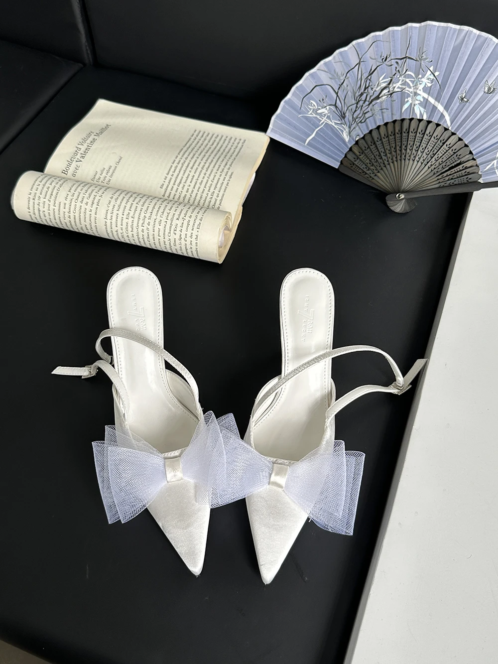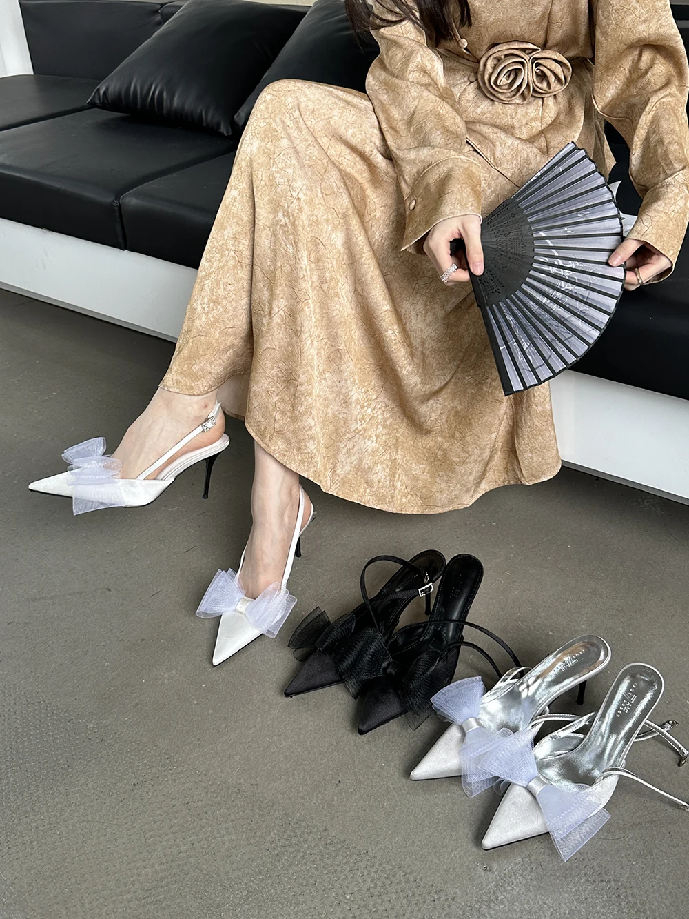 Advbridge Sexy Women Sandals Pointed Toe Summer Dress Shoes Black White Silver Back Strap Bow Design Size 35-39 Thin High Heels Sandals