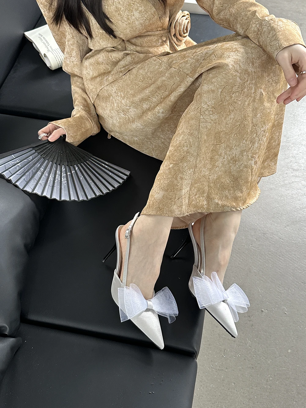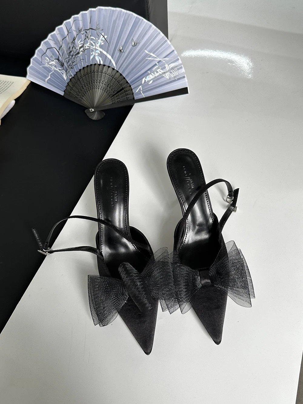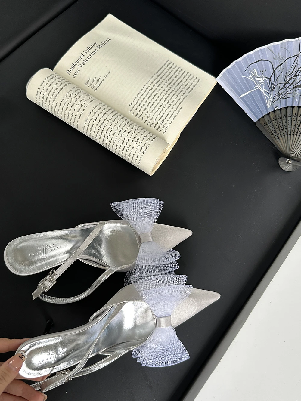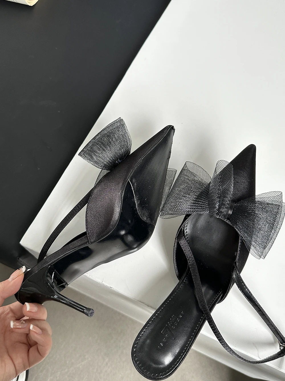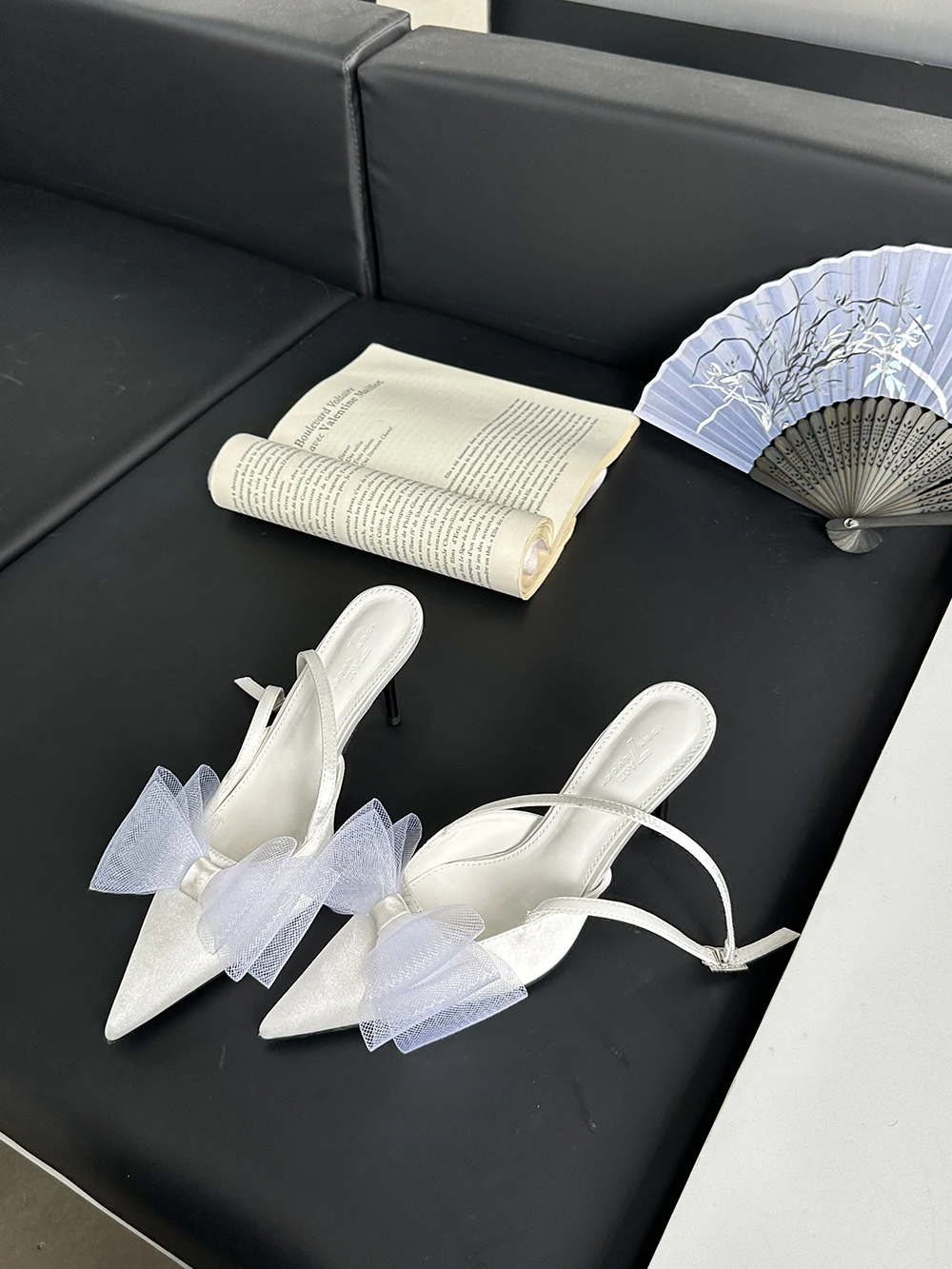 Advbridge Sexy Women Sandals Pointed Toe Summer Dress Shoes Black White Silver Back Strap Bow Design Size 35-39 Thin High Heels Sandals