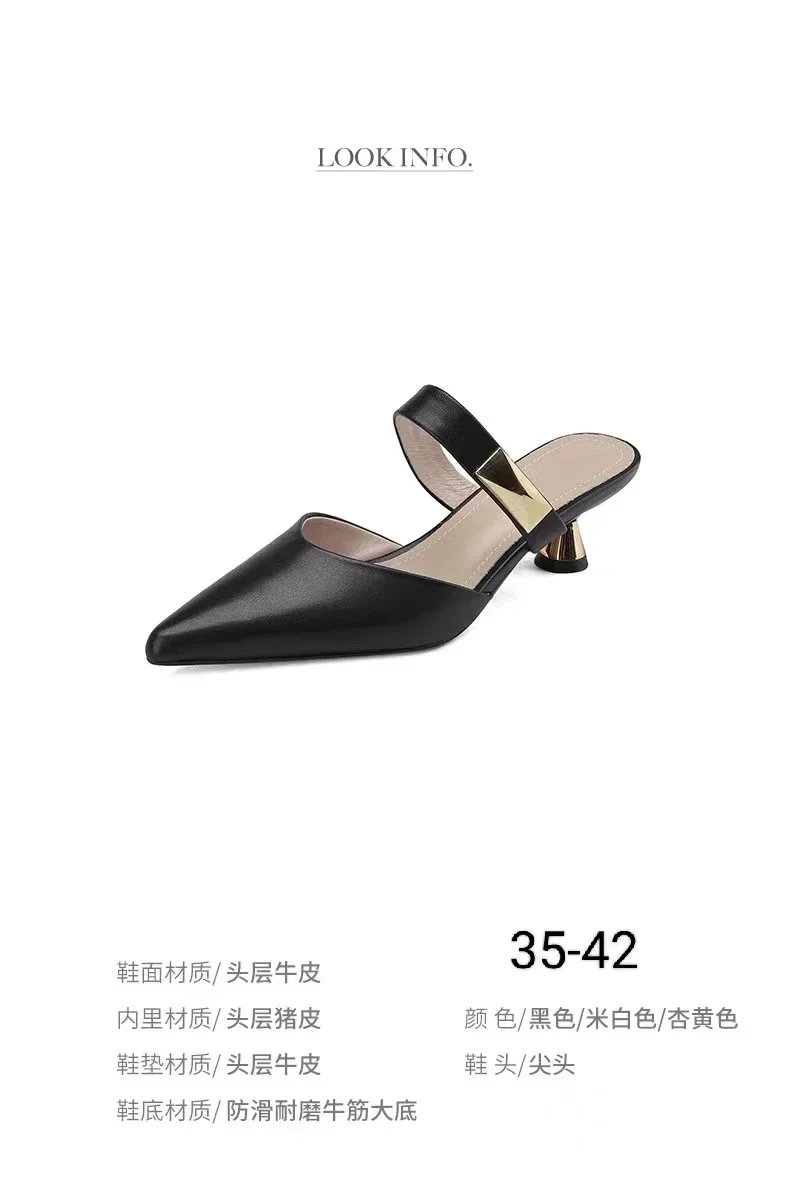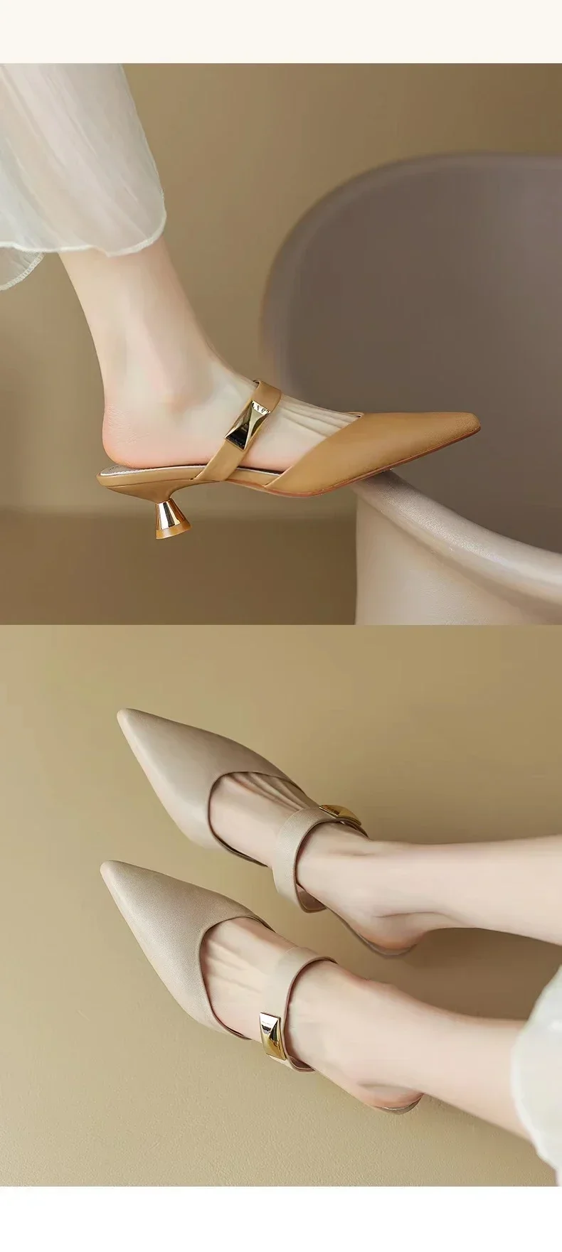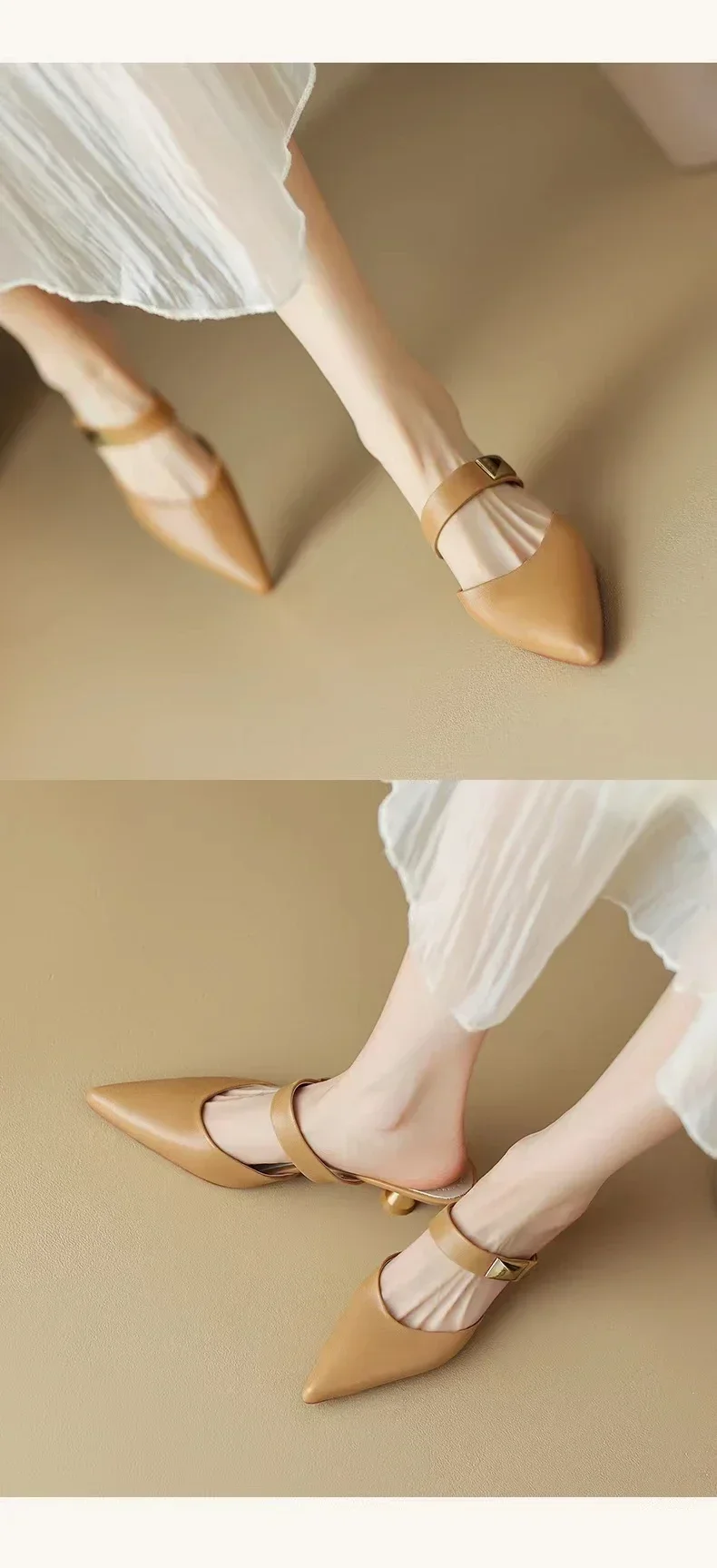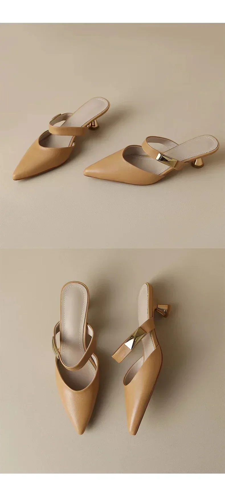 Advbridge Size 35-42 Women Kitten Heels Mules Golden Rivet Pointed Toe Summer Sandals Fashion Beige Ladies Casual Med Heels Shoes